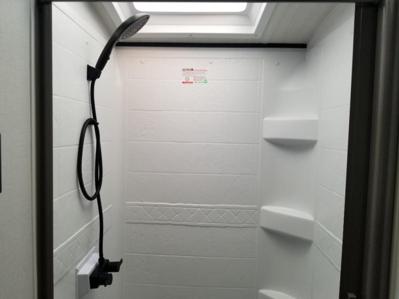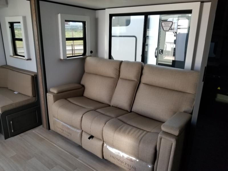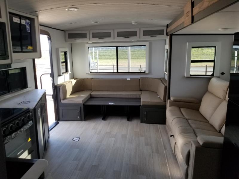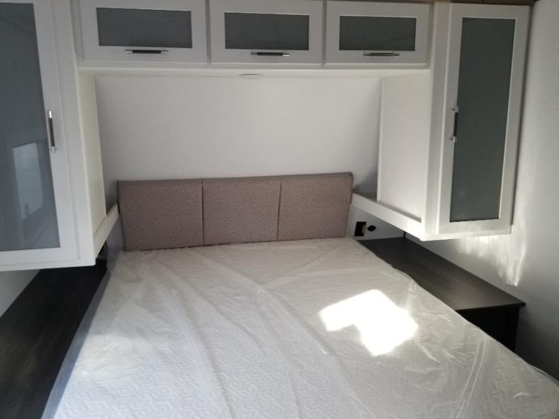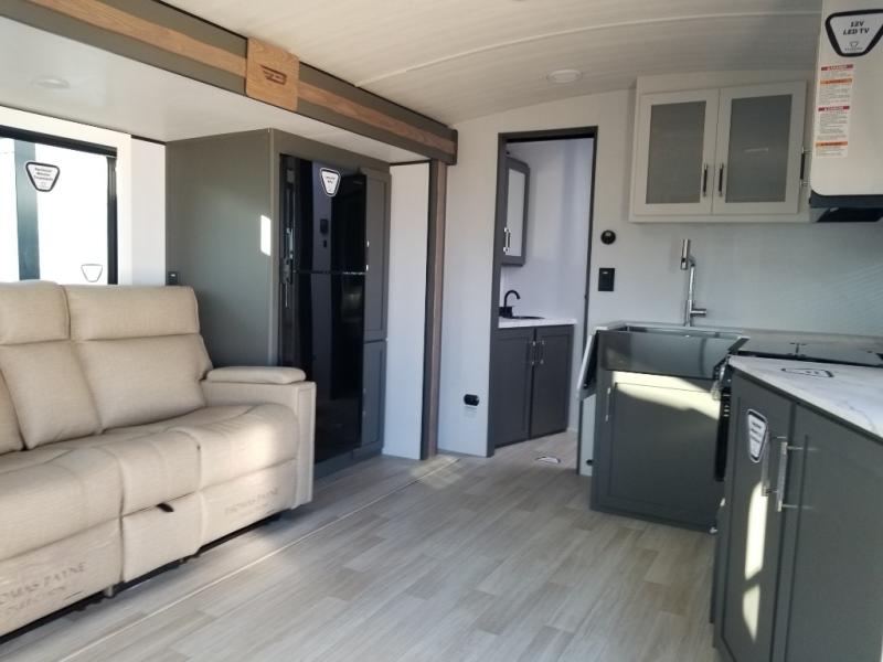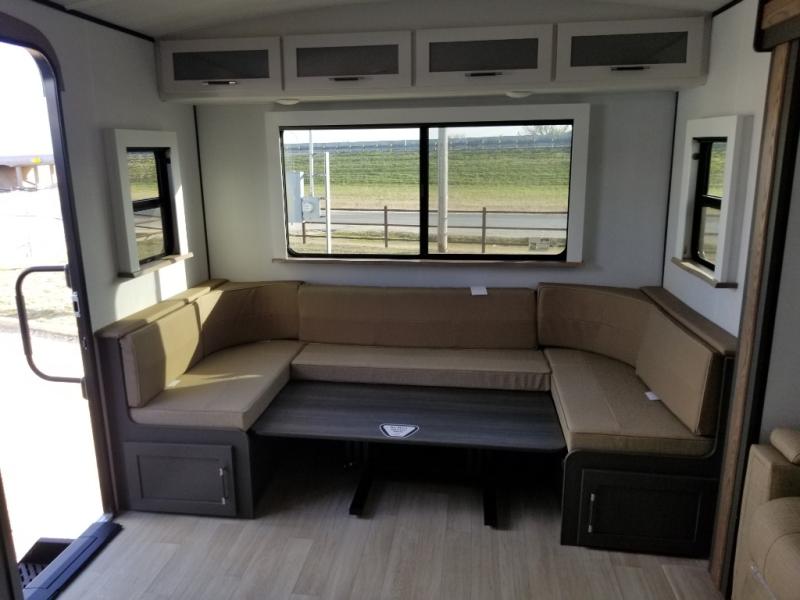 It won't be hard to find comfort in this dual entry travel trailer for six! You can enter in through the front private bedroom or the rear living area, and there is a large slide out for added space to move about. Spend your evenings on the tri-fold sofa across from the TV, around the U-shaped dinette, or outside under the 19' awning. You might even like to add the optional luxury style cinema theater seating in place of the sofa for more comfort! The walk-through bath will provide easy access for everyone, and the front master bedroom is sure to feel just like home with its queen bed and dual wardrobes!