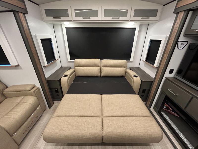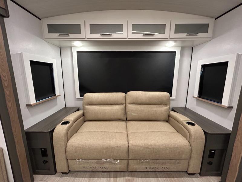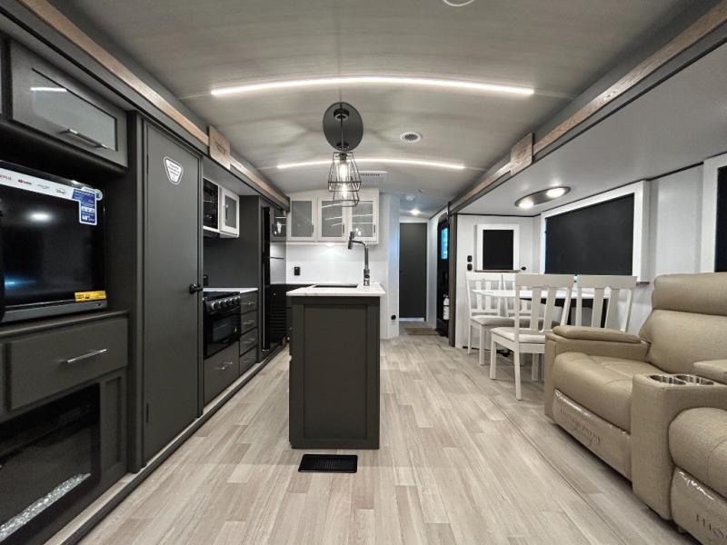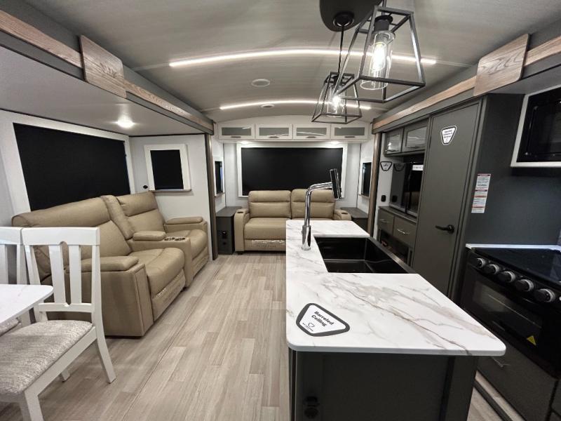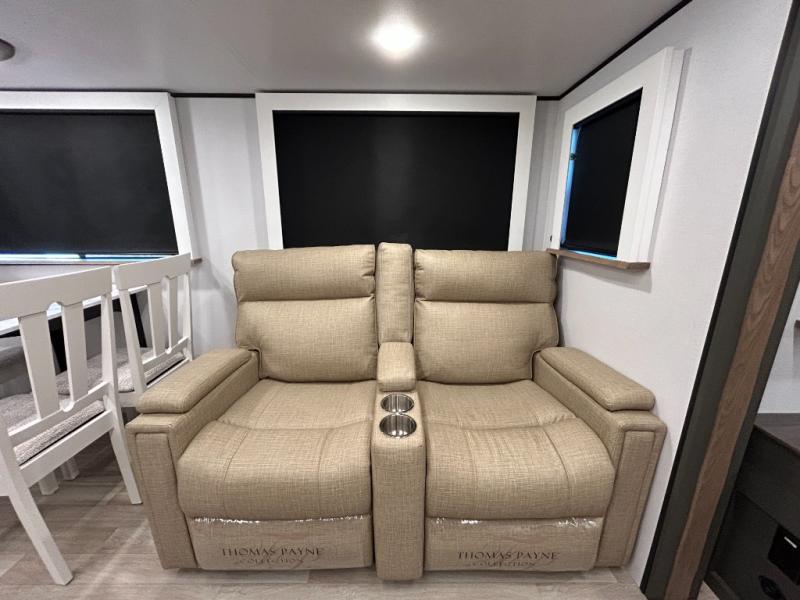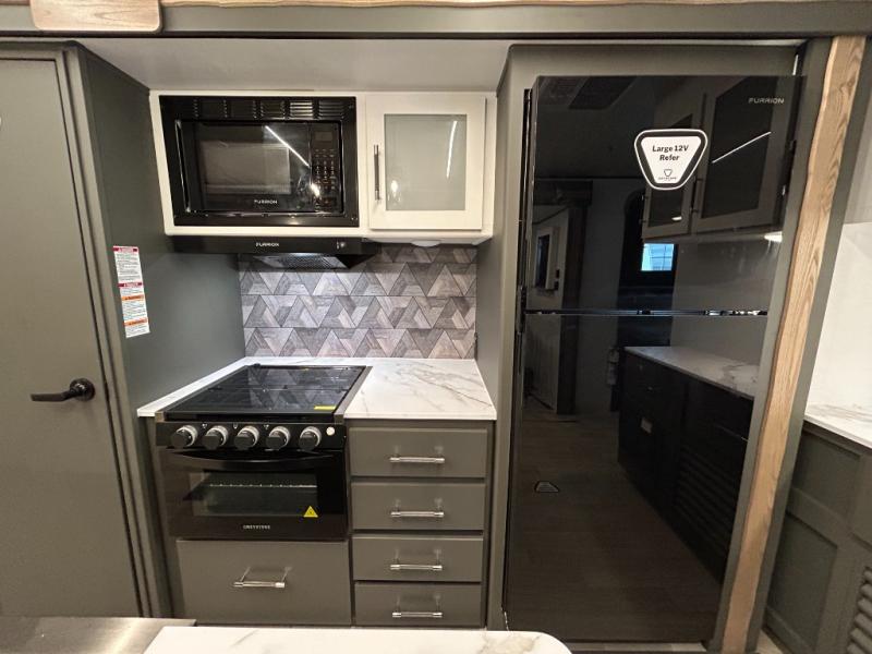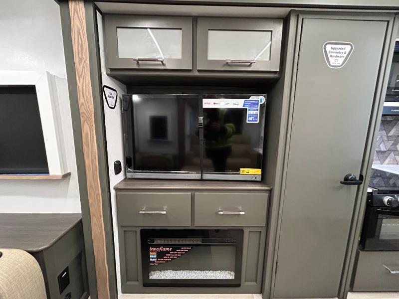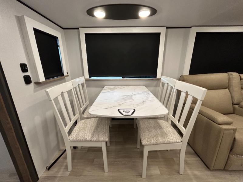 Weekend trips to the campground are made easy in this travel trailer! There are dual opposing slides in the combined kitchen and living area to provide you with ample space to stretch out. A kitchen island will come in handy when prepping meals, plus you'll have all the appliances needed to cook them. You will find comfortable seating on the rear tri-fold sofa sleeper, Do-More dinette table, and theater seats across from the entertainment center and fireplace. When you're ready to call it a night, the front private bedroom with a queen bed will be calling your name, and the full bath onboard will let you freshen up each day!