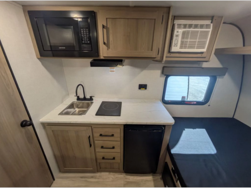 This compact travel trailer lets you camp in comfort at the location of your choice! Since there is a front queen bed, you won't have to sleep on an air mattress, and the shelf above the bed will be perfect for your belongings. Bunk beds provide additional sleeping space for your guests or little ones, and the private bath includes a shower and toilet so you won't have to use the camp's facilities at night. This model includes an induction cooktop and microwave oven to cook meals, plus a 3.2 cu. ft. 110V refrigerator for food storage. And the 8' power awning outdoors provides a place for you to sit in your camp chairs after dinner!