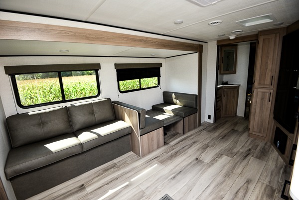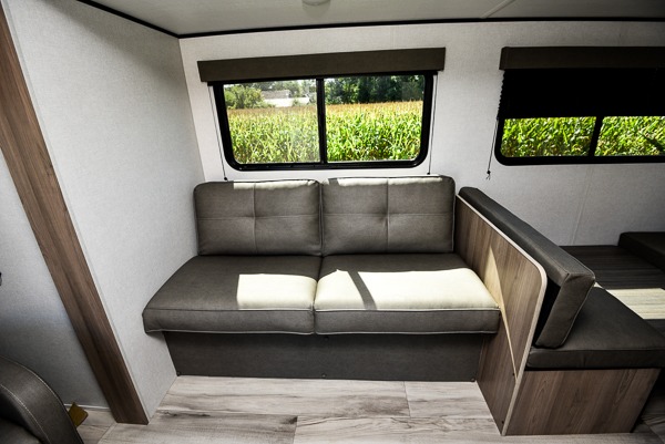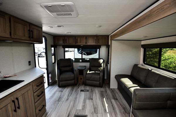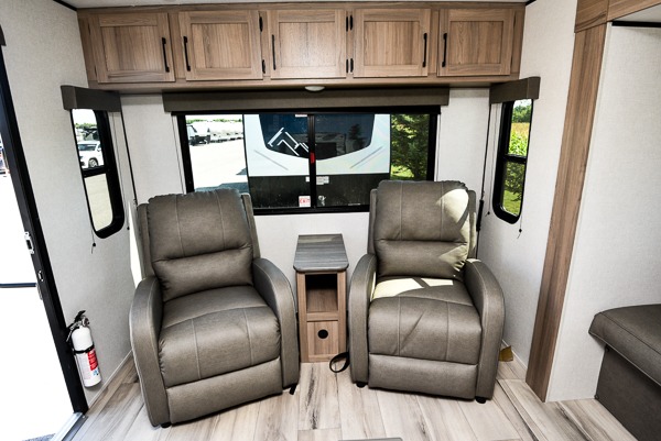 The Coleman 25R is a half-ton towable travel trailer designed for couples or small families who enjoy relaxing at the campsite. A large slide opens up the rear living area where a sofa, two recliners and a booth dinette provide comfortable seating and sleeping space. Overhead cabinets, a pantry and a full kitchen with a two-burner cooktop, air fryer/convection microwave and 8 cu ft 12-volt refrigerator keep meals and snacks convenient. The rear living area flows into a pass-through bath and front queen bedroom with dual wardrobes and an overhead shelf.