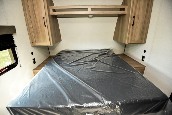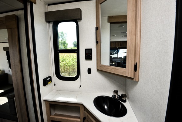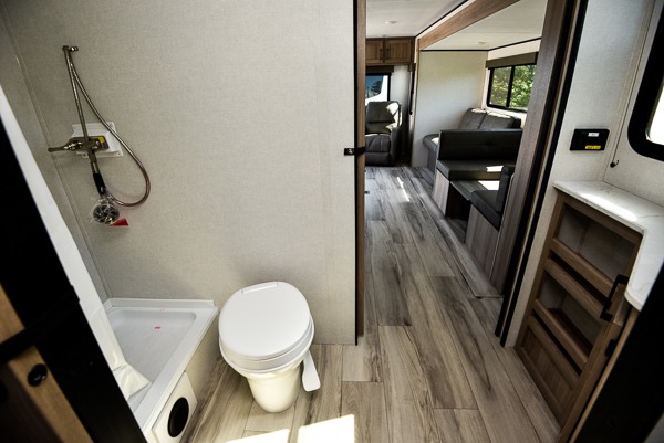 This 29-foot coach keeps you comfortable with a spacious 30" × 40" shower, porcelain foot-flush toilet, and vanity. Dual entry doors — one at the rear living area and one into the bedroom — make it easy to access the trailer from the patio or campsite. Outside, a 21’ power awning provides shade over the entry and an exterior kitchen space. Pass-through storage, quick-drop stabilizer jacks and a power tongue jack make setup a breeze so you can enjoy the outdoors sooner.