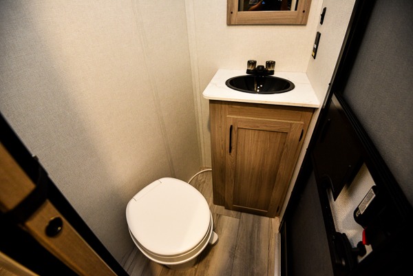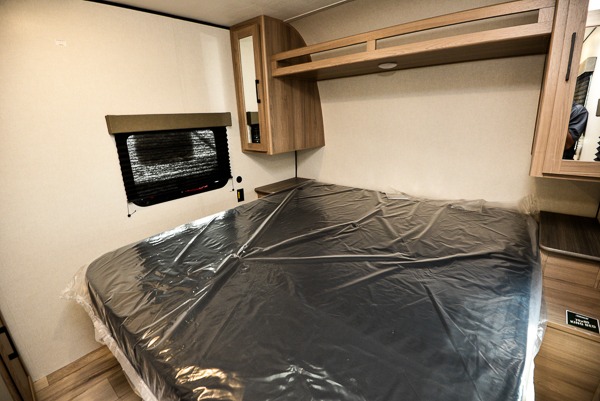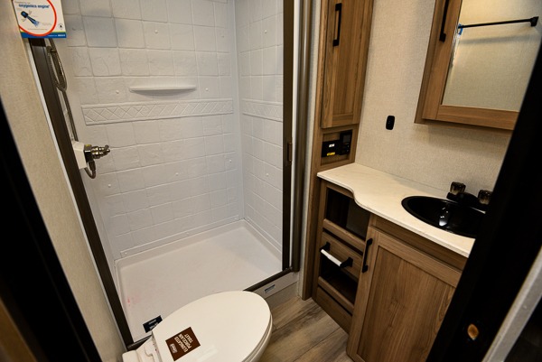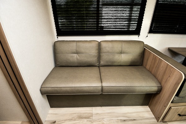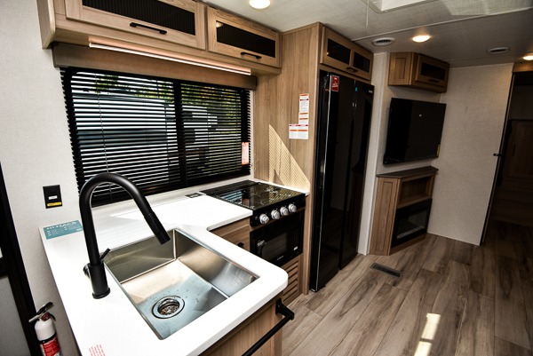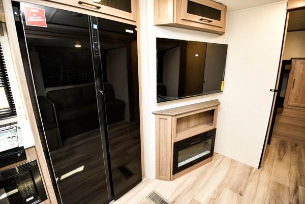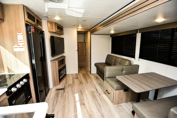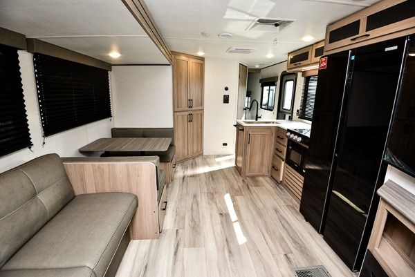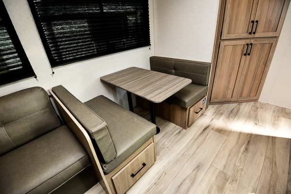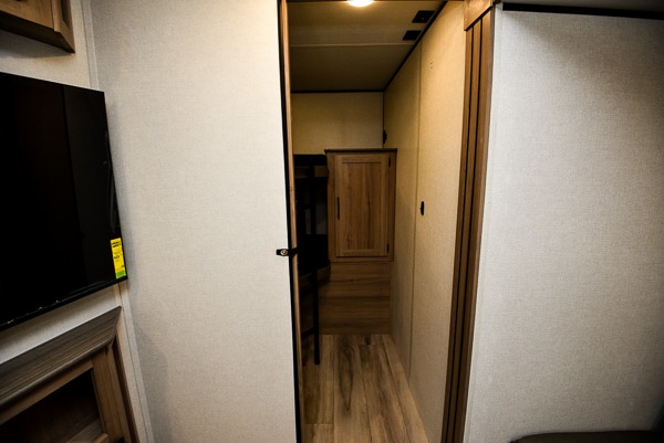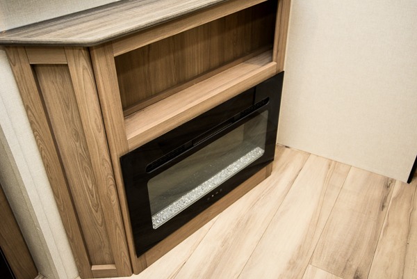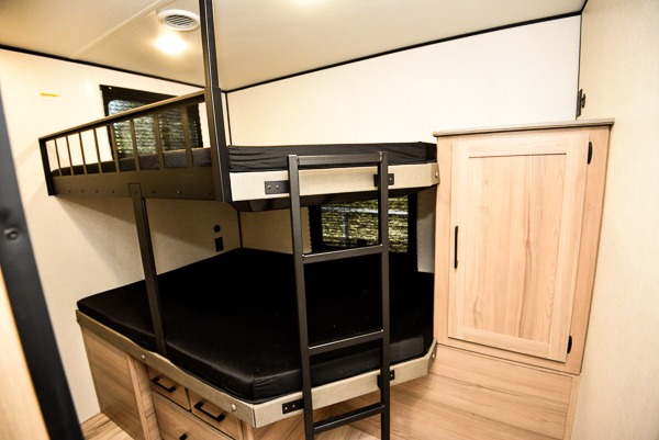 For those who enjoy camping with a larger group, this unit will be perfect! There is a rear private bunkhouse with double-size bunks, a wardrobe, and a half bath with one of the dual entry doors to the unit. The other entry door leads into the main living area and combined kitchen. Here, your crew can dine at the booth dinette, relax on the sofa, and watch a movie with the 50" TV. There is also a fireplace here to make it more cozy, and the pantry across the room can hold all the snacks. The full bath is right next to the front private bedroom where you'll find a king bed, dual bedside wardrobes and nightstands, plus a third wardrobe for ample storage space!