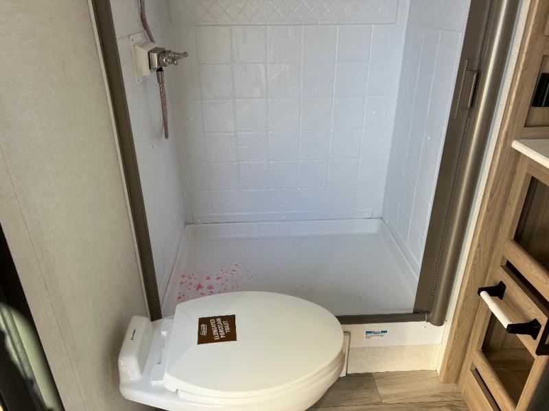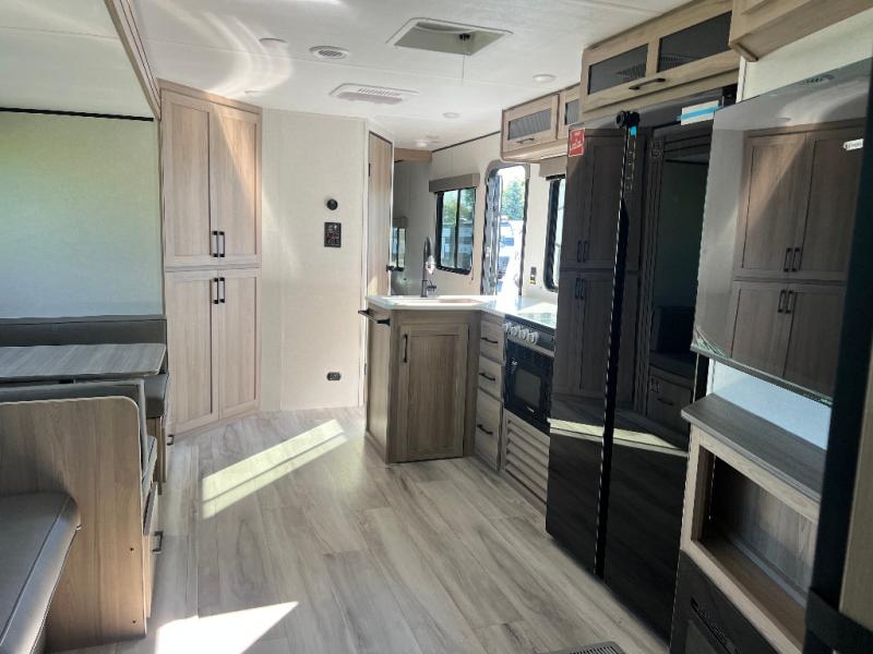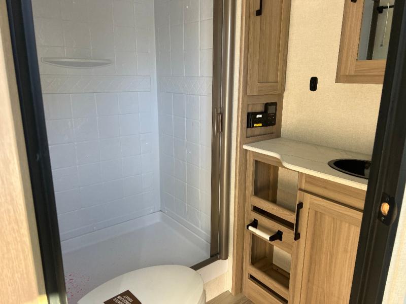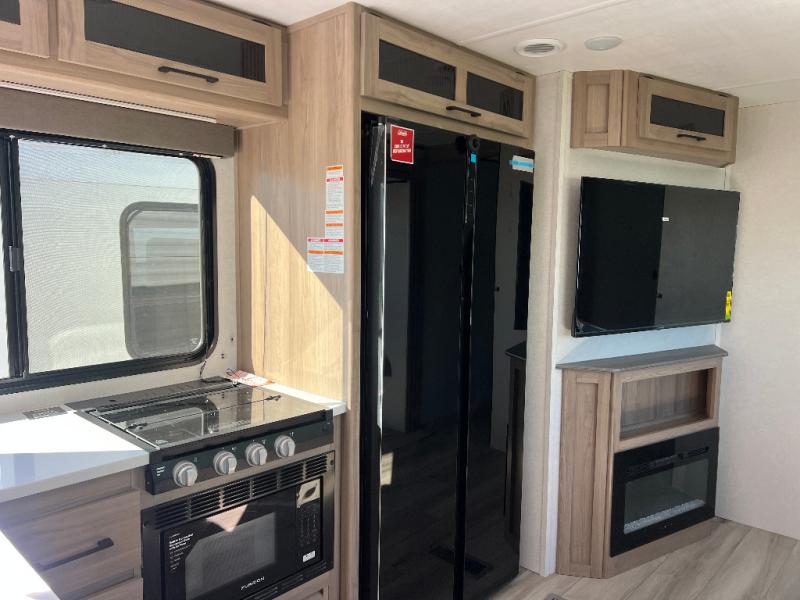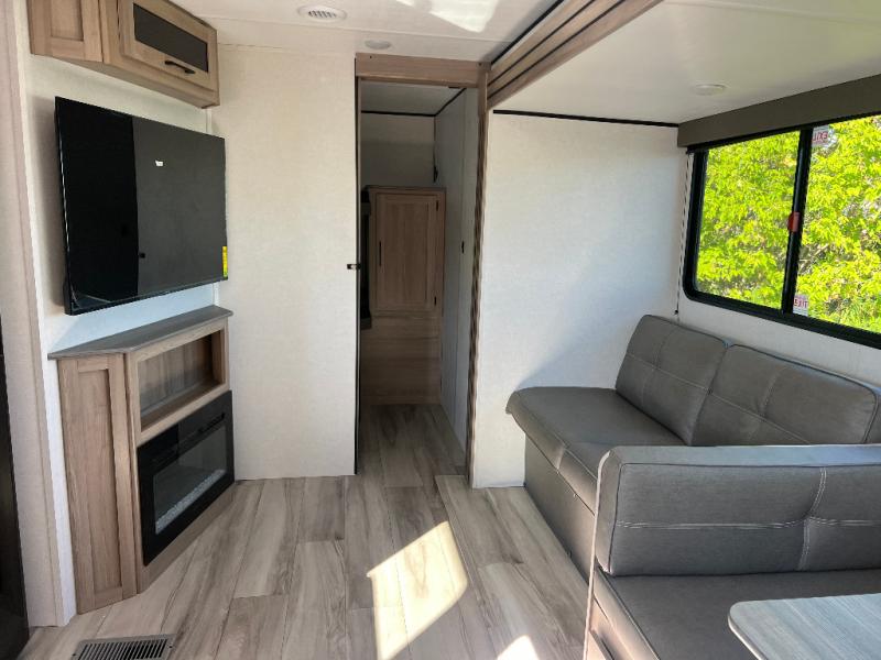 For those who enjoy camping with a larger group, this unit will be perfect! There is a rear private bunkhouse with double-size bunks, a wardrobe, and a half bath with one of the dual entry doors to the unit. The other entry door leads into the main living area and combined kitchen. Here, your crew can dine at the booth dinette, relax on the sofa, and watch a movie with the 50" TV. There is also a fireplace here to make it more cozy, and the pantry across the room can hold all the snacks. The full bath is right next to the front private bedroom where you'll find a king bed, dual bedside wardrobes and nightstands, plus a third wardrobe for ample storage space!