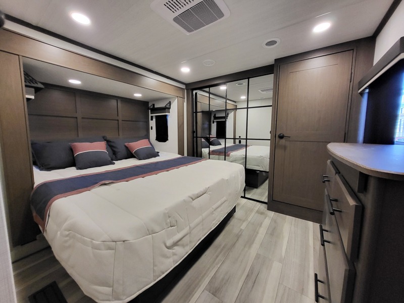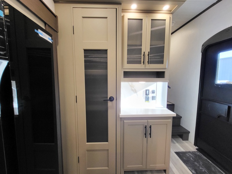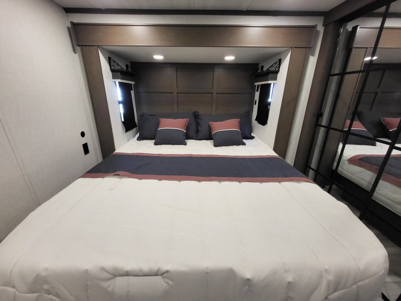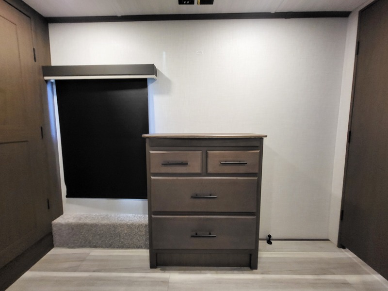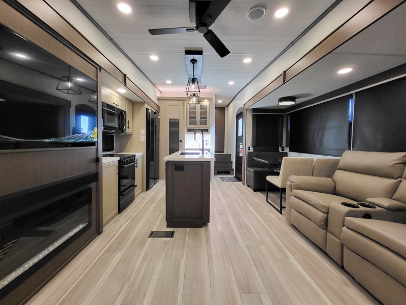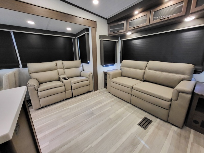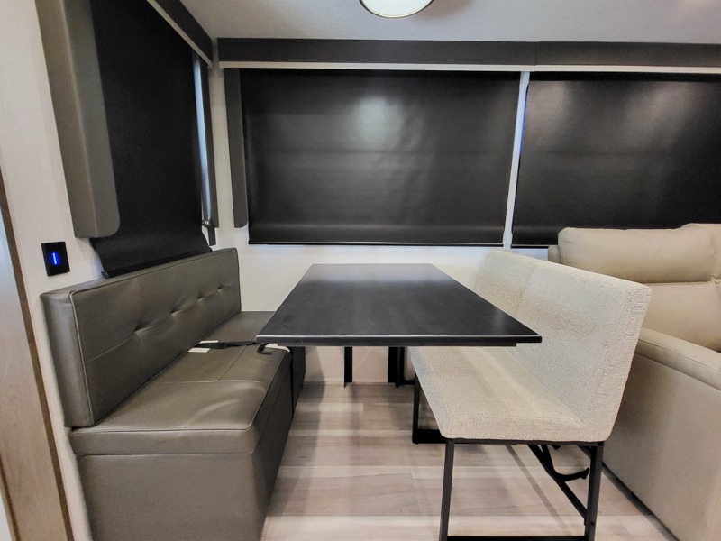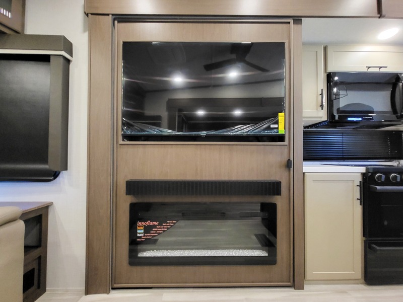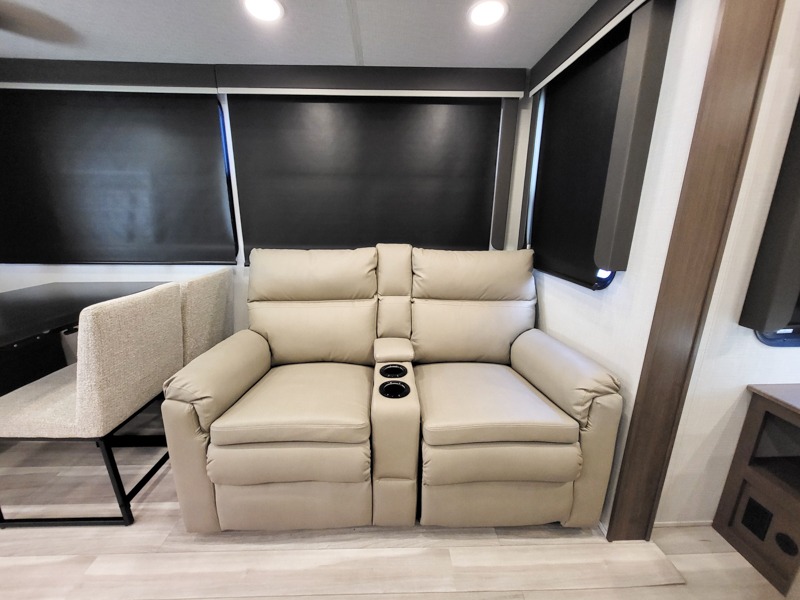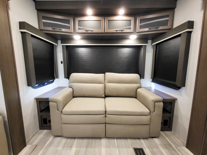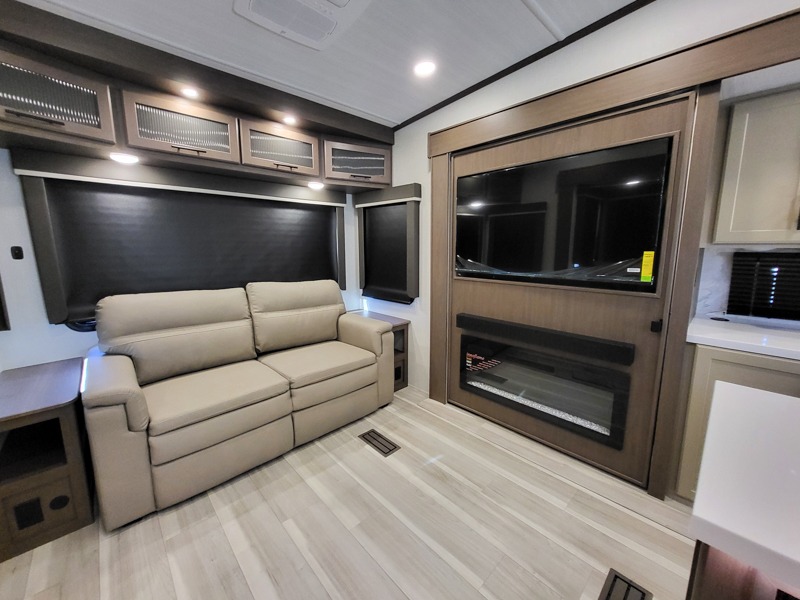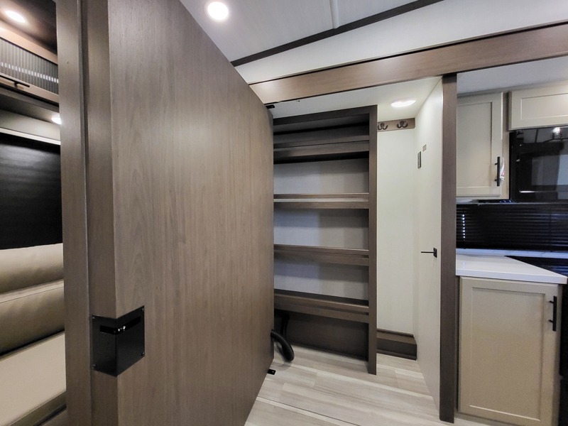 The dual opposing slides in the combined kitchen and living area will give you an open floorplan! You'll sleep on the queen-size bed in the front private bedroom, and there is under-bed storage, a full-height wardrobe, and a dresser with hidden storage for all of your personal belongings. As you spend time in the main living area, you'll appreciate having extra space thanks to the set of opposing slides, and the kitchen island will be easy to work around. You'll be able to relax on the tri-fold sleeper sofa and theater seating while you watch the LED HDTV with an pivoting entertainment door and hidden pantry. There is also a booth dinette with storage drawers, convenient shoe storage right as you enter the unit, and an exterior unobstructed pass-thru storage so nothing gets left behind.