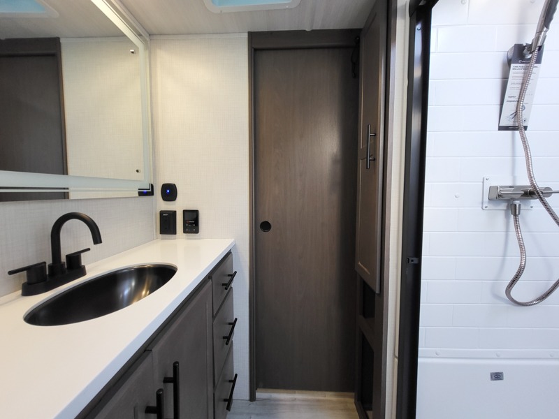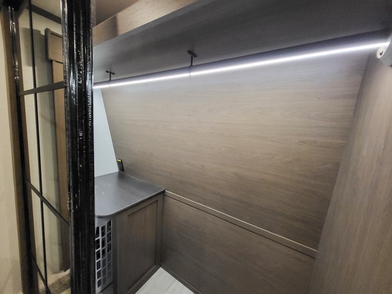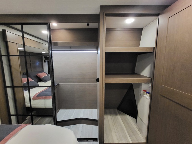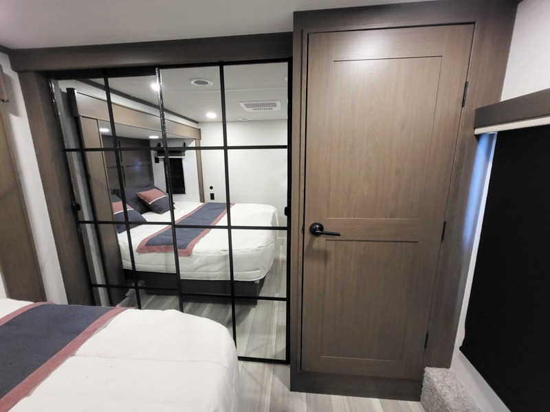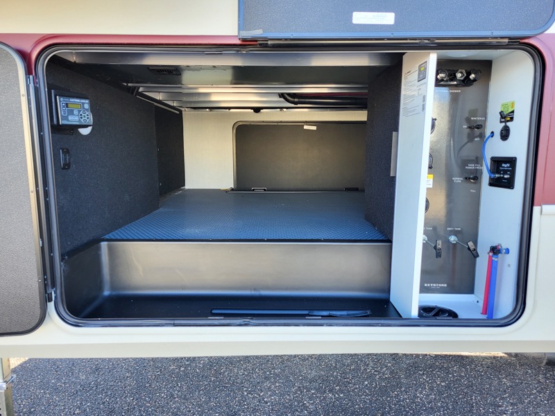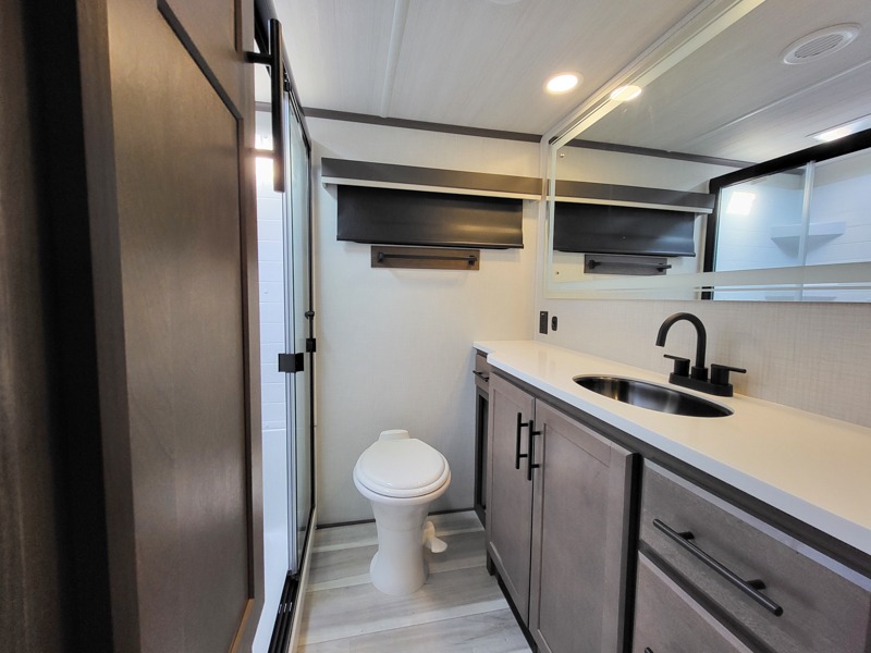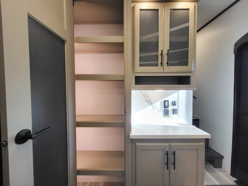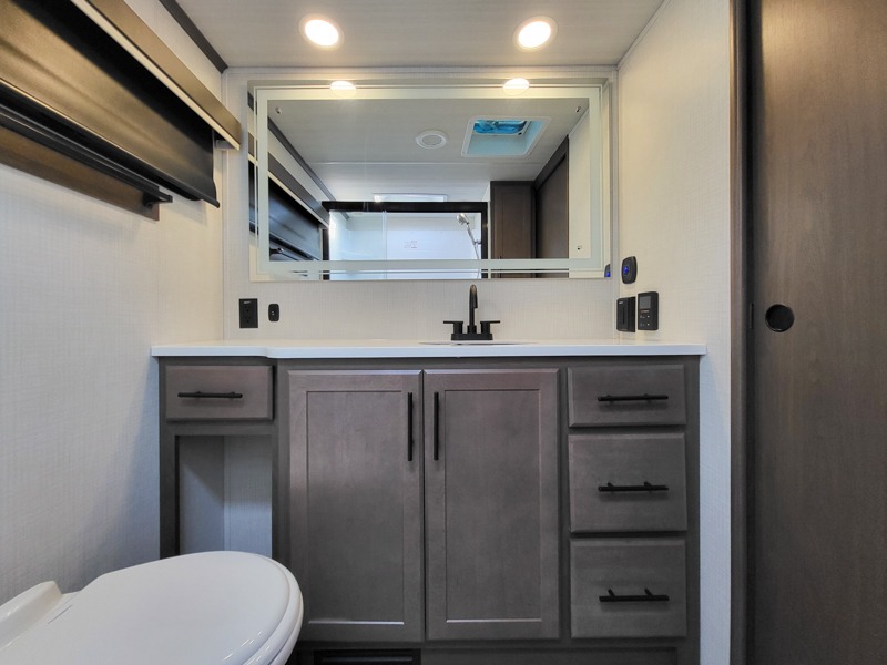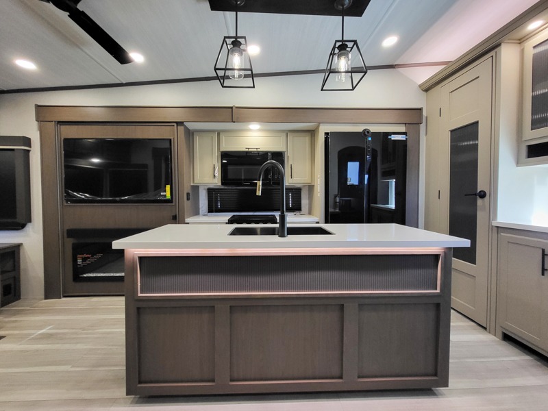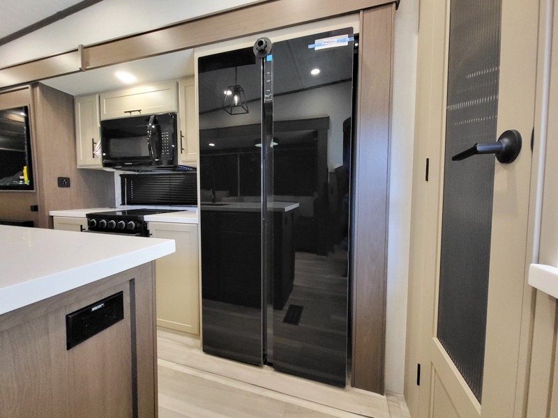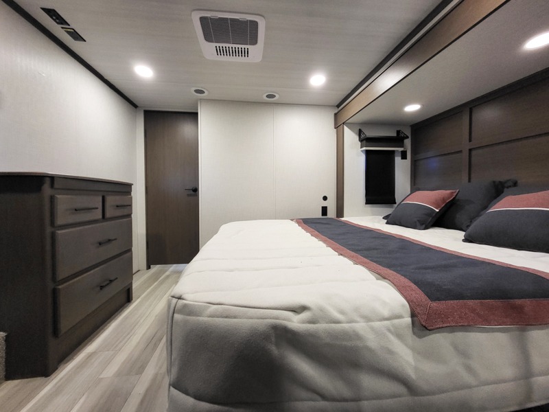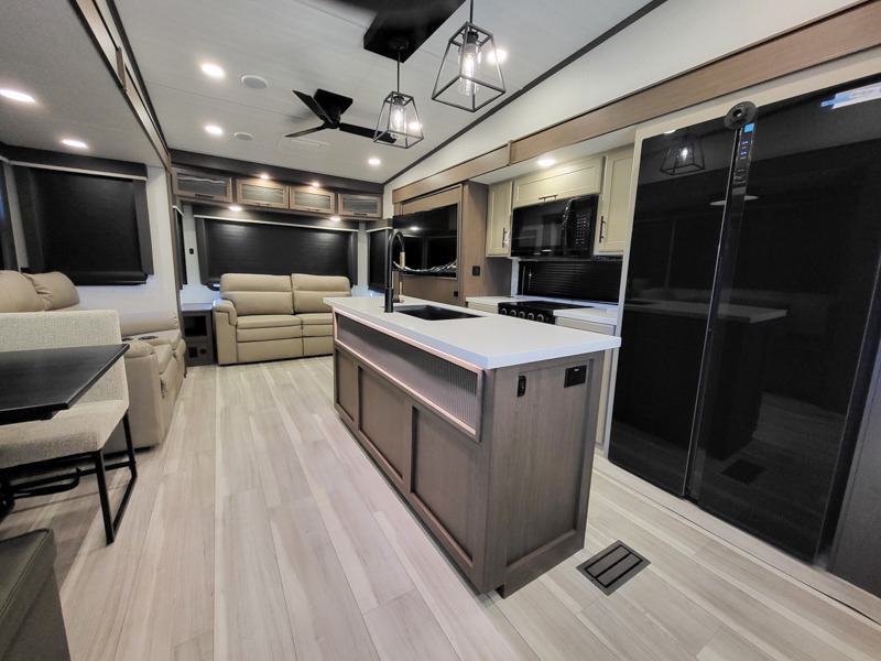 The dual opposing slides in the combined kitchen and living area will give you an open floorplan! You'll sleep on the queen-size bed in the front private bedroom, and there is under-bed storage, a full-height wardrobe, and a dresser with hidden storage for all of your personal belongings. As you spend time in the main living area, you'll appreciate having extra space thanks to the set of opposing slides, and the kitchen island will be easy to work around. You'll be able to relax on the tri-fold sleeper sofa and theater seating while you watch the LED HDTV with an pivoting entertainment door and hidden pantry. There is also a booth dinette with storage drawers, convenient shoe storage right as you enter the unit, and an exterior unobstructed pass-thru storage so nothing gets left behind.