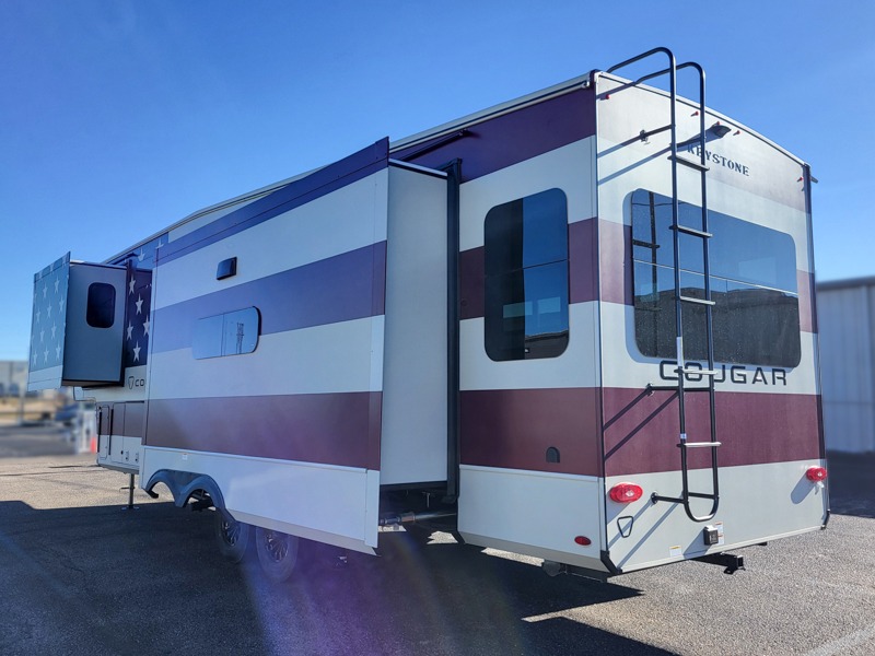 Spend more time having fun and less time worrying about your RV with the Keystone Cougar fifth wheel! These units have all that you will need for excellent vacations. The interior comes hardwood cabinet doors, solid surface kitchen countertops, an Oxygenics shower head and hose, plus a Vent-All window system. You will also appreciate the 12V charging stations throughout, the dual zone Bluetooth audio system, and the on-demand water heater for added comfort. The exterior is also fully outfitted with a convenience center, MaxTurn technology, Lippert axles with anti-lock braking system, and a Curt Road Armor shock absorbing equalizer for smooth towing. Each model is available with the optional Hero Edition. By choosing this edition, you can help support our nation's heros and their families by contributing to the Wounded Warrior Project. This optional package features an industry exclusive full-body paint matte finish, frameless windows, a glass entry door, blackout rims, and green LED exterior accent lighting; see dealer for more details!