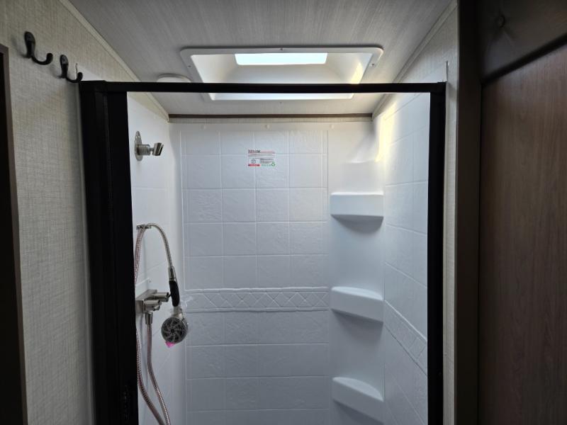 This dual entry travel trailer will let you enter in through the rear kitchen or the front master bedroom for convenience! The bedroom includes a walk-around king bed, dual nightstands, plus your own private entrance into the walk-thru bath. Once you've made your way to the rear kitchen, you can make dinner on the three-burner range, then dine with family at the booth dinette. There is also a tri-fold sleeper sofa within a slide out that will provide extra floor space and sleeping space!