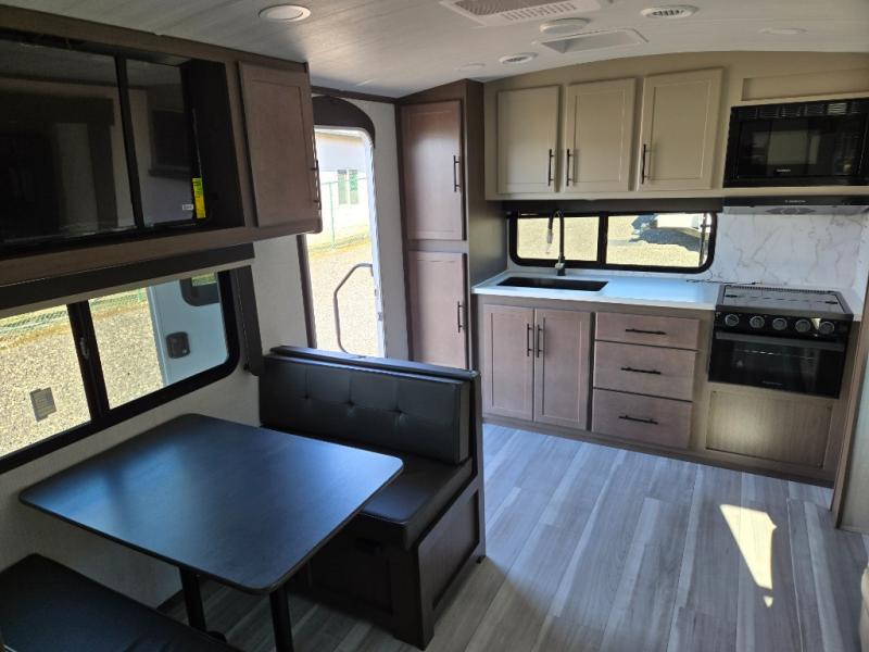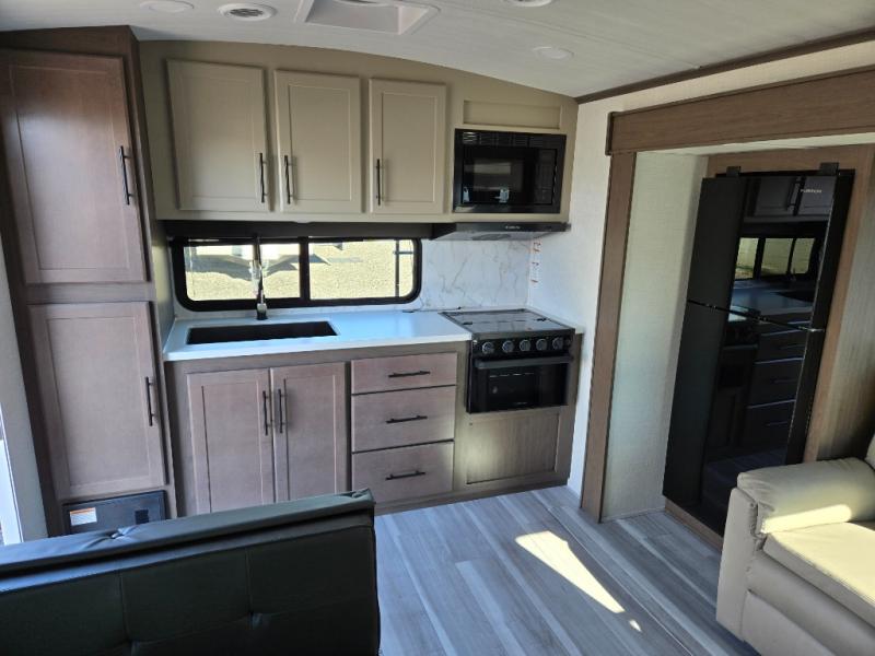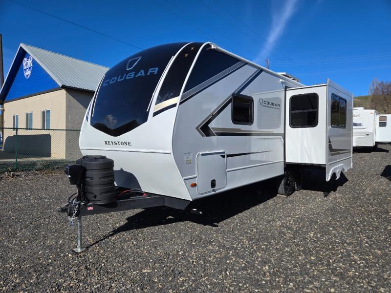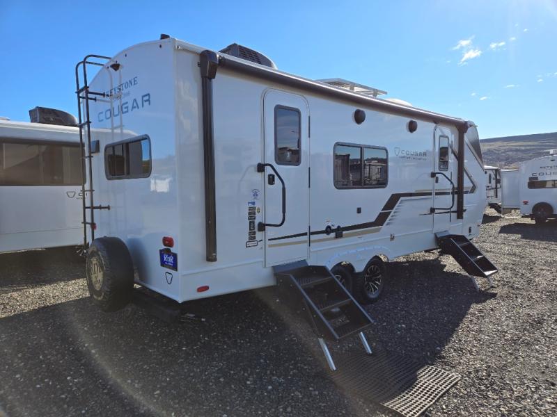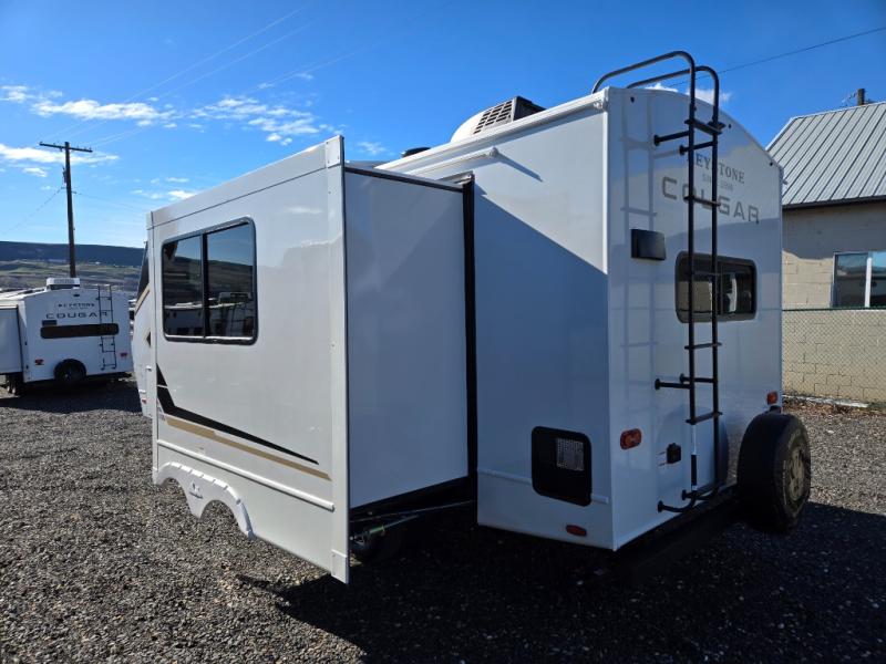 With any Cougar Western Elevation travel trailer by Keystone, you will find off-grid ready features and interior comforts to make each adventure count! Each unit is built with an automotive grade painted high-impact front cap with KeyShield protection, an AlphaPly roof membrane, and a one-piece polypropylene underbelly for added durability. There is also a high-performance Road Armor shock absorbing equalizer and Lippert axles for smoother towing. You will also appreciate the slam-latch baggage doors outside, along with a Key-Alike lock system, dual 30 lb. LP tanks and the industry's best 80-gallon fresh water capacity. The hardwood cabinet doors, seamless pressed countertops, and Oxygenics shower head will add to your comfort, and you'll find plenty of storage both inside and out for all your personal belongings, camp gear and more!