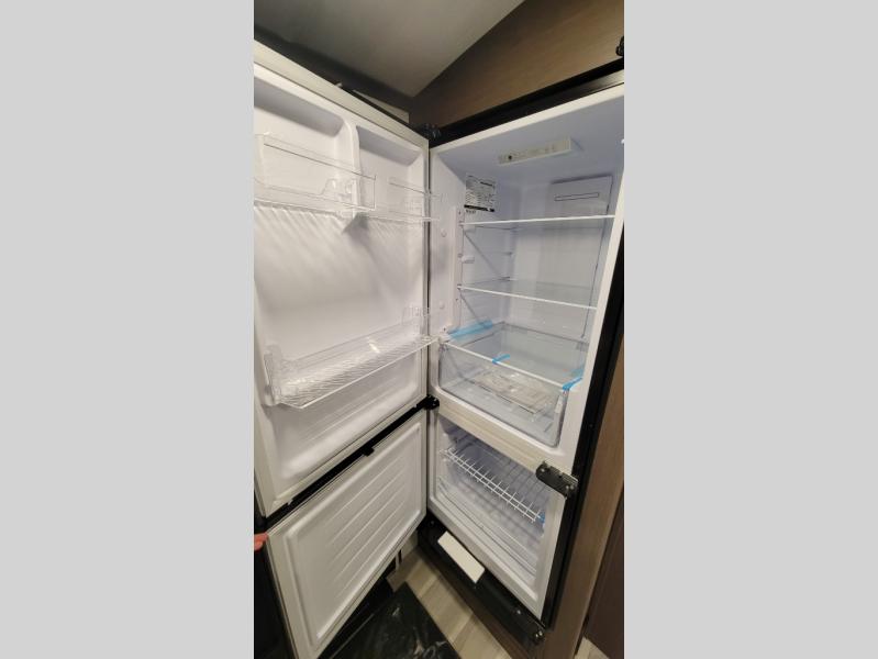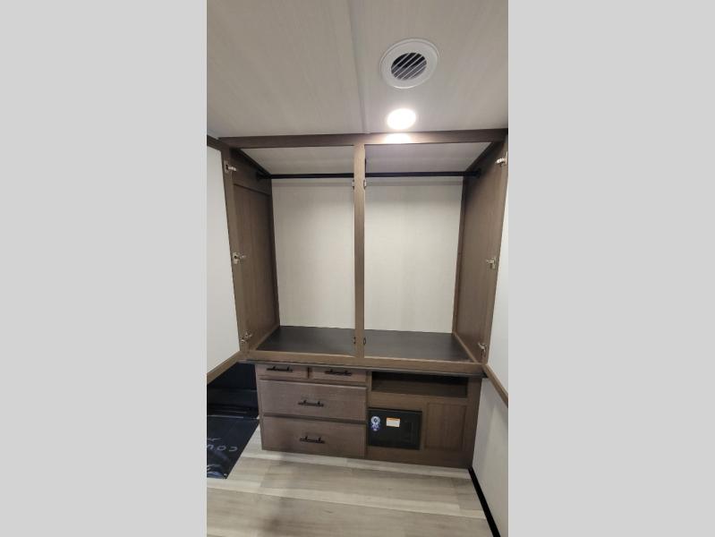 With a queen-size bed and a king bed option, this Cougar Half-Ton travel trailer shows that you can still be comfortable even while you're away from home! The bed slides out to provide more interior space and there is a wardrobe opposite near the private entry door. The main entry up front leads into a spacious combined kitchen and living area with the front kitchen offering plenty of counter space and overhead storage. There is a 12-volt refrigerator to the left of the entry door, and access to a walk-in pantry is right around the corner from the pivoting entertainment center opposite a tri-fold sofa sleeper and booth dinette slide. This unit also features a full-width walk-thru bath giving you plenty of room to shower and change.