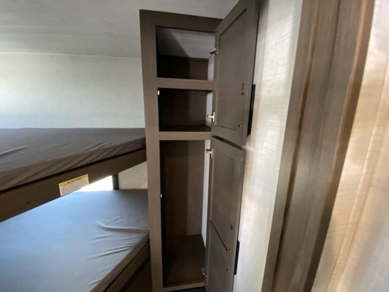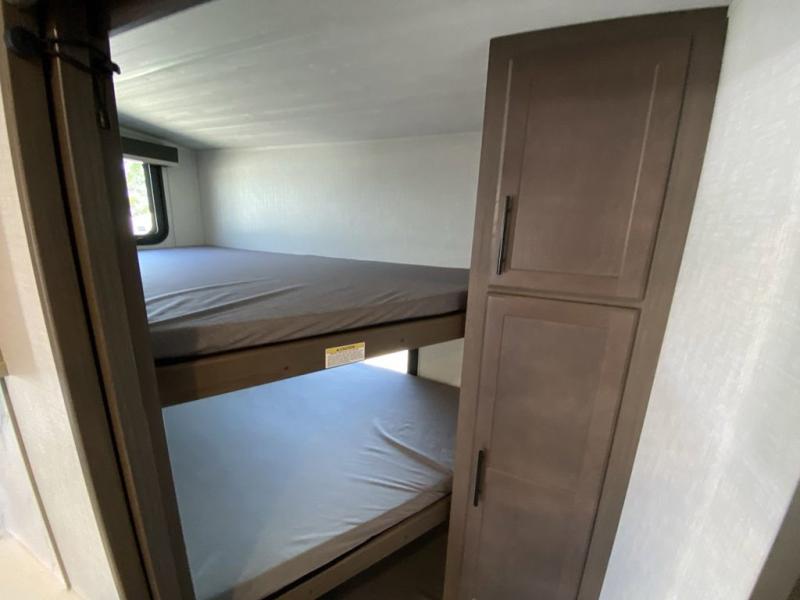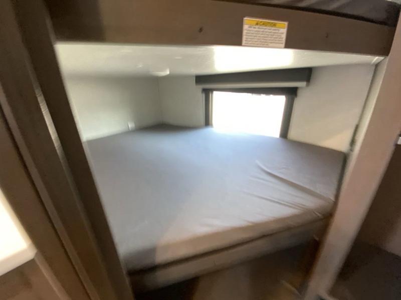 This lightweight Cougar Sport bunk model features sleeping for ten or more with triple stacked bed bunks in the rear bunkhouse, a large U-shaped dinette that can be transformed into sleep space, as well as a tri-fold sofa sleeper and a queen bed in the private bedroom up front. A fully equipped kitchen with an overhead microwave, a three burner range, and large sink plus storage will make it easy to keep everyone fed and happy. A 10.4 Cu. Ft. 12 volt refrigerator will keep all of your perishable items fresh, and there are plenty of cabinets for storing snacks and dry goods as well. Head up the steps to the bathroom featuring a shower with a skylight, sink with an overhead medicine cabinet, and toilet. The private front bedroom takes you away from the hustle and bustle of the main living area and bunkhouse to provide a relaxing retreat including a comfy queen bed, dual nightstands and a wardrobe for clothes!