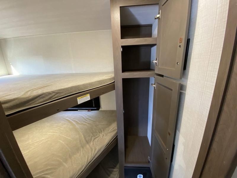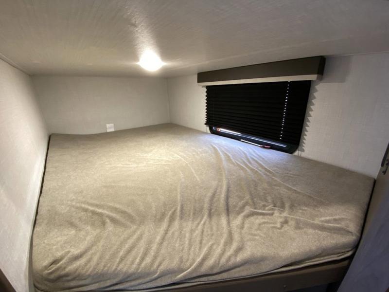 This lightweight Cougar Sport bunk model features sleeping for ten or more with triple stacked bed bunks in the rear bunkhouse, a large U-shaped dinette that can be transformed into sleep space, as well as a tri-fold sofa sleeper and a queen bed in the private bedroom up front. A fully equipped kitchen with an overhead microwave, a three burner range, and large sink plus storage will make it easy to keep everyone fed and happy. A 10.4 Cu. Ft. 12 volt refrigerator will keep all of your perishable items fresh, and there are plenty of cabinets for storing snacks and dry goods as well. Head up the steps to the bathroom featuring a shower with a skylight, sink with an overhead medicine cabinet, and toilet. The private front bedroom takes you away from the hustle and bustle of the main living area and bunkhouse to provide a relaxing retreat including a comfy queen bed, dual nightstands and a wardrobe for clothes!