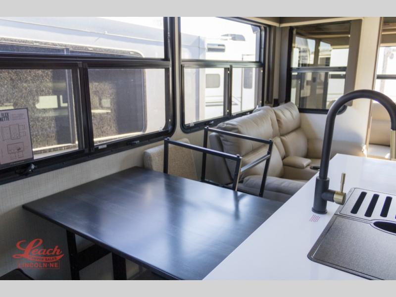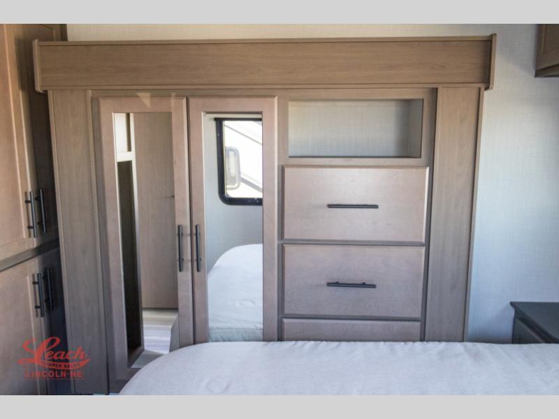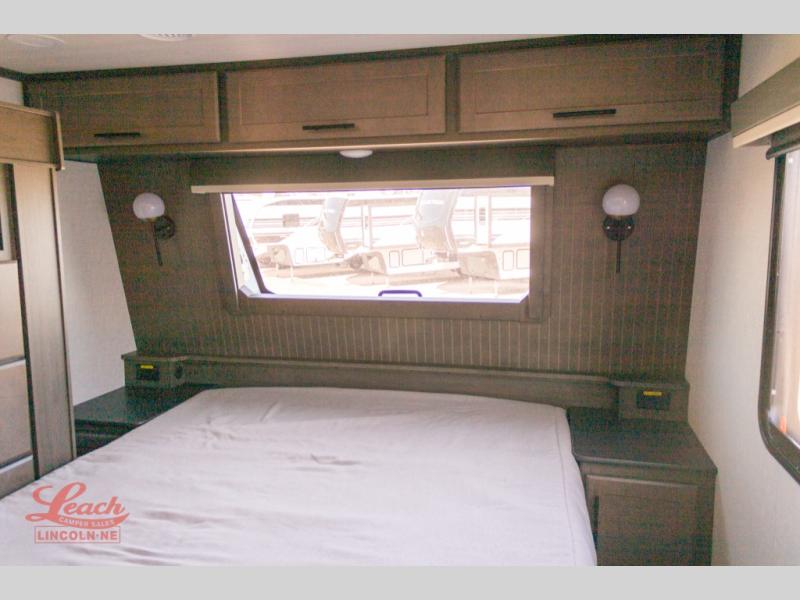 Gain some freedom to travel with this Cougar fifth wheel! You will be oh-so comfortable in the front private bedroom as you sleep on the queen-size bed, and the wardrobe slide will provide you with clothing storage. You'll be right next to the full bathroom while you're in the bedroom, so you can easily step inside the bathroom for a quick rinse in the 30" x 40" shower. The main living area offers you more space with its opposing slides, and you'll be able to get comfortable each evening on the tri-fold sleeper sofa and theater seating, or play a game at the booth dinette. There is also a pivoting entertainment door with a pantry and cordless vacuum prep!