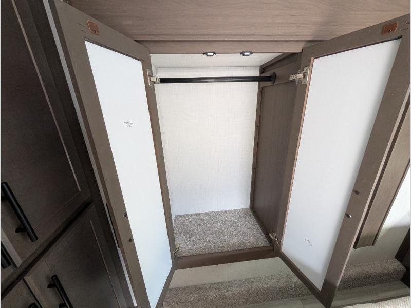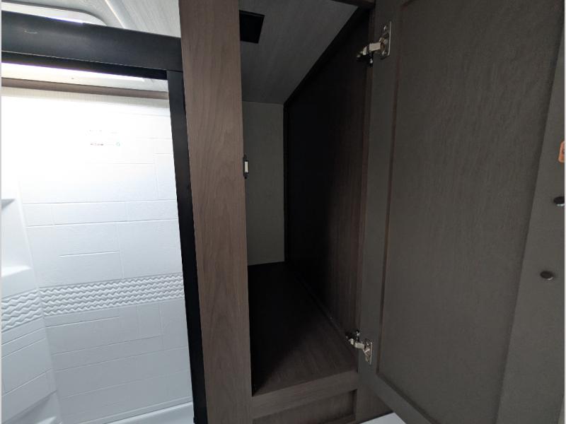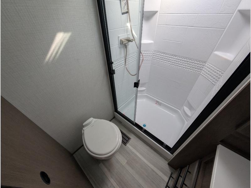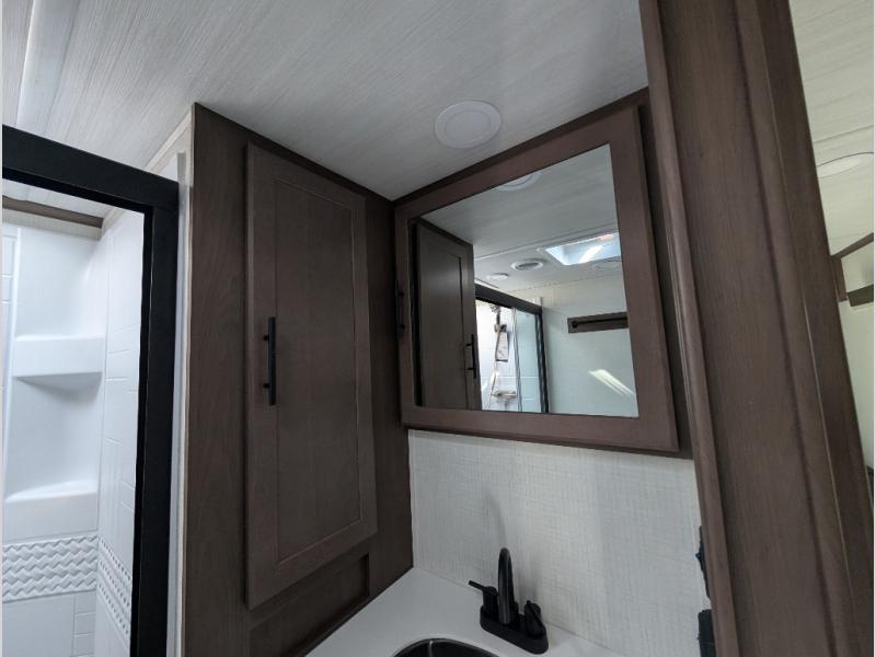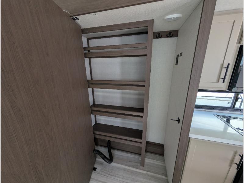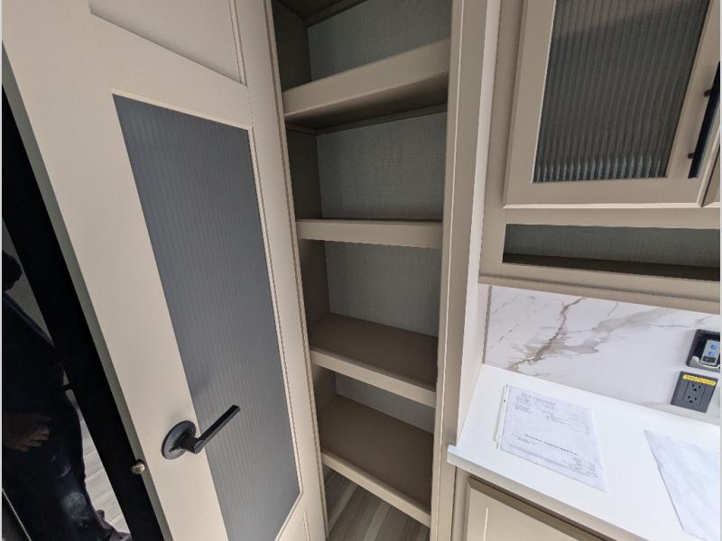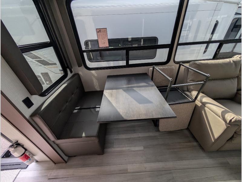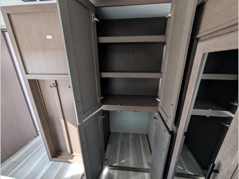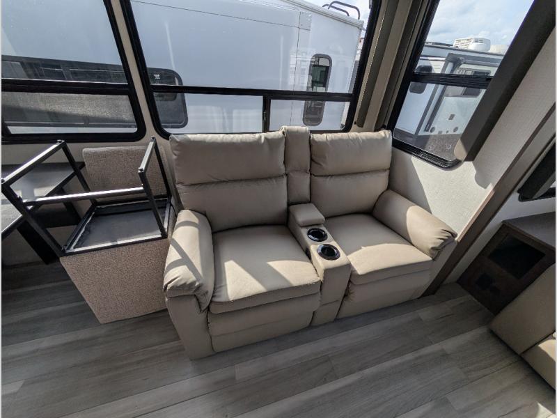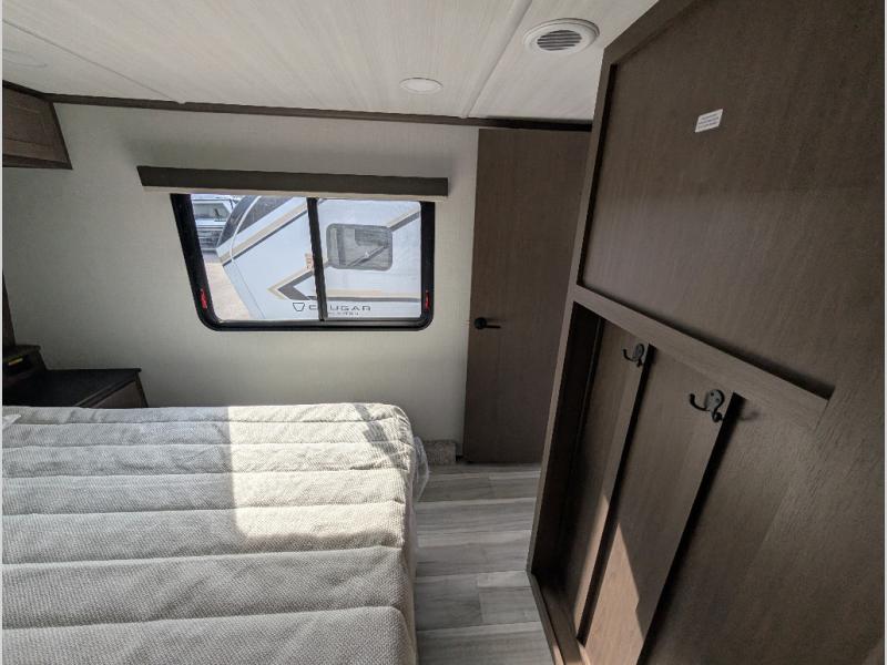 Gain some freedom to travel with this Cougar fifth wheel! You will be oh-so comfortable in the front private bedroom as you sleep on the queen-size bed, and the wardrobe slide will provide you with clothing storage. You'll be right next to the full bathroom while you're in the bedroom, so you can easily step inside the bathroom for a quick rinse in the 30" x 40" shower. The main living area offers you more space with its opposing slides, and you'll be able to get comfortable each evening on the tri-fold sleeper sofa and theater seating, or play a game at the booth dinette. There is also a pivoting entertainment door with a pantry and cordless vacuum prep!