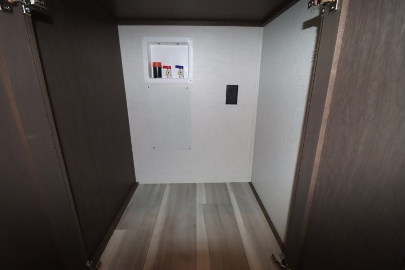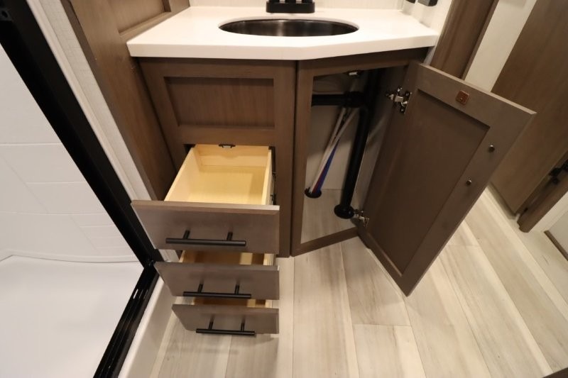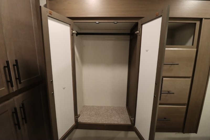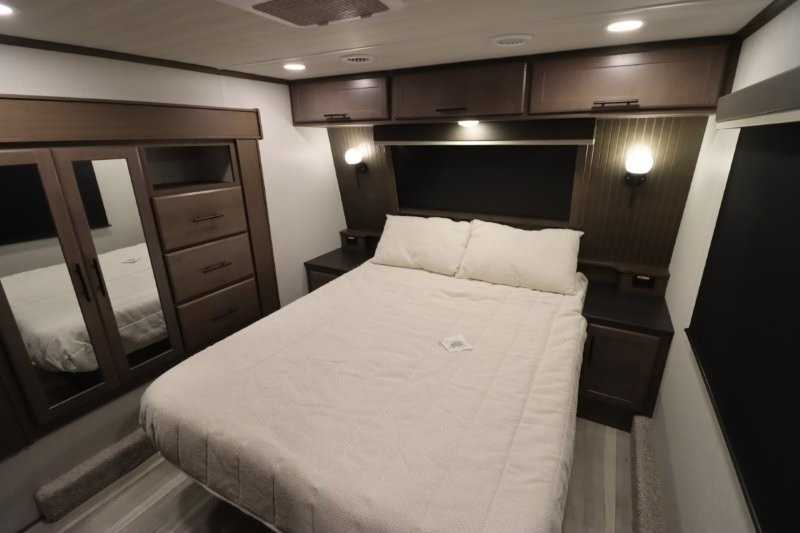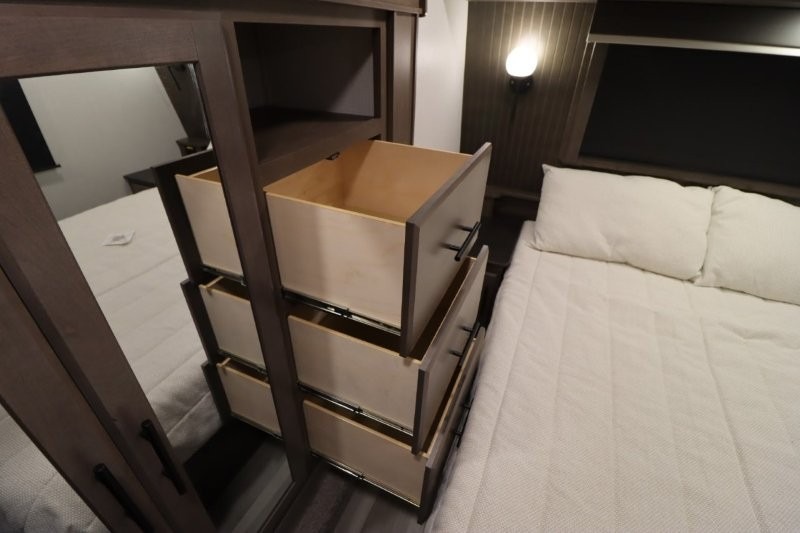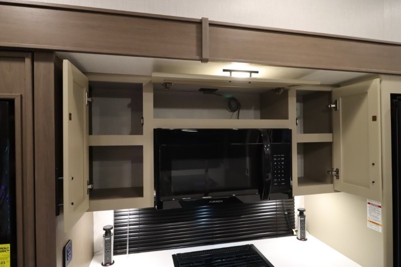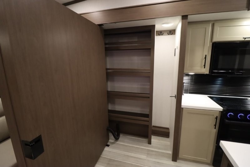 Gain some freedom to travel with this Cougar fifth wheel! You will be oh-so comfortable in the front private bedroom as you sleep on the queen-size bed, and the wardrobe slide will provide you with clothing storage. You'll be right next to the full bathroom while you're in the bedroom, so you can easily step inside the bathroom for a quick rinse in the 30" x 40" shower. The main living area offers you more space with its opposing slides, and you'll be able to get comfortable each evening on the tri-fold sleeper sofa and theater seating, or play a game at the booth dinette. There is also a pivoting entertainment door with a pantry and cordless vacuum prep!