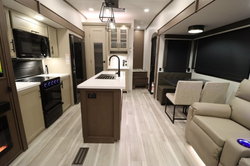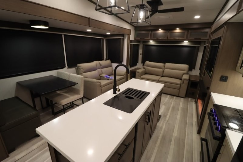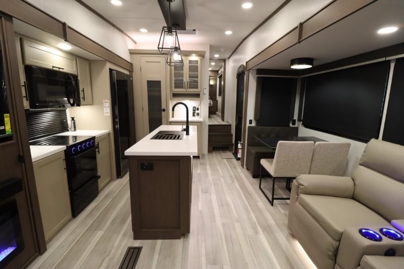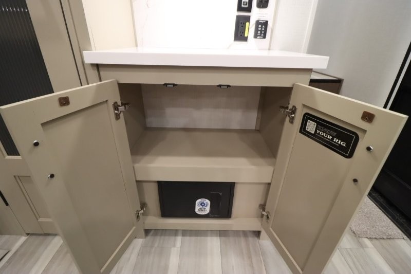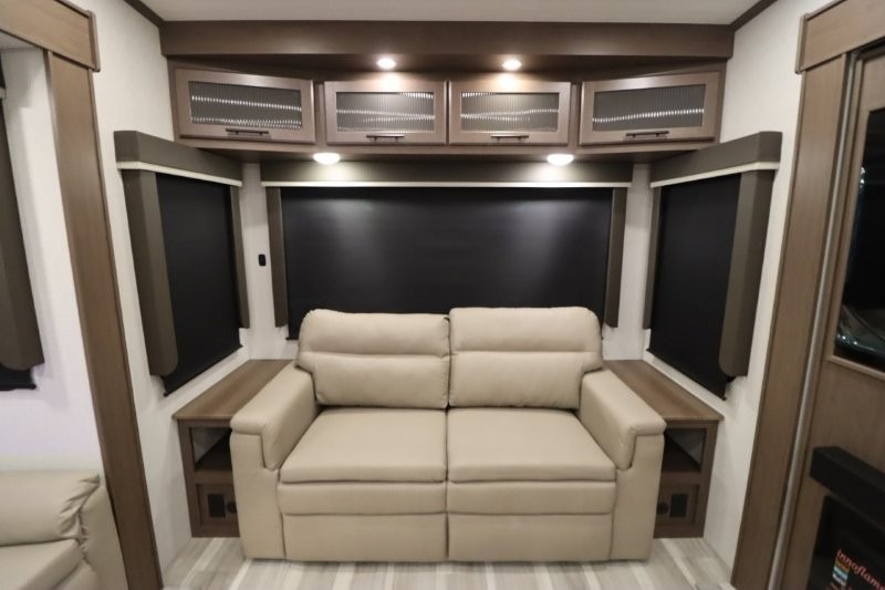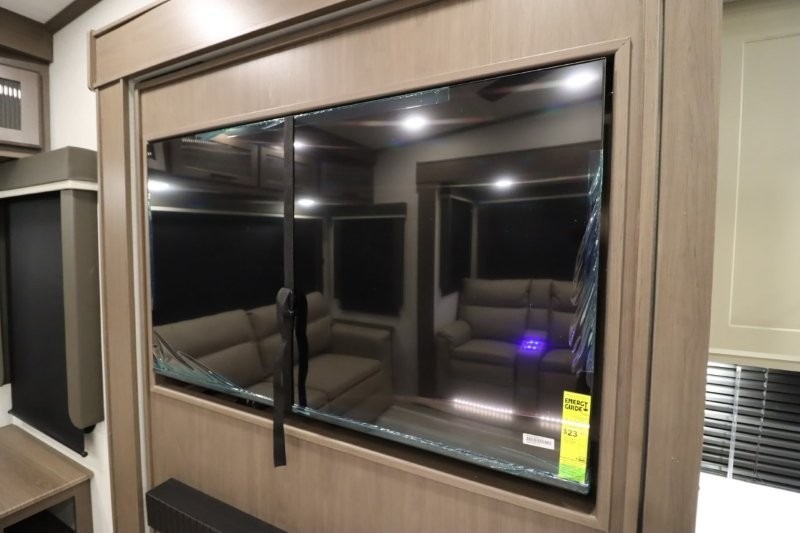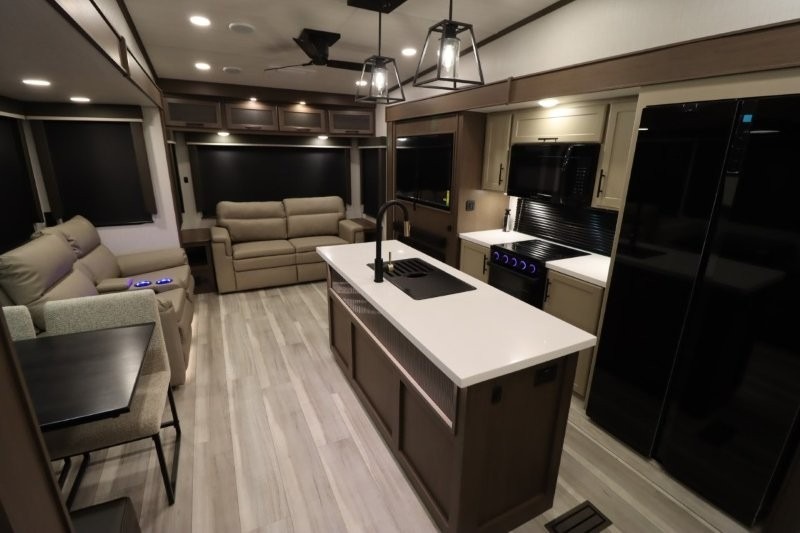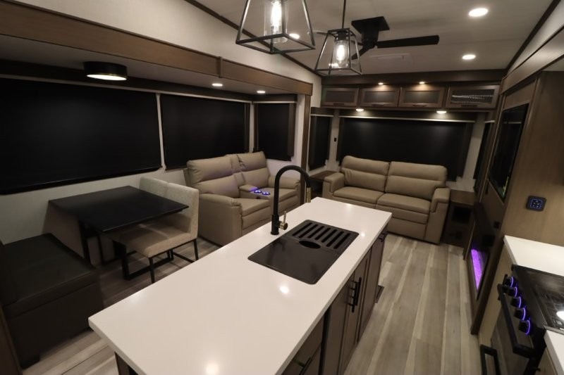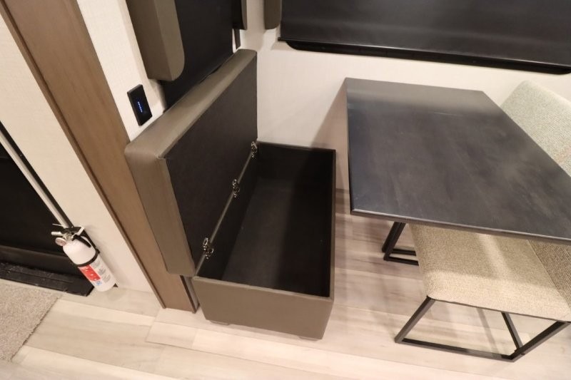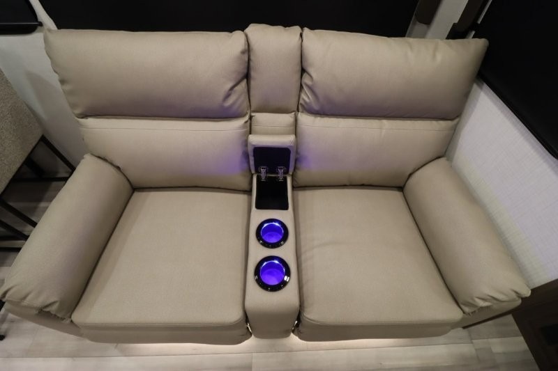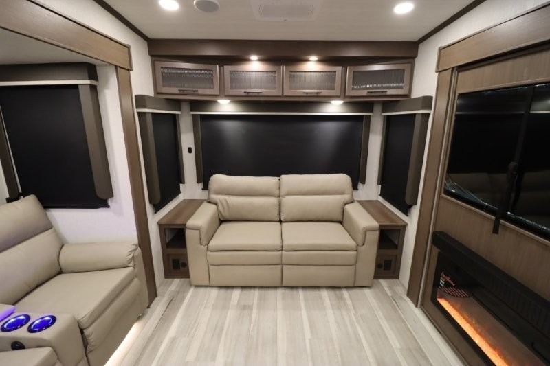 Solar Flex Protect, 4-point auto level, 2nd power awning, 2nd 15K A/C, Theatre Seating, Refrigerator - 12V - 10cf., Free Standing Dinette w/ Ottoman.