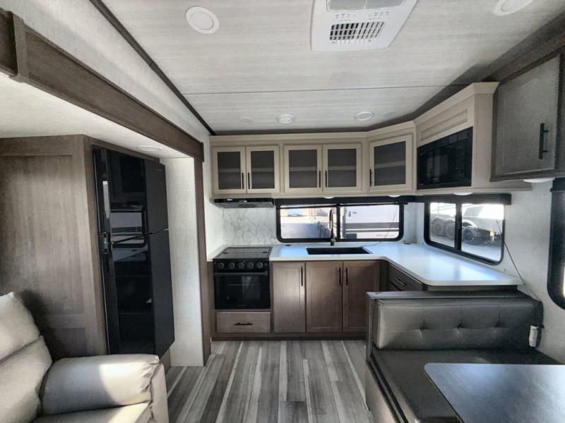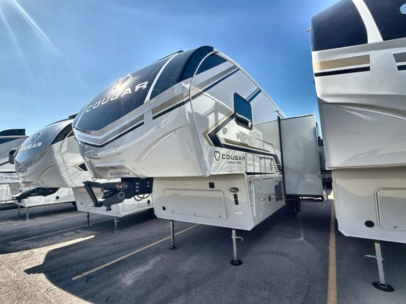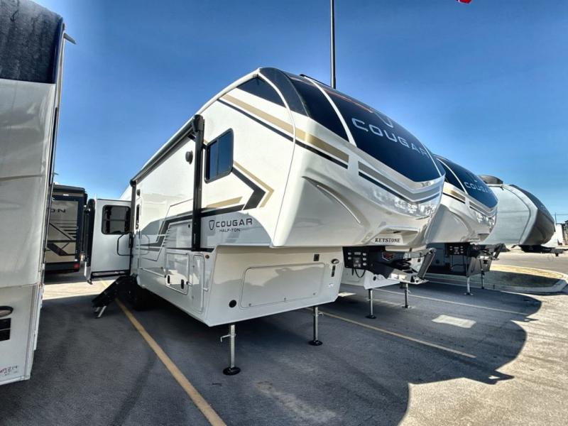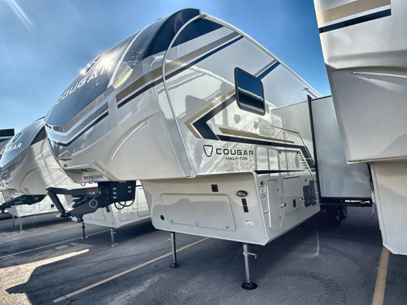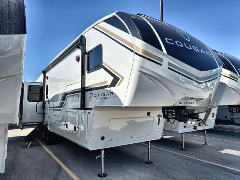The Keystone Cougar Half-Ton fifth wheel and travel trailers are known as one of America's favorites for a reason! Some of those reasons are the exclusive features that come from Keystone, like the Winegard Air 360+ omni-directional rooftop antenna, the in-floor heating ducts, and the HyperCore composite wall construction with Vixen Fibrogloss high-gloss finish. The Cougar Half-Ton has a Climate Guard protection package with heat-deflecting white sidewalls, two roof attic vents, PEX plumbing and more to enjoy four season camping. Inside, you'll love the dimmable lighting, night roller shades throughout, shower skylight, and bedside USB outlets to keep your electronics charged.