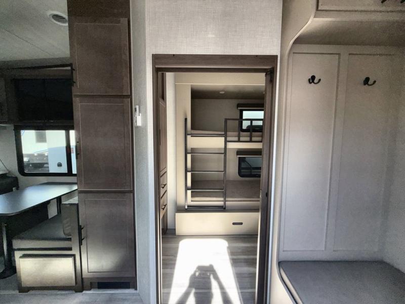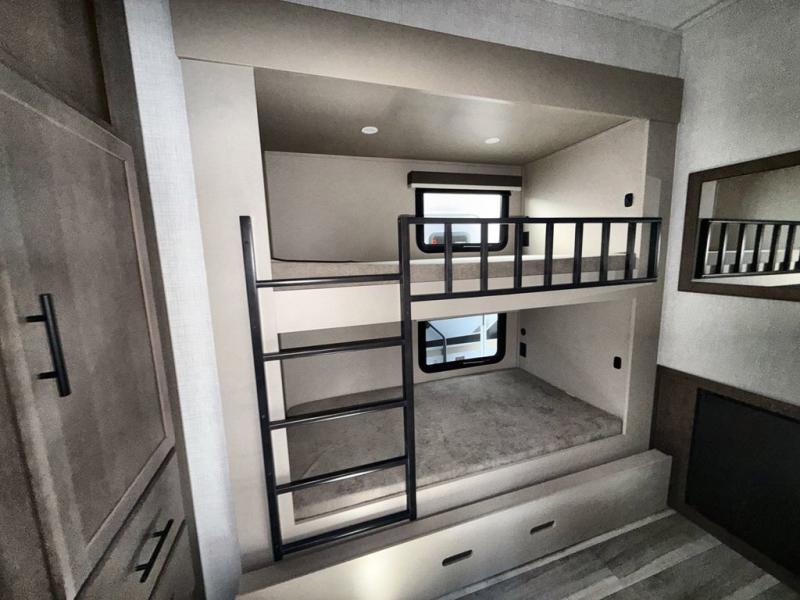 The whole crew will love camping trips in this spacious fifth wheel! From the front bedroom with a walk-around king bed to the rear kitchen with ample counter space, this is something for everyone. A middle bunkroom includes built-in bunk beds with a lower trundle bed and a flip-up table if some work needs done. Once your meals are made, you can dine at the booth dinette, relax on the sofa, or head outdoors to enjoy the power awnings. The full bath is towards the front near the bedroom for convenience. Here, you'll find a king bed, dual nightstands, plus a wardrobe with washer and dryer prep if you choose to add these appliances!