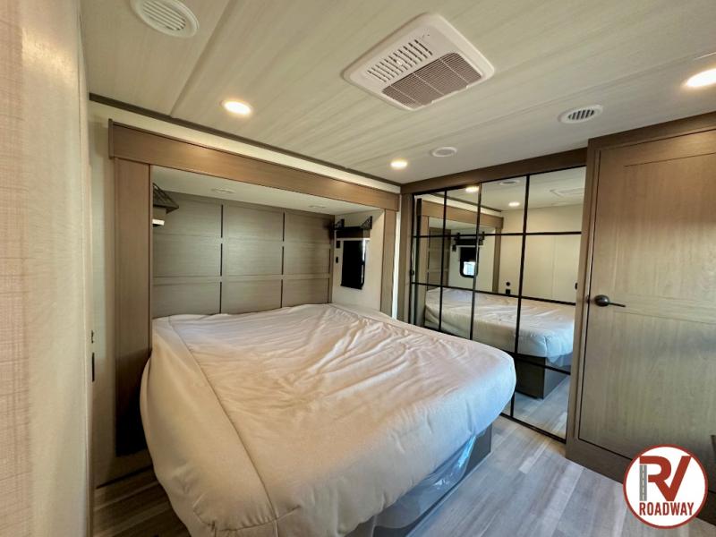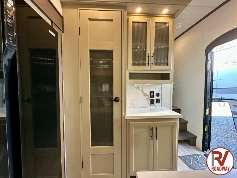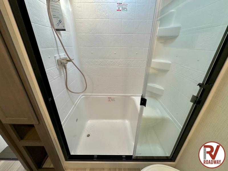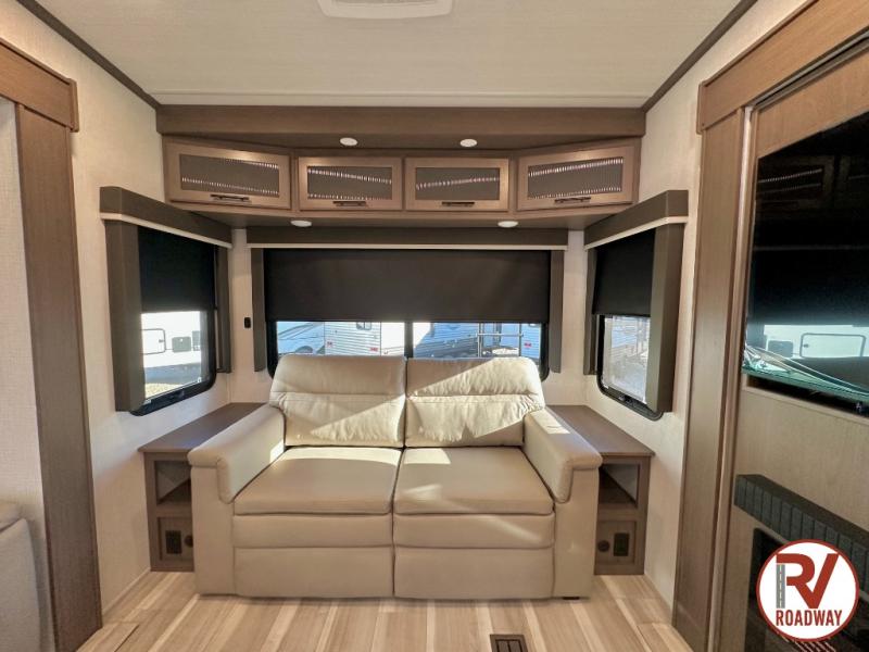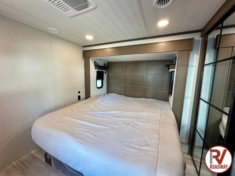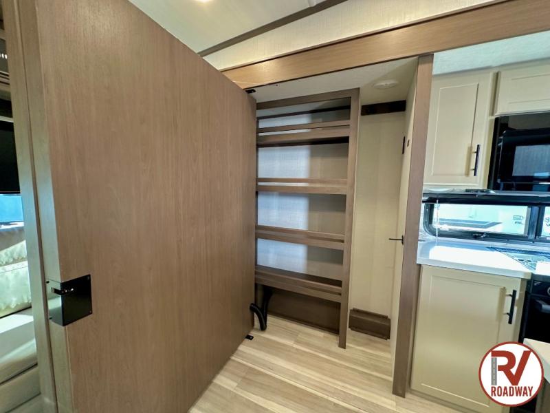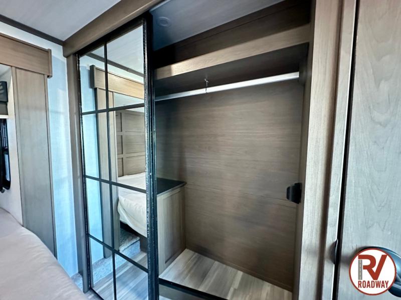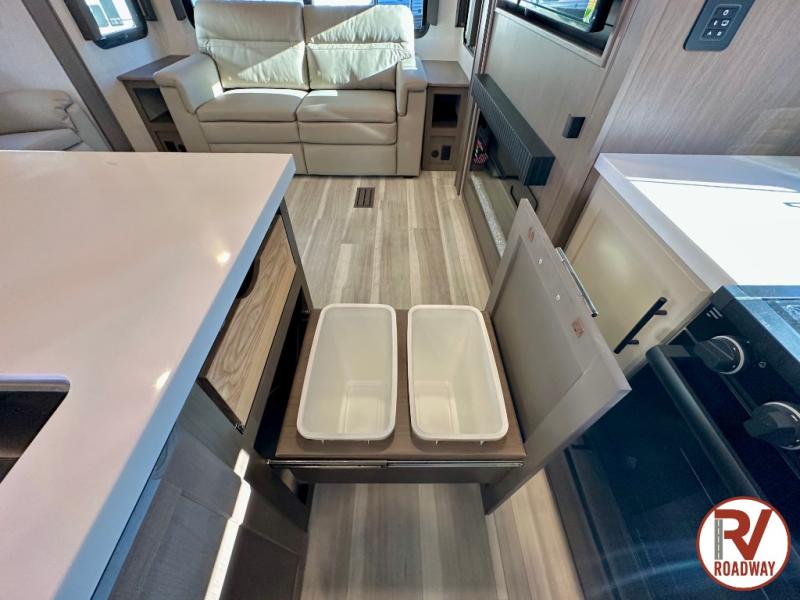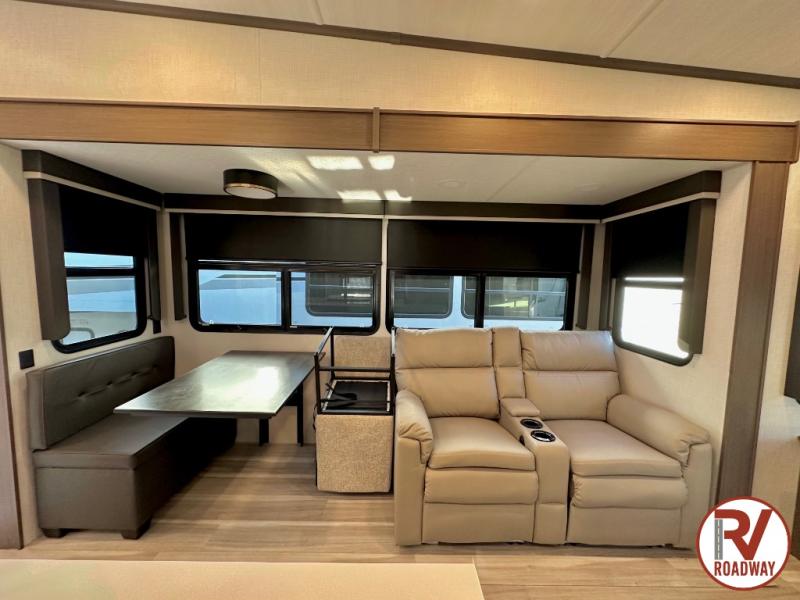 The dual opposing slides in the combined kitchen and living area will give you an open floorplan! You'll sleep on the queen-size bed in the front private bedroom, and there is under-bed storage, a full-height wardrobe, and a dresser with hidden storage for all of your personal belongings. As you spend time in the main living area, you'll appreciate having extra space thanks to the set of opposing slides, and the kitchen island will be easy to work around. You'll be able to relax on the tri-fold sleeper sofa and theater seating while you watch the LED HDTV with an pivoting entertainment door and hidden pantry. There is also a booth dinette with storage drawers, convenient shoe storage right as you enter the unit, and an exterior unobstructed pass-thru storage so nothing gets left behind.
