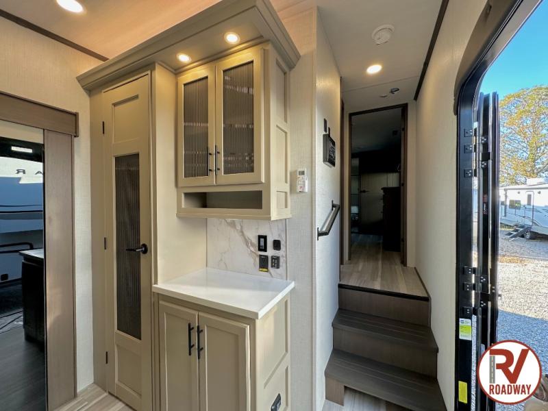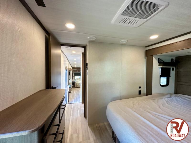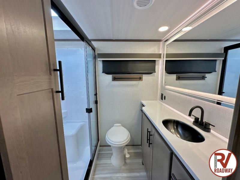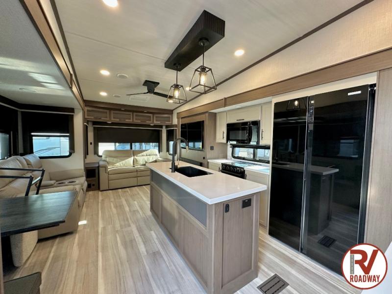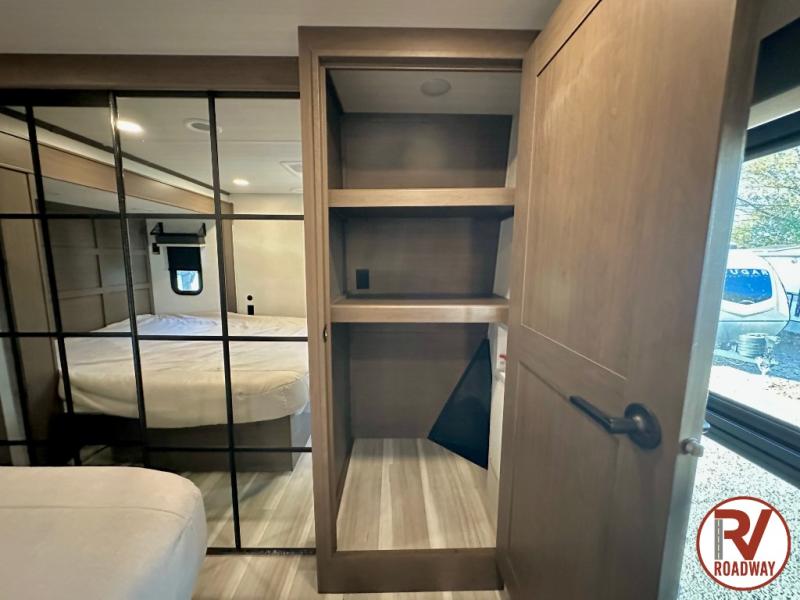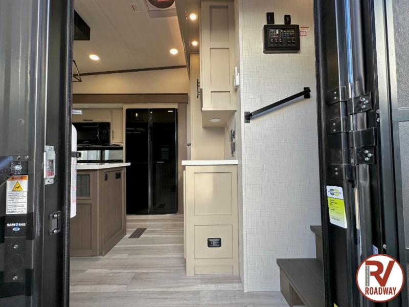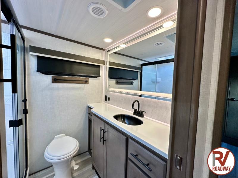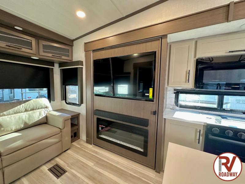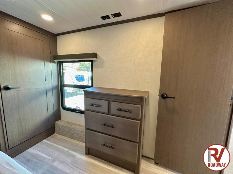 The dual opposing slides in the combined kitchen and living area will give you an open floorplan! You'll sleep on the queen-size bed in the front private bedroom, and there is under-bed storage, a full-height wardrobe, and a dresser with hidden storage for all of your personal belongings. As you spend time in the main living area, you'll appreciate having extra space thanks to the set of opposing slides, and the kitchen island will be easy to work around. You'll be able to relax on the tri-fold sleeper sofa and theater seating while you watch the LED HDTV with an pivoting entertainment door and hidden pantry. There is also a booth dinette with storage drawers, convenient shoe storage right as you enter the unit, and an exterior unobstructed pass-thru storage so nothing gets left behind.