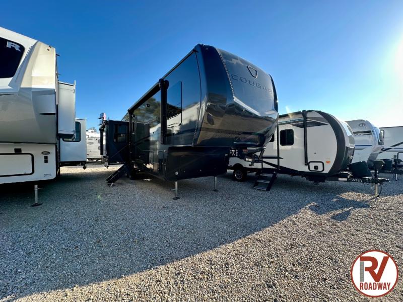 Spend more time having fun and less time worrying about your RV with the Keystone Cougar fifth wheel! These units have all that you will need for excellent vacations. The interior comes with 5/8" one-piece DynaSpan® flooring, tall slide outs for added comfort and head room, night roller shades throughout, and residential, shaker style hardwood cabinet doors and drawers. You will also enjoy decorative crown molding, a 5,500 BTU electric fireplace with thermostat control and remote, and a Max Air exhaust fan with rain sensor. The exterior is also fully outfitted with a convenience center, friction-hinge entry door, electric four-point auto leveling system, and slam-latch baggage doors. Each model is available with the optional Hero Edition. By choosing this edition, you can help support our nation's heros and their families by contributing to the Wounded Warrior Project. This optional package features an industry exclusive full-body paint matte finish, frameless windows, a glass entry door, blackout rims, and green LED exterior accent lighting; see dealer for more details!