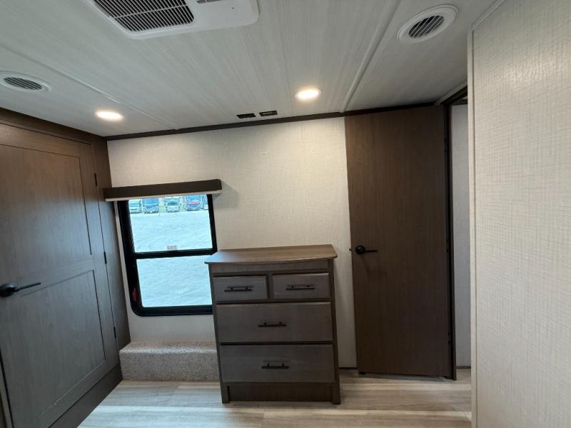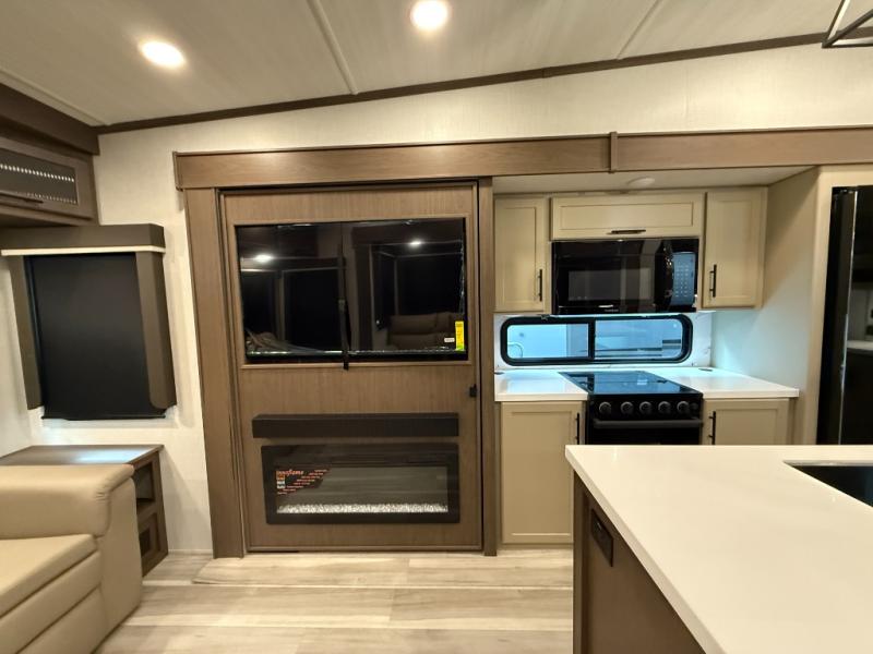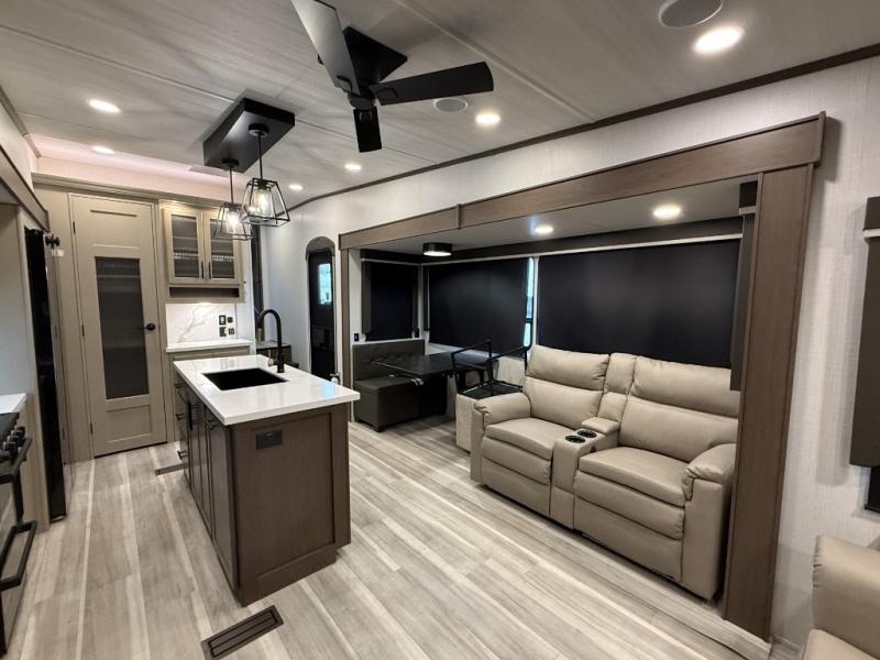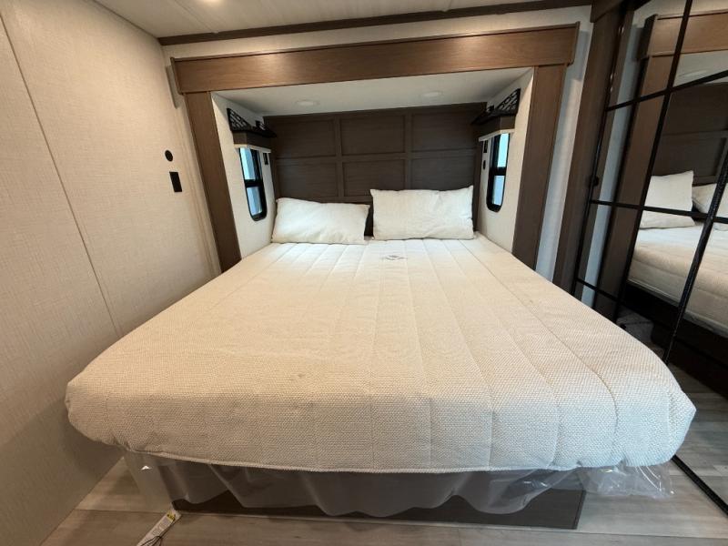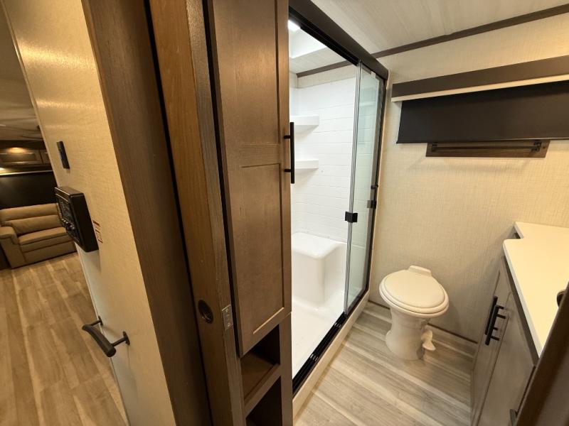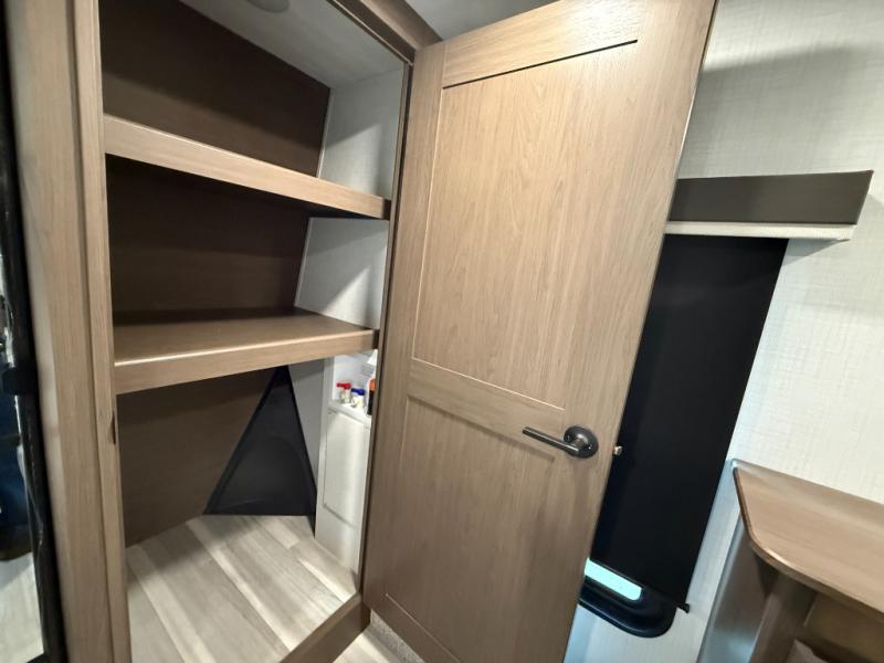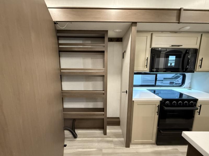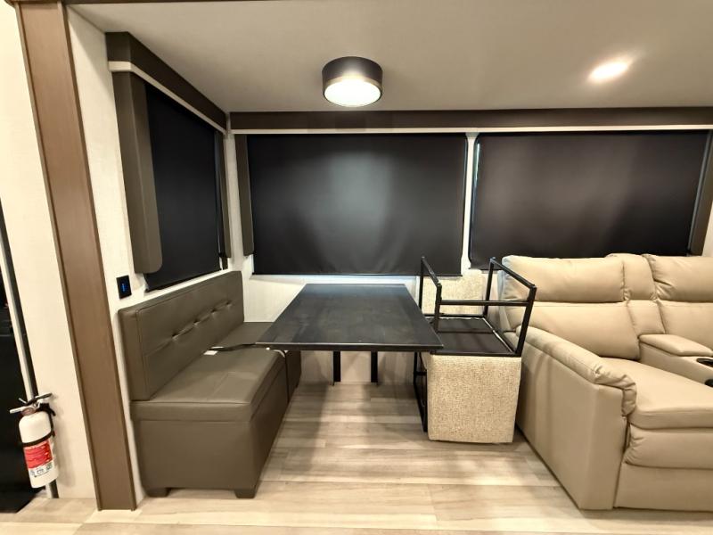 The dual opposing slides in the combined kitchen and living area will give you an open floorplan! You'll sleep on the queen-size bed in the front private bedroom, and there is under-bed storage, a full-height wardrobe, and a dresser with hidden storage for all of your personal belongings. As you spend time in the main living area, you'll appreciate having extra space thanks to the set of opposing slides, and the kitchen island will be easy to work around. You'll be able to relax on the tri-fold sleeper sofa and theater seating while you watch the LED HDTV with an pivoting entertainment door and hidden pantry. There is also a booth dinette with storage drawers, convenient shoe storage right as you enter the unit, and an exterior unobstructed pass-thru storage so nothing gets left behind.