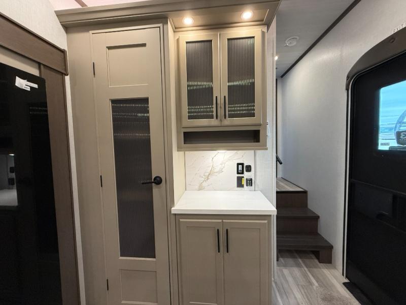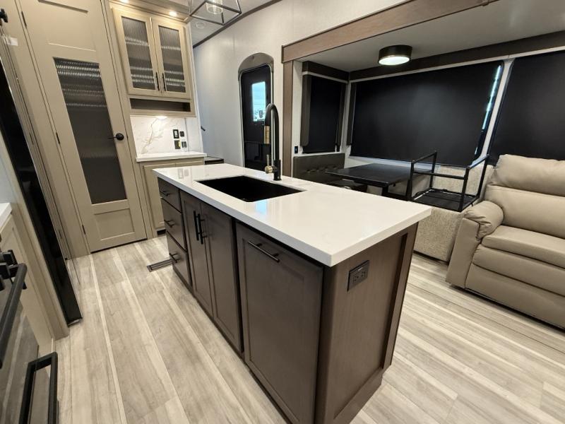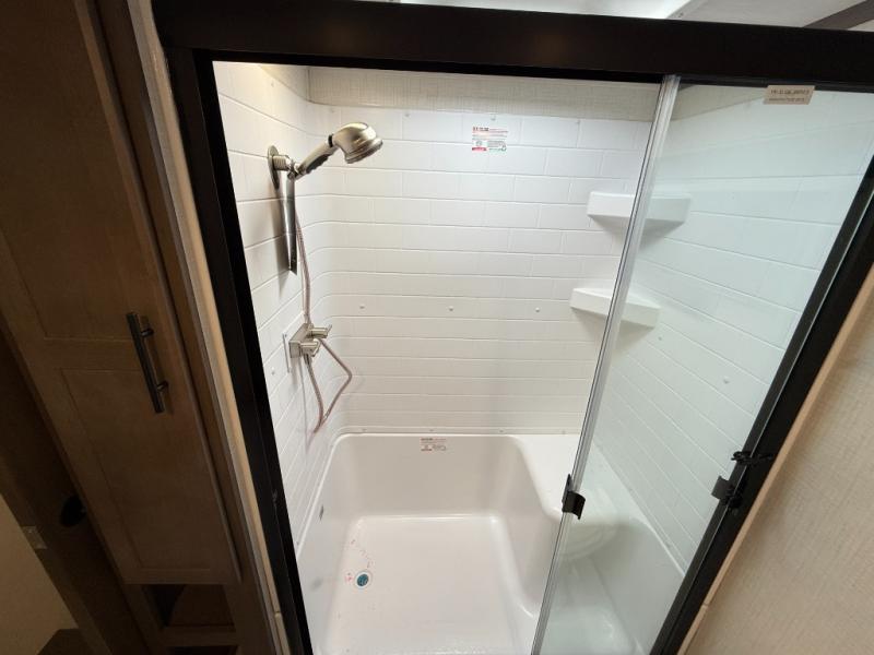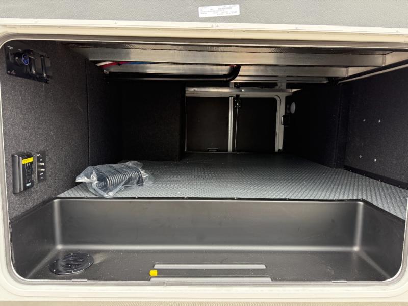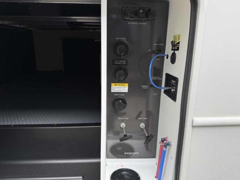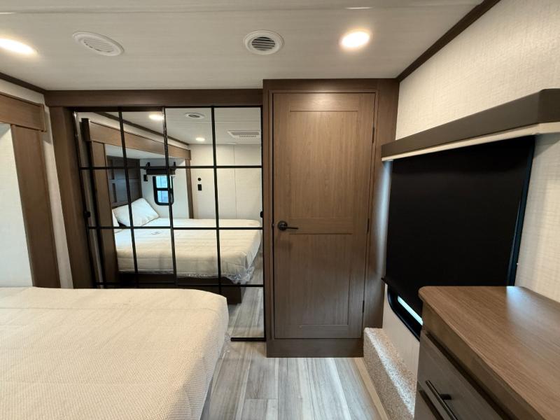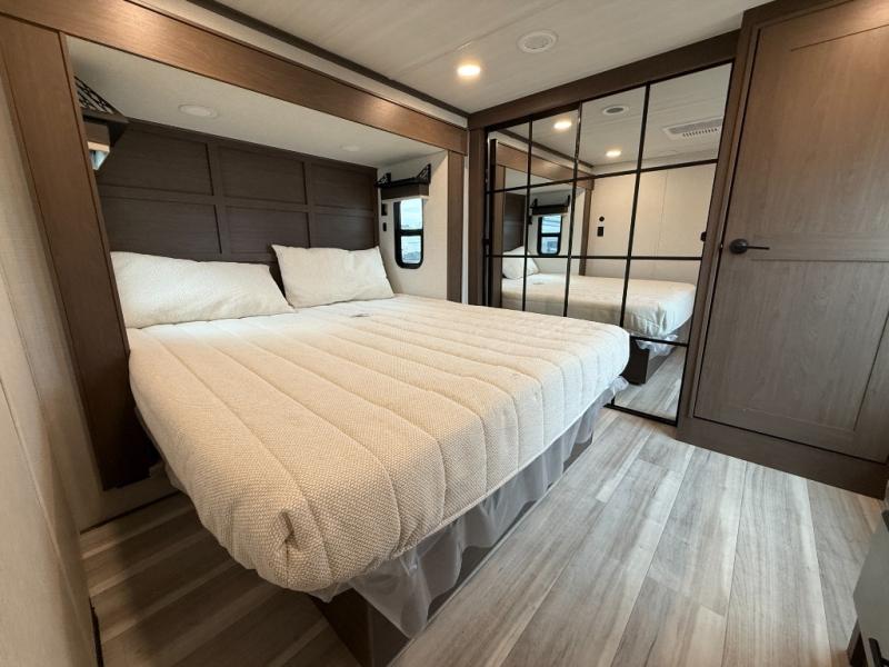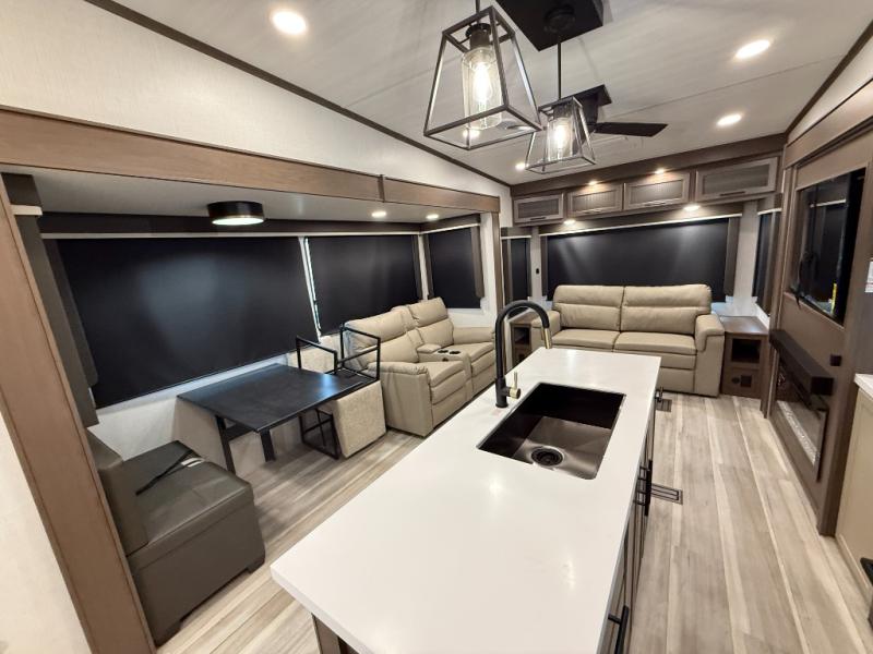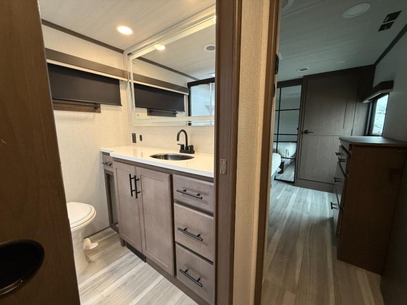 The dual opposing slides in the combined kitchen and living area will give you an open floorplan! You'll sleep on the queen-size bed in the front private bedroom, and there is under-bed storage, a full-height wardrobe, and a dresser with hidden storage for all of your personal belongings. As you spend time in the main living area, you'll appreciate having extra space thanks to the set of opposing slides, and the kitchen island will be easy to work around. You'll be able to relax on the tri-fold sleeper sofa and theater seating while you watch the LED HDTV with an pivoting entertainment door and hidden pantry. There is also a booth dinette with storage drawers, convenient shoe storage right as you enter the unit, and an exterior unobstructed pass-thru storage so nothing gets left behind.