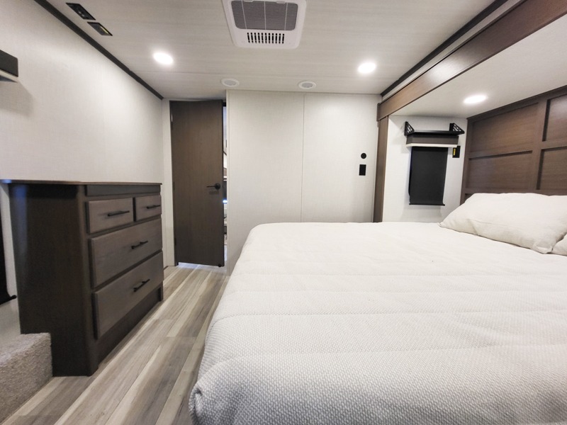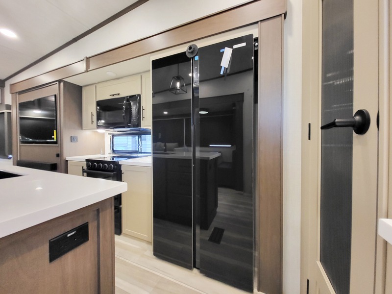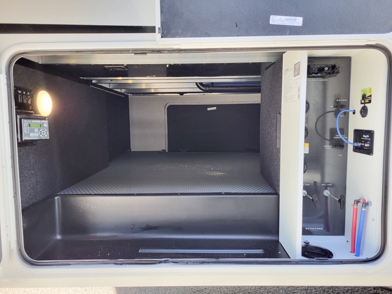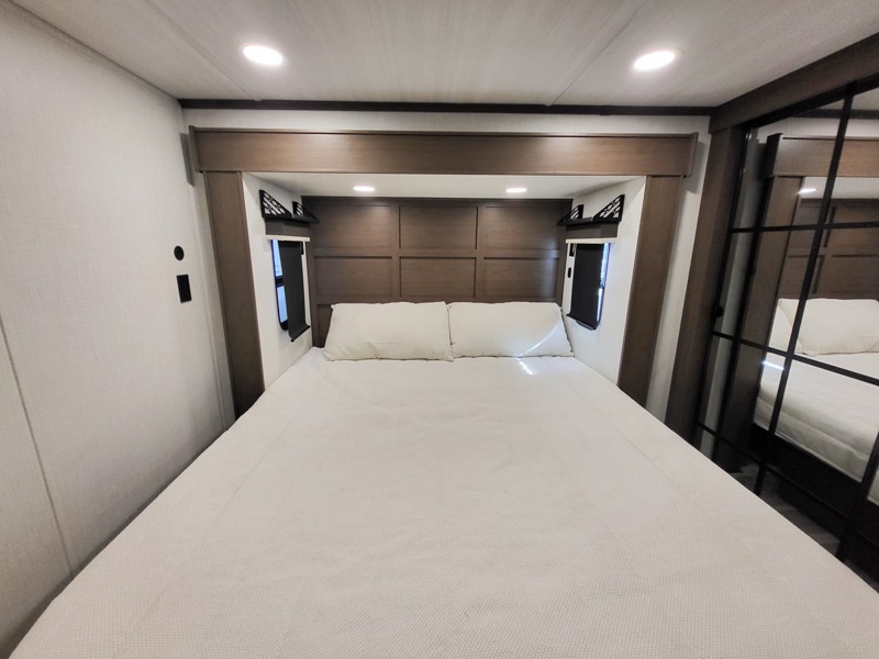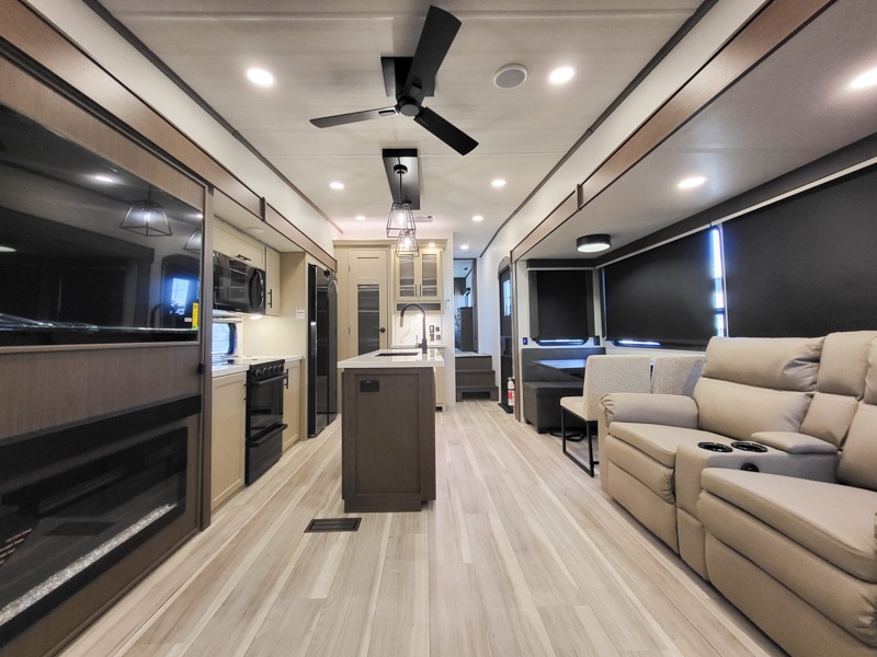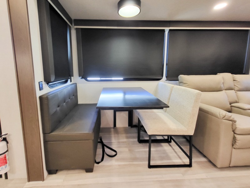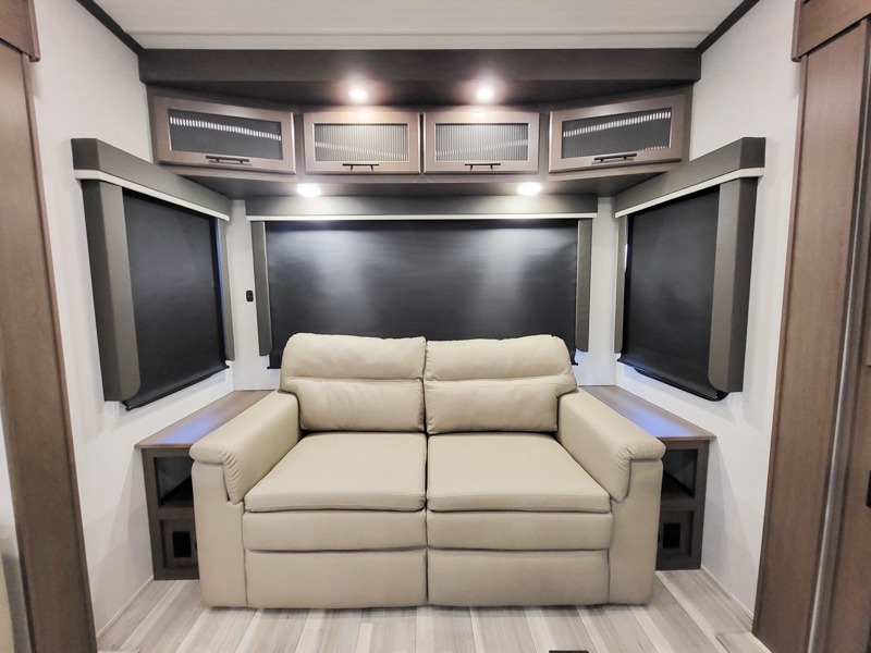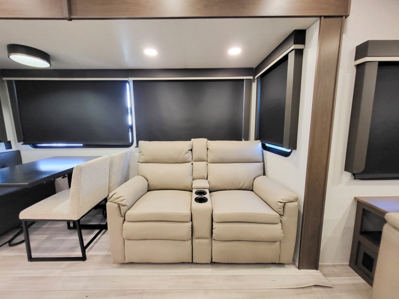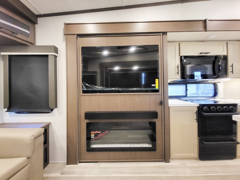The dual opposing slides in the combined kitchen and living area will give you an open floorplan! You'll sleep on the queen-size bed in the front private bedroom, and there is under-bed storage, a full-height wardrobe, and a dresser with hidden storage for all of your personal belongings. As you spend time in the main living area, you'll appreciate having extra space thanks to the set of opposing slides, and the kitchen island will be easy to work around. You'll be able to relax on the tri-fold sleeper sofa and theater seating while you watch the LED HDTV with an pivoting entertainment door and hidden pantry. There is also a booth dinette with storage drawers, convenient shoe storage right as you enter the unit, and an exterior unobstructed pass-thru storage so nothing gets left behind.