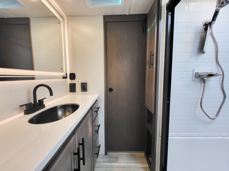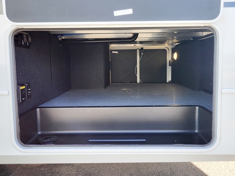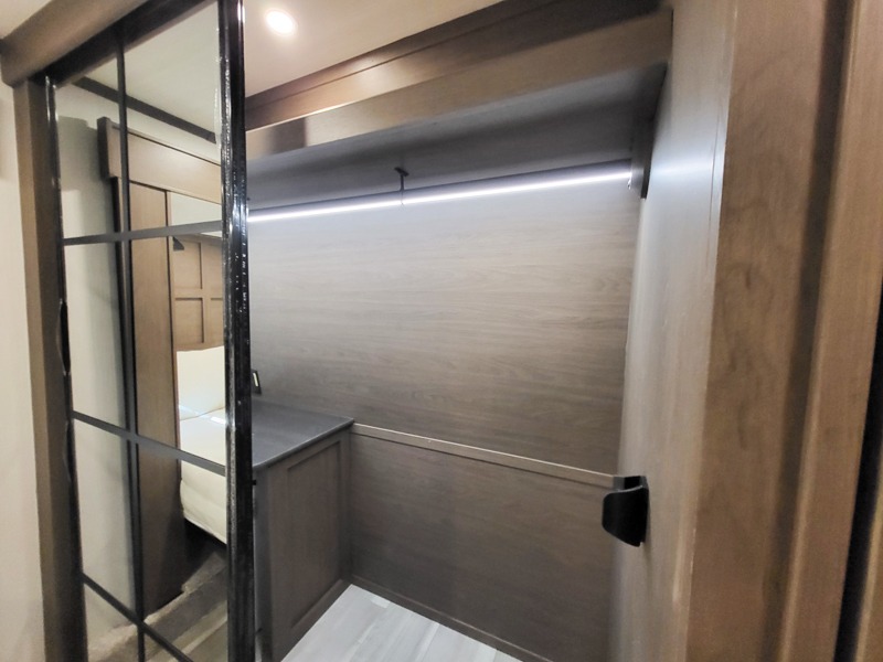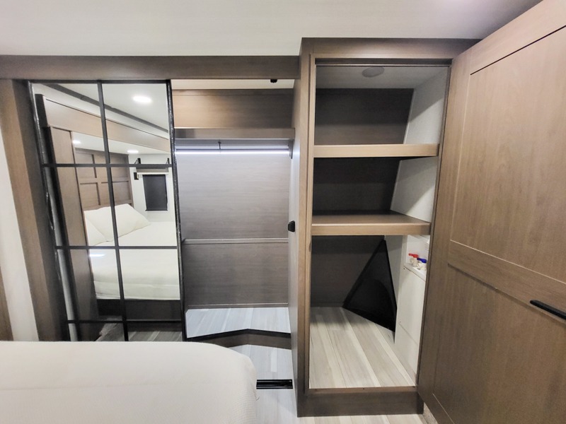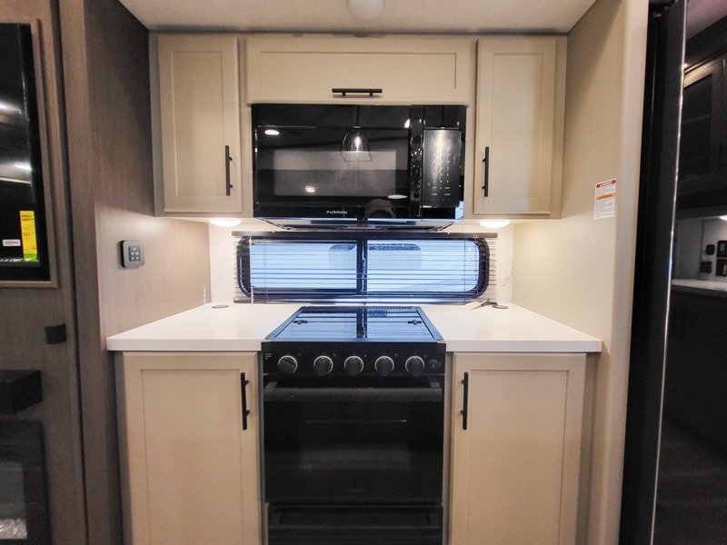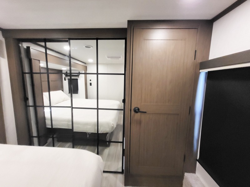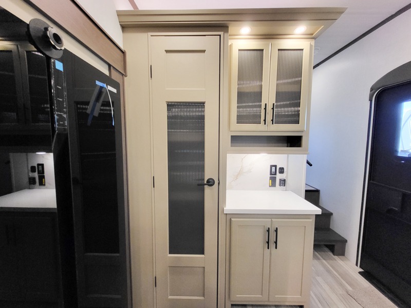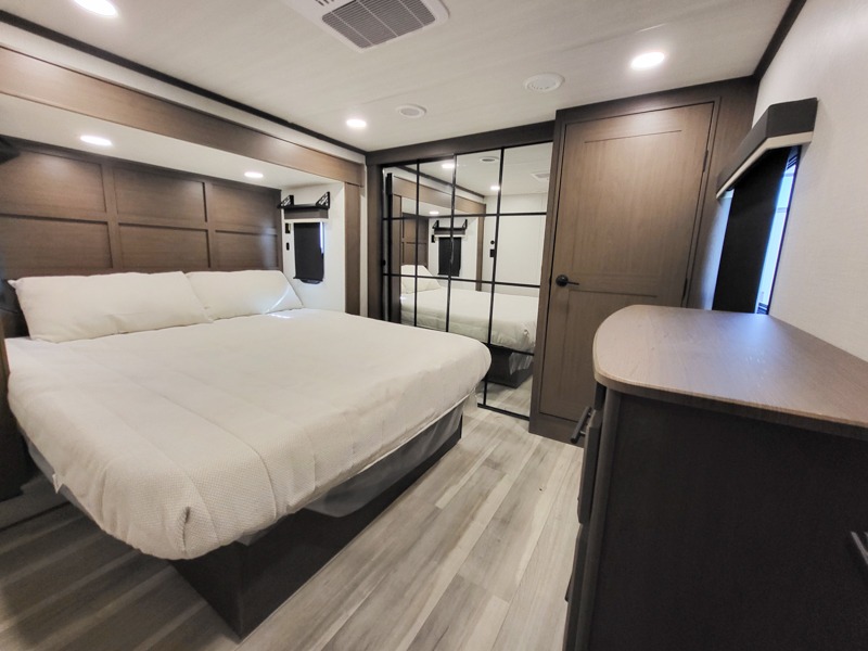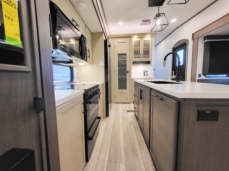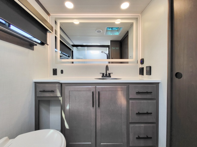 The dual opposing slides in the combined kitchen and living area will give you an open floorplan! You'll sleep on the queen-size bed in the front private bedroom, and there is under-bed storage, a full-height wardrobe, and a dresser with hidden storage for all of your personal belongings. As you spend time in the main living area, you'll appreciate having extra space thanks to the set of opposing slides, and the kitchen island will be easy to work around. You'll be able to relax on the tri-fold sleeper sofa and theater seating while you watch the LED HDTV with an pivoting entertainment door and hidden pantry. There is also a booth dinette with storage drawers, convenient shoe storage right as you enter the unit, and an exterior unobstructed pass-thru storage so nothing gets left behind.