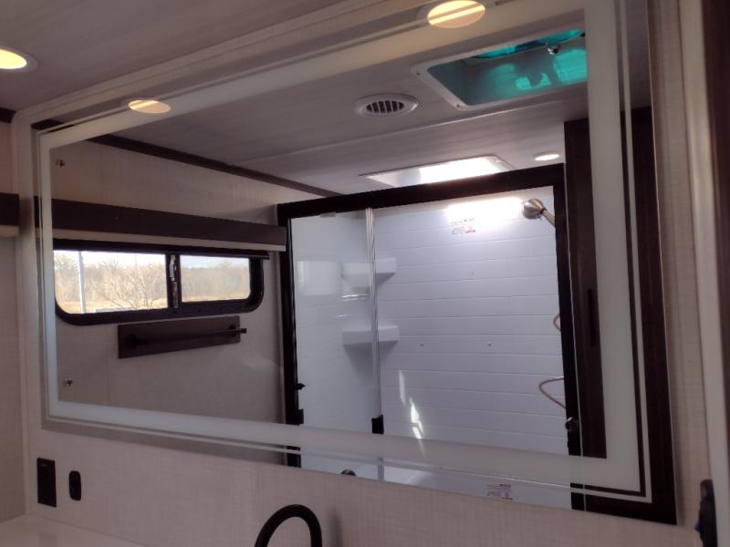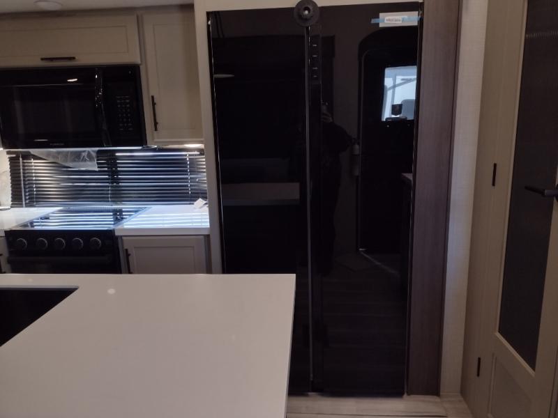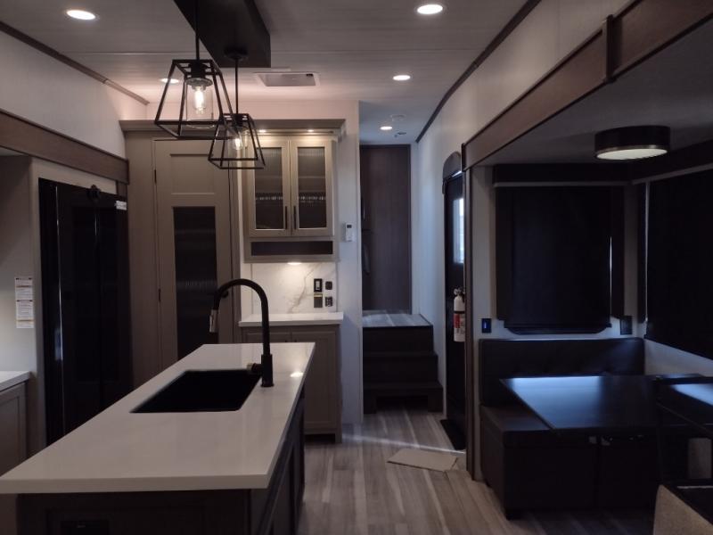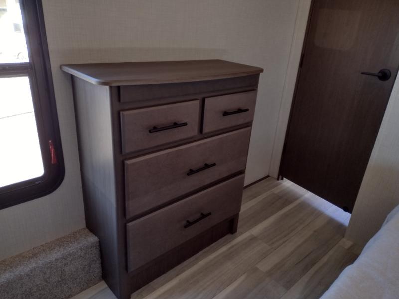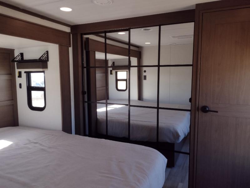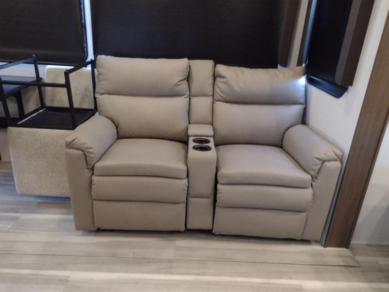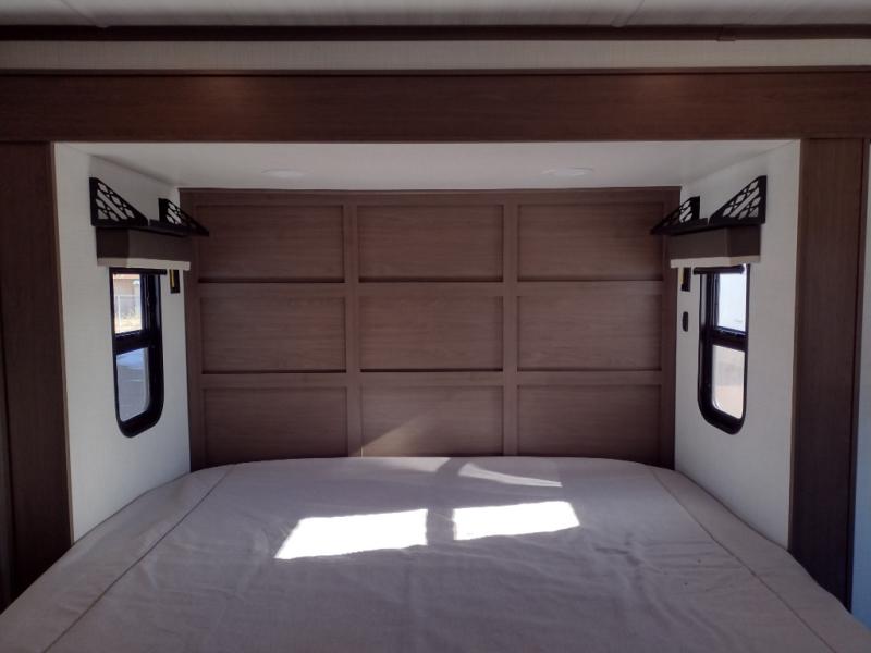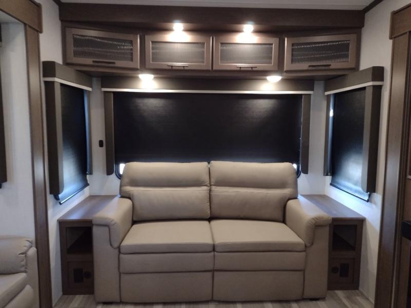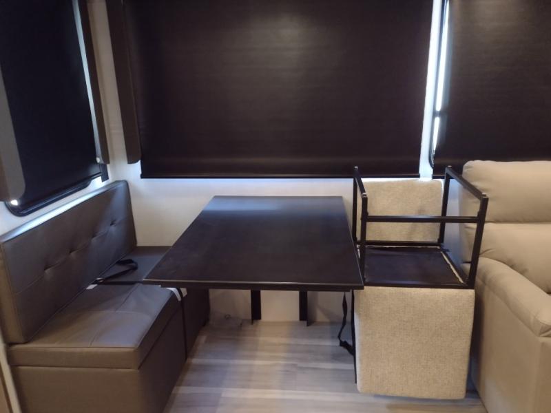 The dual opposing slides in the combined kitchen and living area will give you an open floorplan! You'll sleep on the queen-size bed in the front private bedroom, and there is under-bed storage, a full-height wardrobe, and a dresser with hidden storage for all of your personal belongings. As you spend time in the main living area, you'll appreciate having extra space thanks to the set of opposing slides, and the kitchen island will be easy to work around. You'll be able to relax on the tri-fold sleeper sofa and theater seating while you watch the LED HDTV with an pivoting entertainment door and hidden pantry. There is also a booth dinette with storage drawers, convenient shoe storage right as you enter the unit, and an exterior unobstructed pass-thru storage so nothing gets left behind.