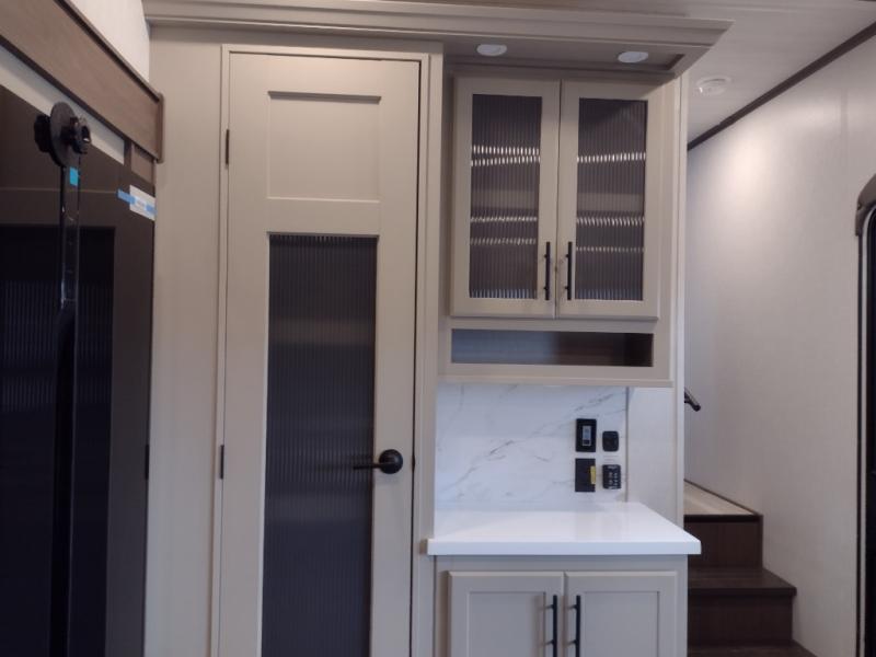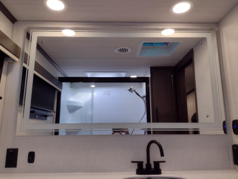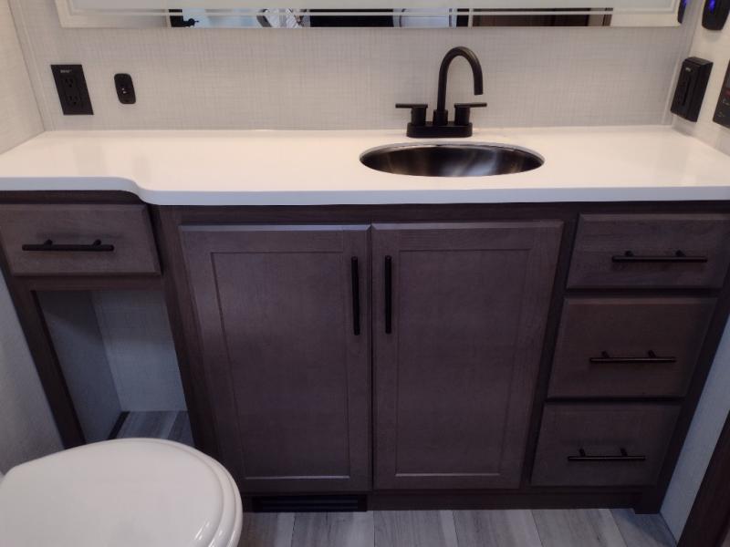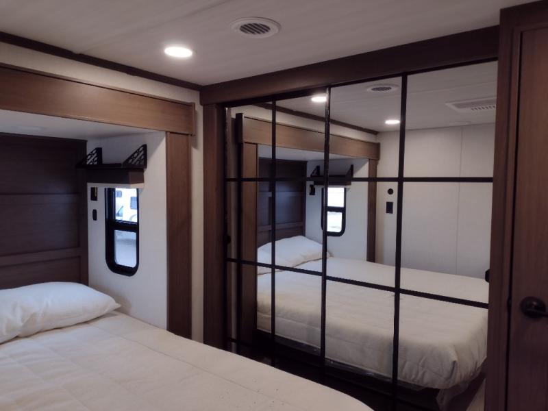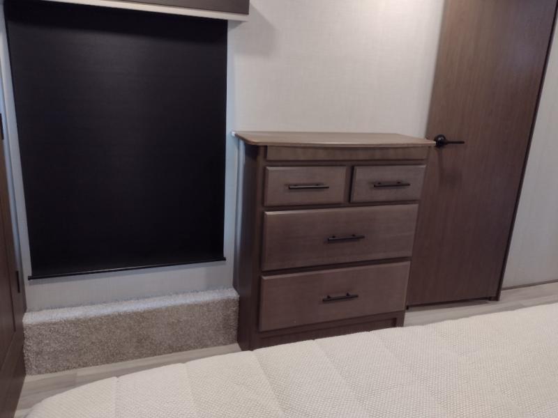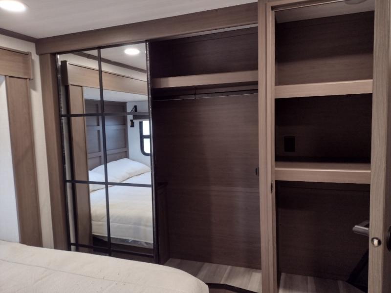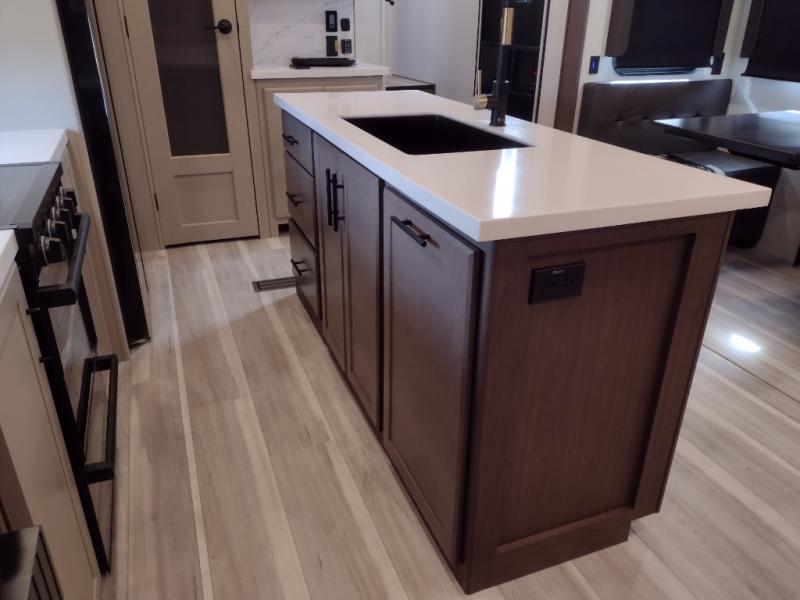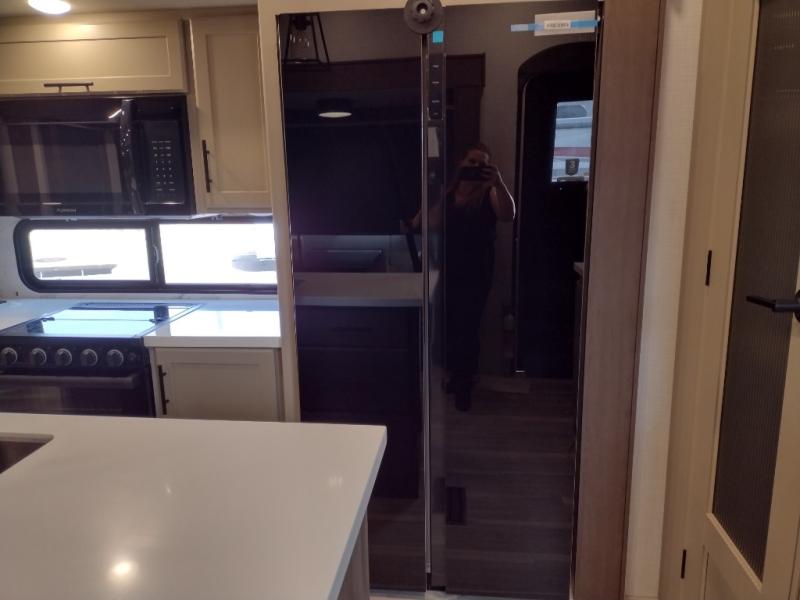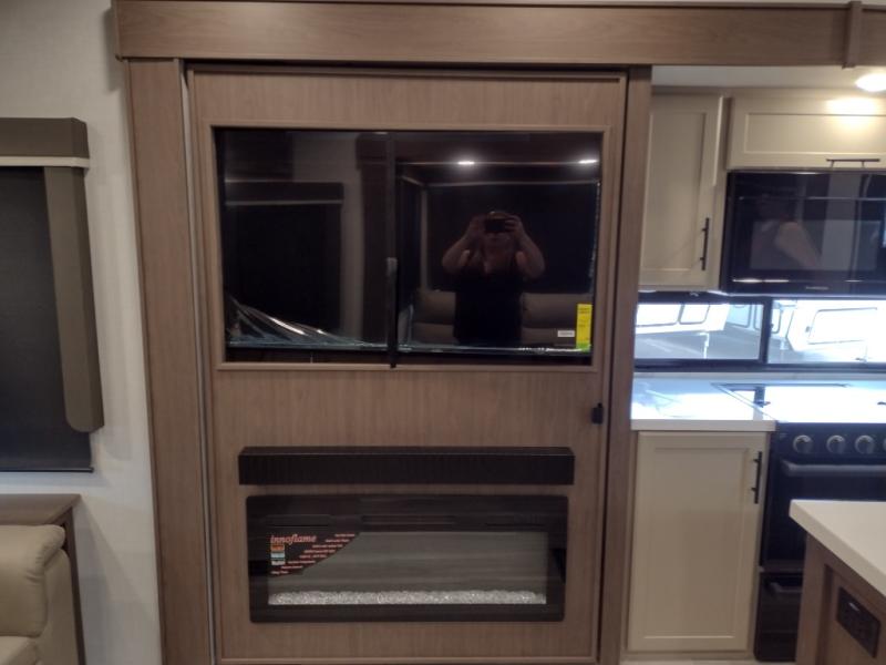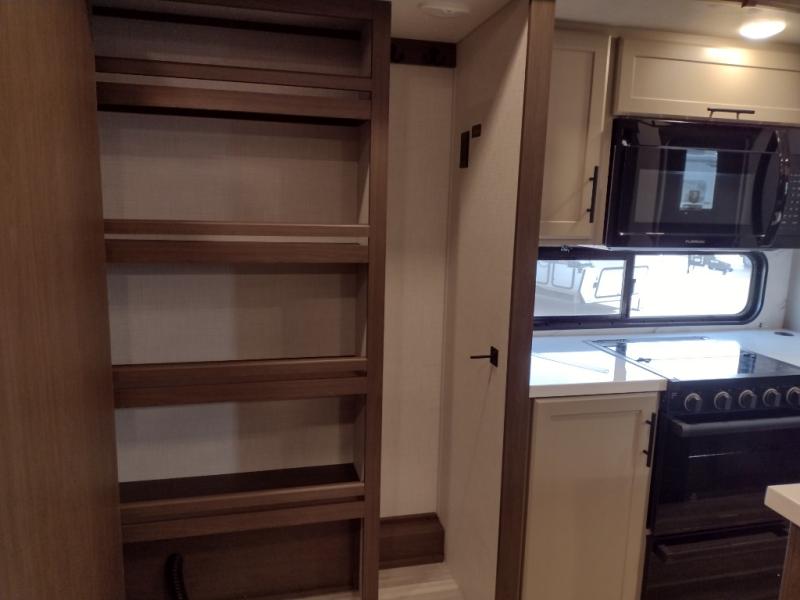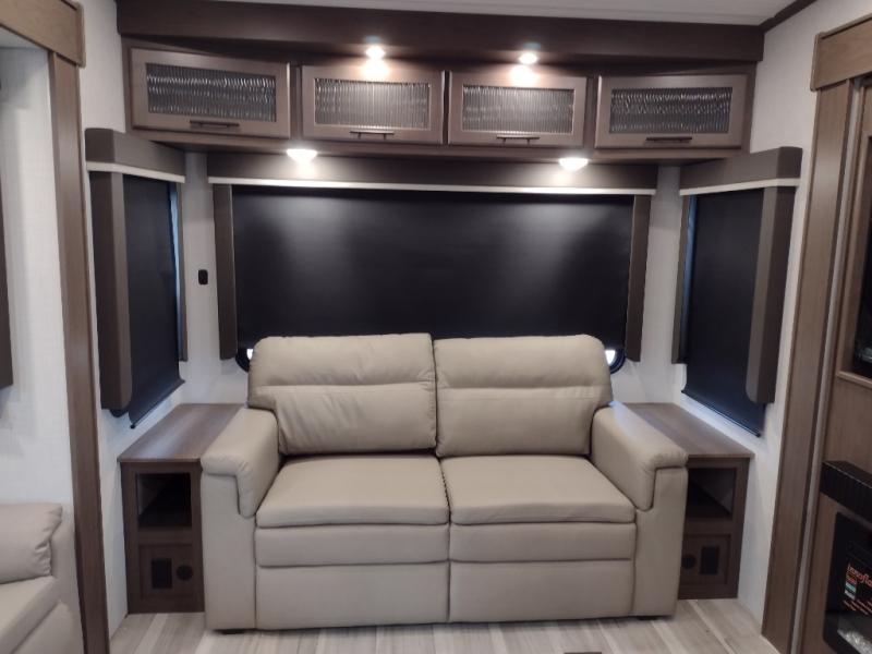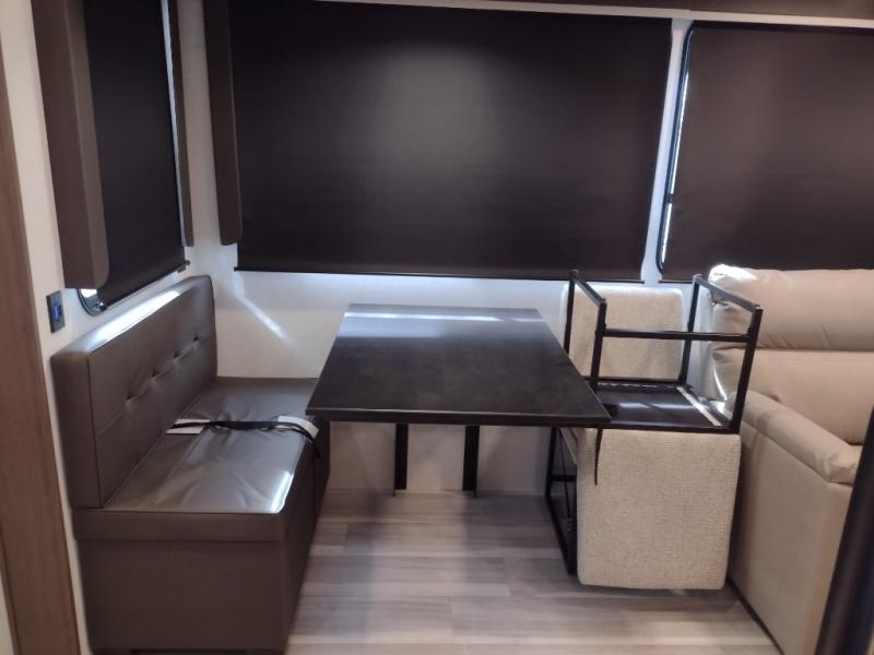 The dual opposing slides in the combined kitchen and living area will give you an open floorplan! You'll sleep on the queen-size bed in the front private bedroom, and there is under-bed storage, a full-height wardrobe, and a dresser with hidden storage for all of your personal belongings. As you spend time in the main living area, you'll appreciate having extra space thanks to the set of opposing slides, and the kitchen island will be easy to work around. You'll be able to relax on the tri-fold sleeper sofa and theater seating while you watch the LED HDTV with an pivoting entertainment door and hidden pantry. There is also a booth dinette with storage drawers, convenient shoe storage right as you enter the unit, and an exterior unobstructed pass-thru storage so nothing gets left behind.