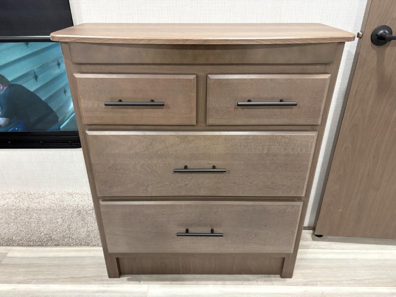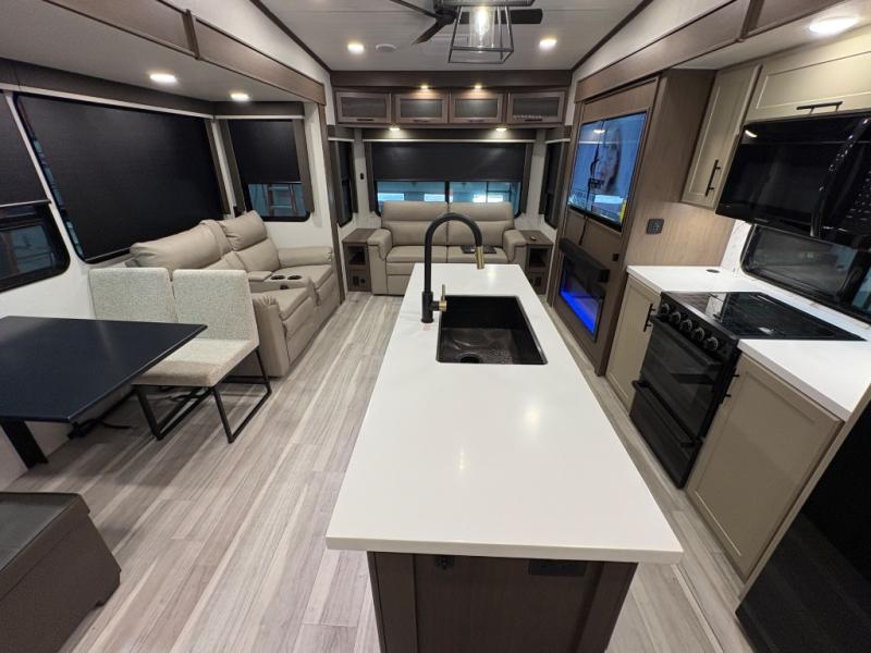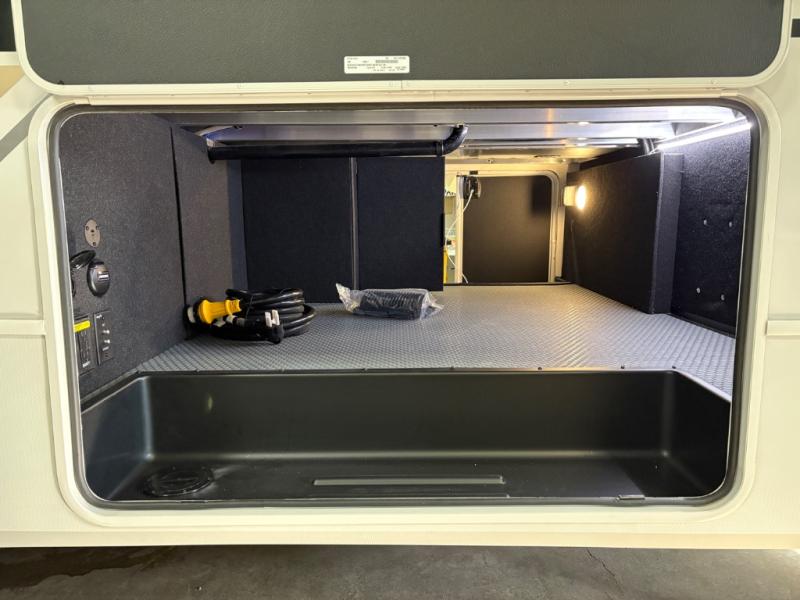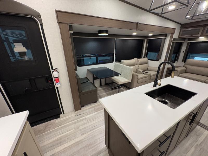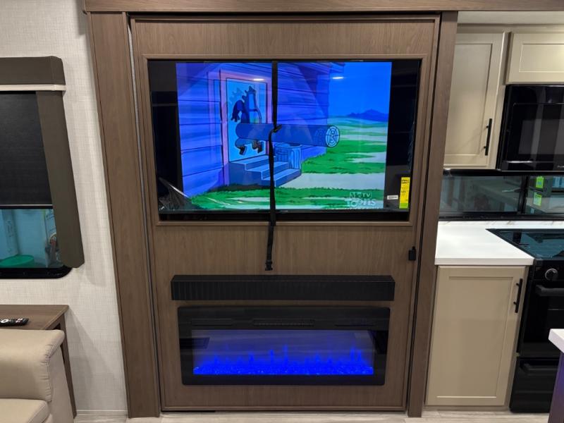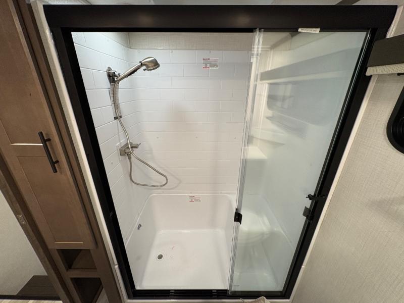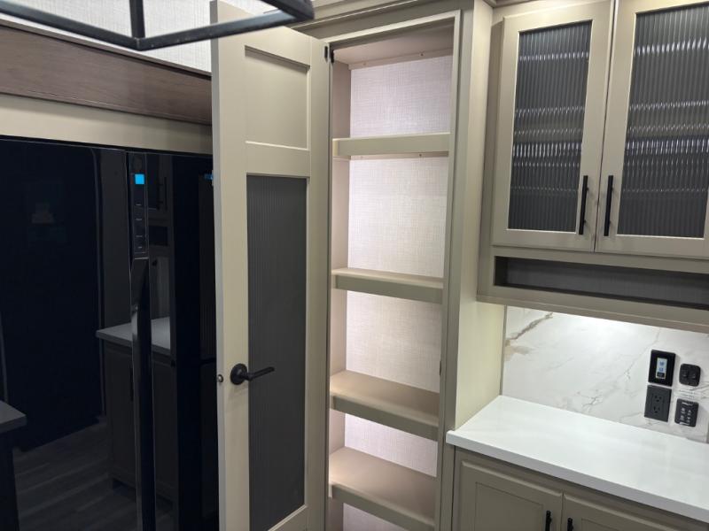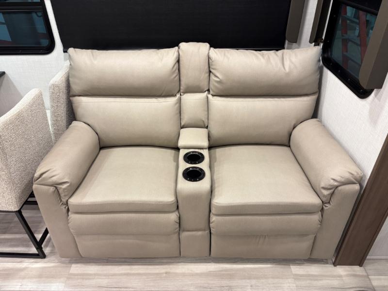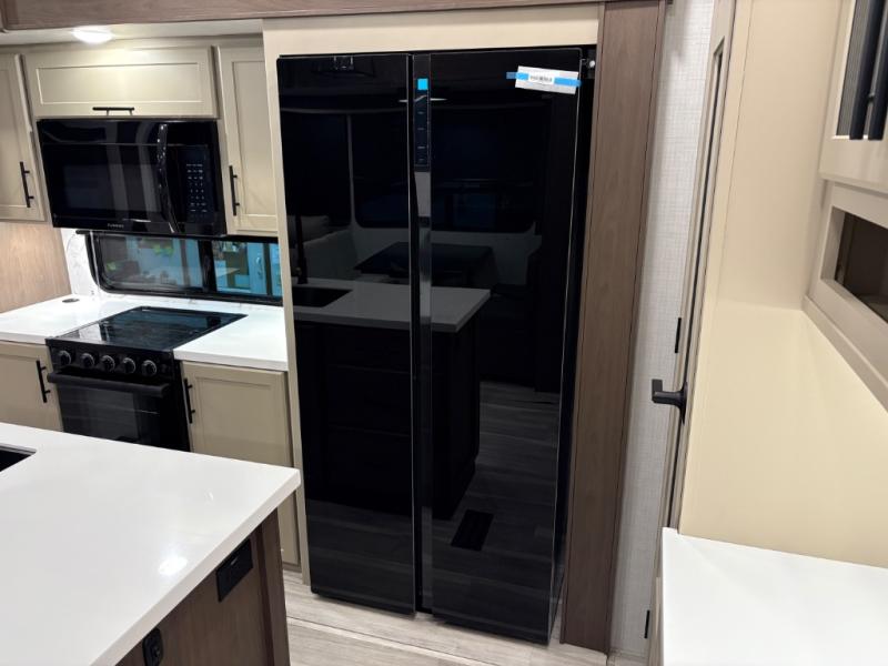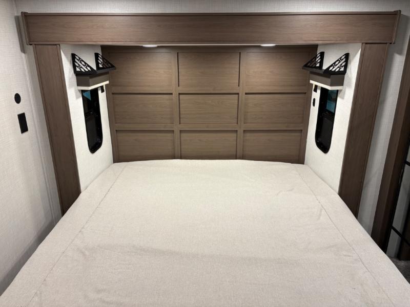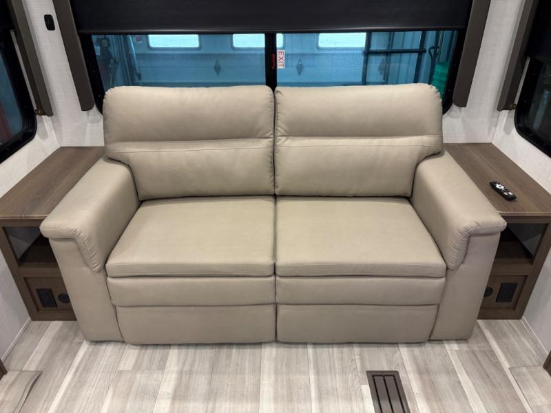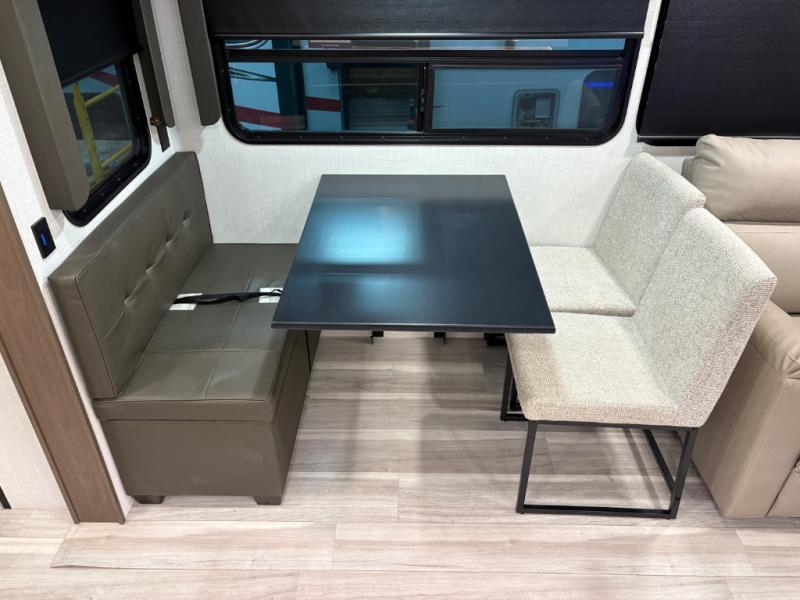 The dual opposing slides in the combined kitchen and living area will give you an open floorplan! You'll sleep on the queen-size bed in the front private bedroom, and there is under-bed storage, a full-height wardrobe, and a dresser with hidden storage for all of your personal belongings. As you spend time in the main living area, you'll appreciate having extra space thanks to the set of opposing slides, and the kitchen island will be easy to work around. You'll be able to relax on the tri-fold sleeper sofa and theater seating while you watch the LED HDTV with an pivoting entertainment door and hidden pantry. There is also a booth dinette with storage drawers, convenient shoe storage right as you enter the unit, and an exterior unobstructed pass-thru storage so nothing gets left behind.