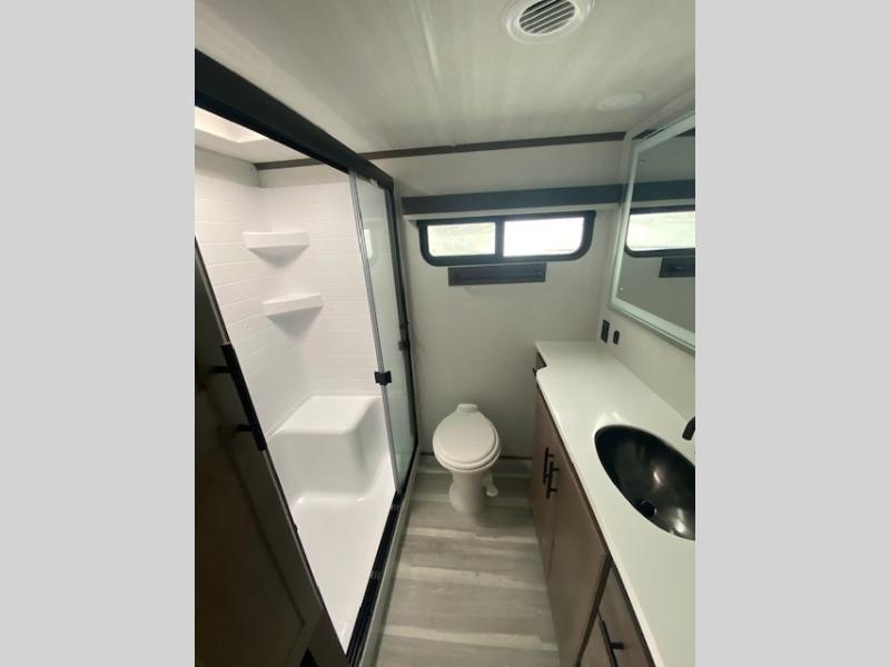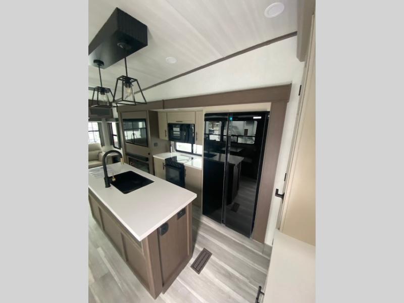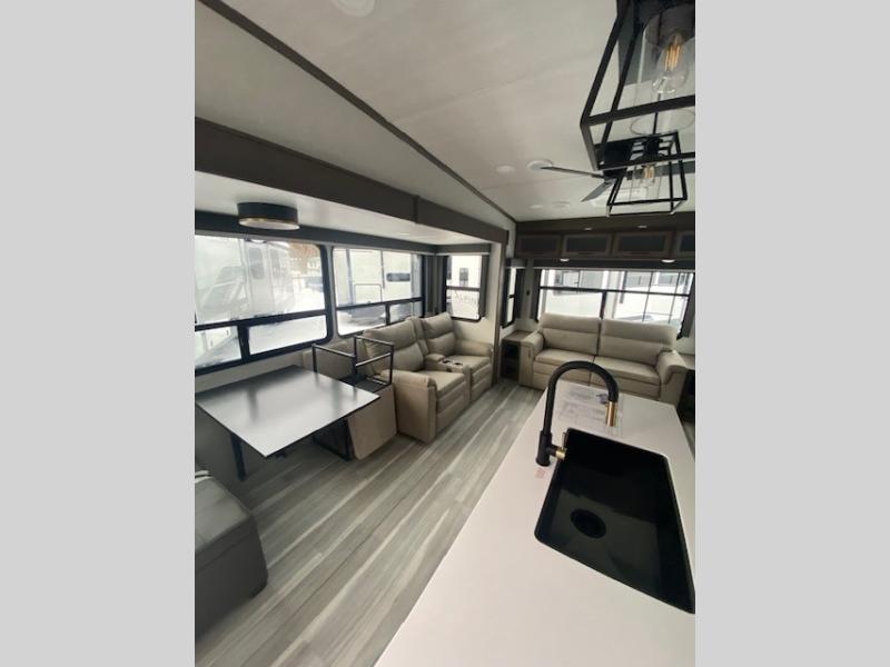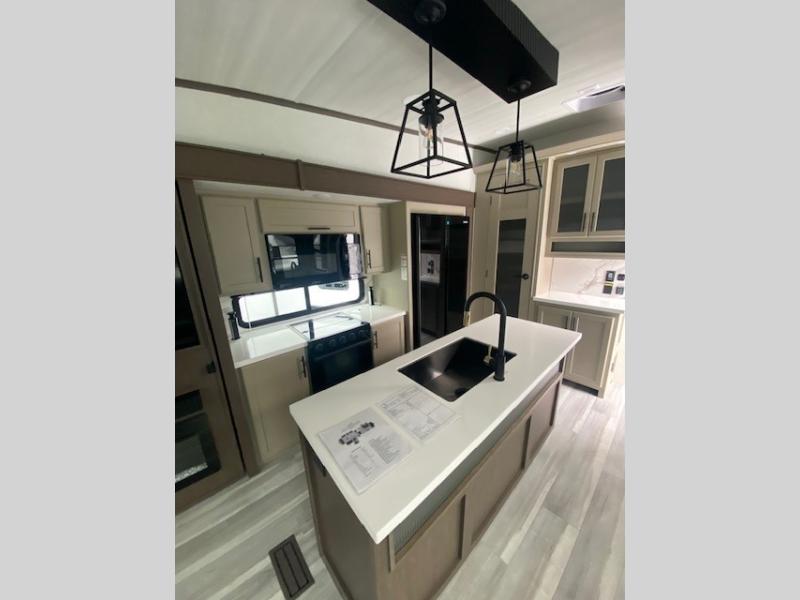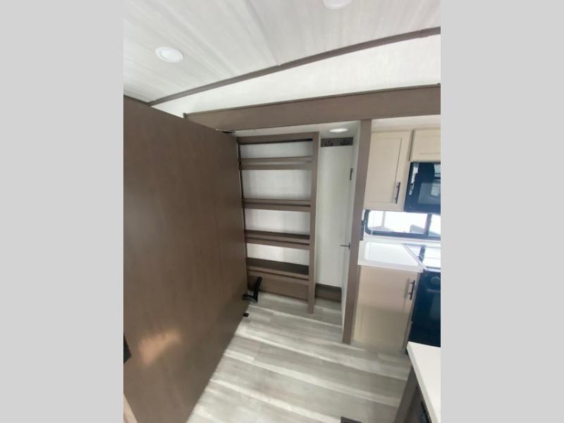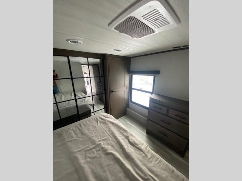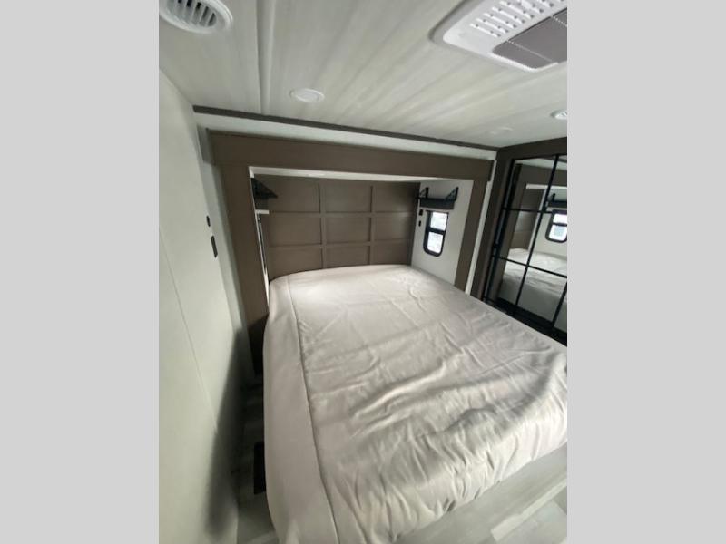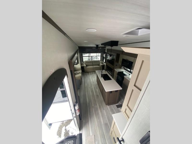 The dual opposing slides in the combined kitchen and living area will give you an open floorplan! You'll sleep on the queen-size bed in the front private bedroom, and there is under-bed storage, a full-height wardrobe, and a dresser with hidden storage for all of your personal belongings. As you spend time in the main living area, you'll appreciate having extra space thanks to the set of opposing slides, and the kitchen island will be easy to work around. You'll be able to relax on the tri-fold sleeper sofa and theater seating while you watch the LED HDTV with an pivoting entertainment door and hidden pantry. There is also a booth dinette with storage drawers, convenient shoe storage right as you enter the unit, and an exterior unobstructed pass-thru storage so nothing gets left behind.