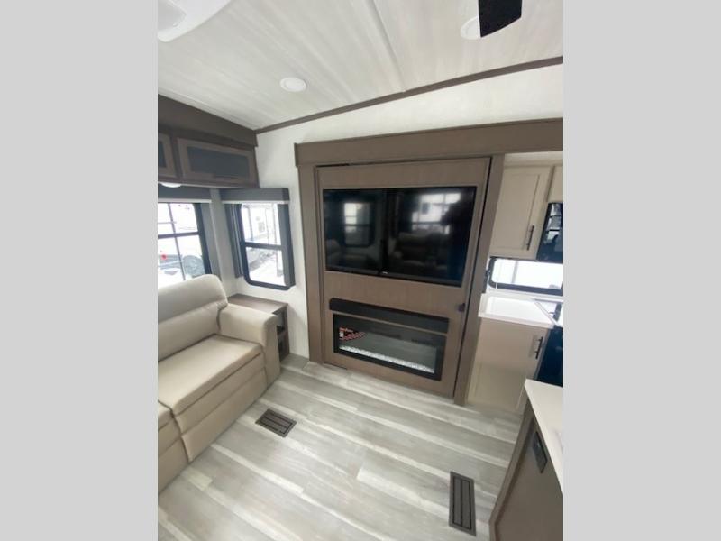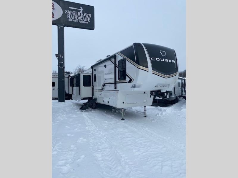 Spend more time having fun and less time worrying about your RV with the Keystone Cougar fifth wheel! These units have all that you will need for excellent vacations. The interior comes hardwood cabinet doors, solid surface kitchen countertops, an Oxygenics shower head and hose, plus a Vent-All window system. You will also appreciate the 12V charging stations throughout, the dual zone Bluetooth audio system, and the on-demand water heater for added comfort. The exterior is also fully outfitted with a convenience center, MaxTurn technology, Lippert axles with anti-lock braking system, and a Curt Road Armor shock absorbing equalizer for smooth towing. Each model is available with the optional Hero Edition. By choosing this edition, you can help support our nation's heros and their families by contributing to the Wounded Warrior Project. This optional package features an industry exclusive full-body paint matte finish, frameless windows, a glass entry door, blackout rims, and green LED exterior accent lighting; see dealer for more details!