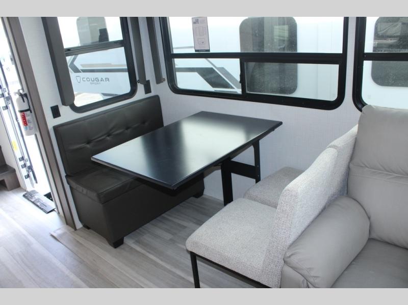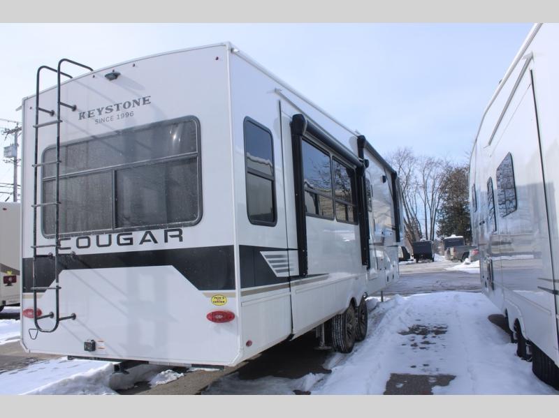 Spend more time having fun and less time worrying about your RV with the Keystone Cougar fifth wheel! These units have all that you will need for excellent vacations. The interior comes hardwood cabinet doors, solid surface kitchen countertops, an Oxygenics shower head and hose, plus a Vent-All window system. You will also appreciate the 12V charging stations throughout, the dual zone Bluetooth audio system, and the on-demand water heater for added comfort. The exterior is also fully outfitted with a convenience center, MaxTurn technology, Lippert axles with anti-lock braking system, and a Curt Road Armor shock absorbing equalizer for smooth towing. Each model is available with the optional Hero Edition. By choosing this edition, you can help support our nation's heros and their families by contributing to the Wounded Warrior Project. This optional package features an industry exclusive full-body paint matte finish, frameless windows, a glass entry door, blackout rims, and green LED exterior accent lighting; see dealer for more details!