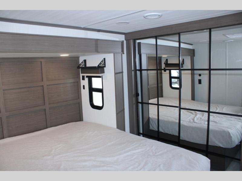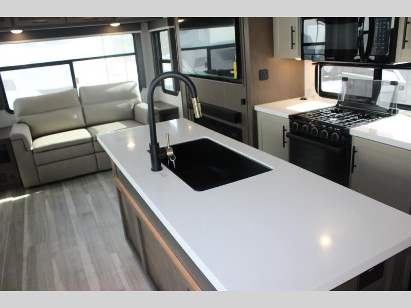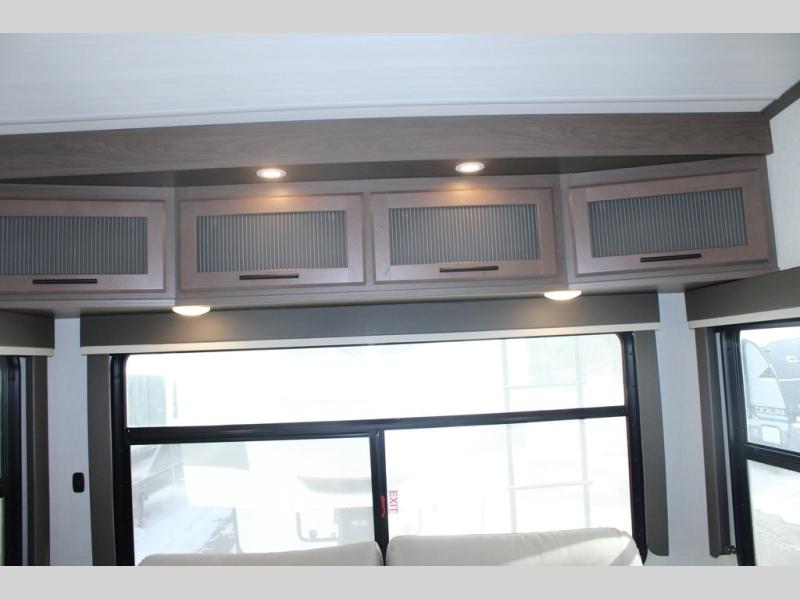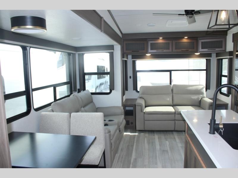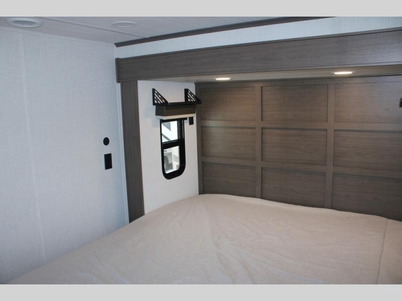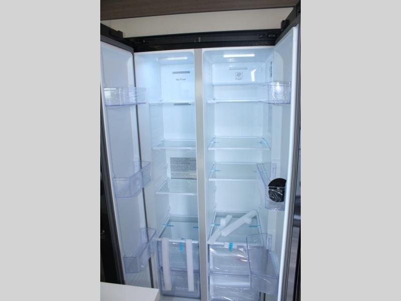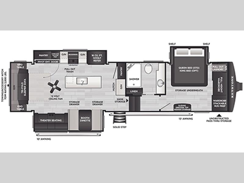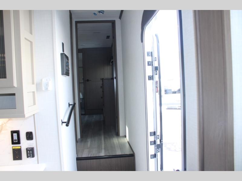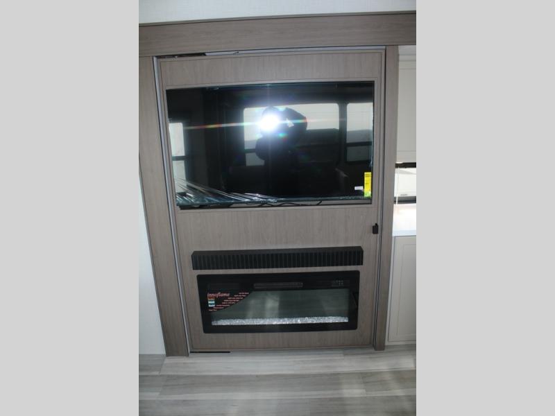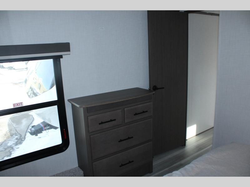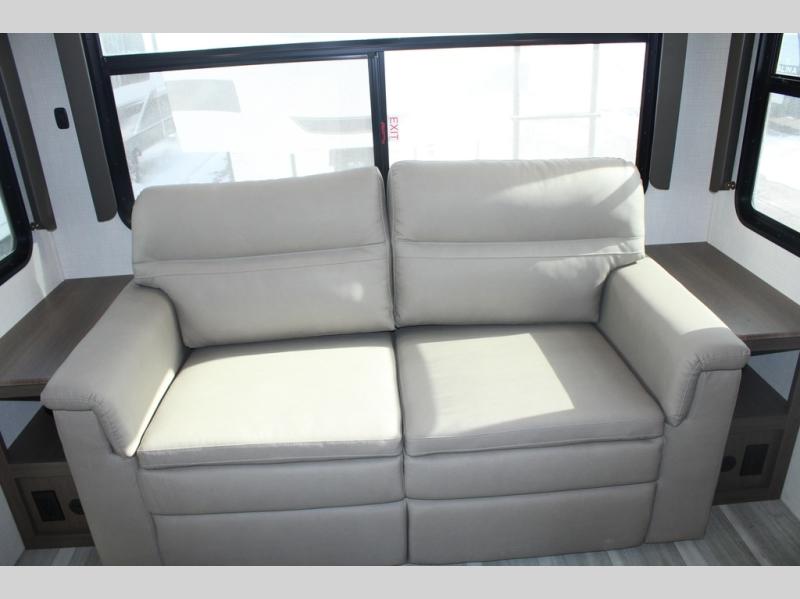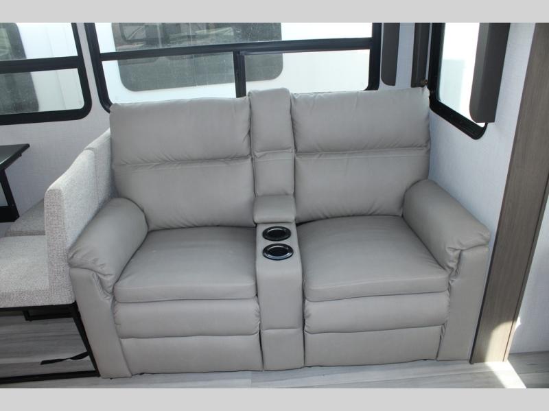 The dual opposing slides in the combined kitchen and living area will give you an open floorplan! You'll sleep on the queen-size bed in the front private bedroom, and there is under-bed storage, a full-height wardrobe, and a dresser with hidden storage for all of your personal belongings. As you spend time in the main living area, you'll appreciate having extra space thanks to the set of opposing slides, and the kitchen island will be easy to work around. You'll be able to relax on the tri-fold sleeper sofa and theater seating while you watch the LED HDTV with an pivoting entertainment door and hidden pantry. There is also a booth dinette with storage drawers, convenient shoe storage right as you enter the unit, and an exterior unobstructed pass-thru storage so nothing gets left behind.