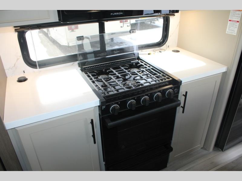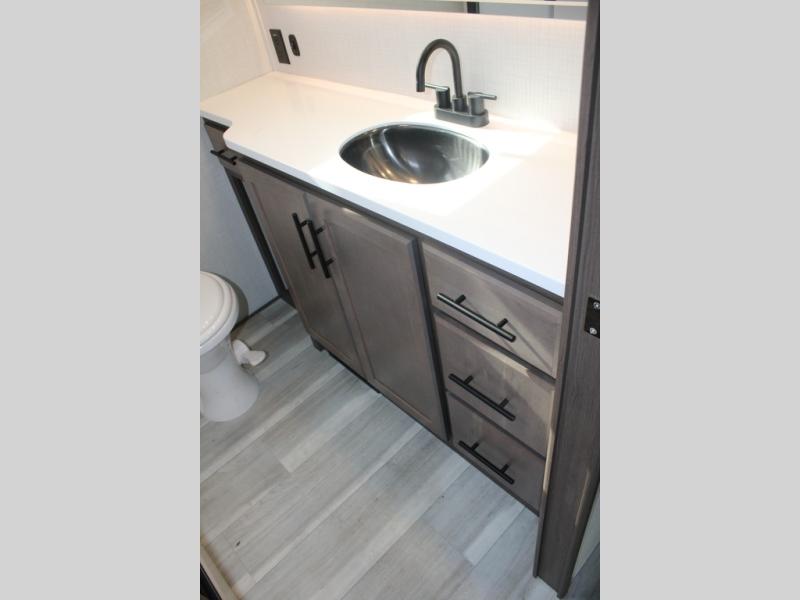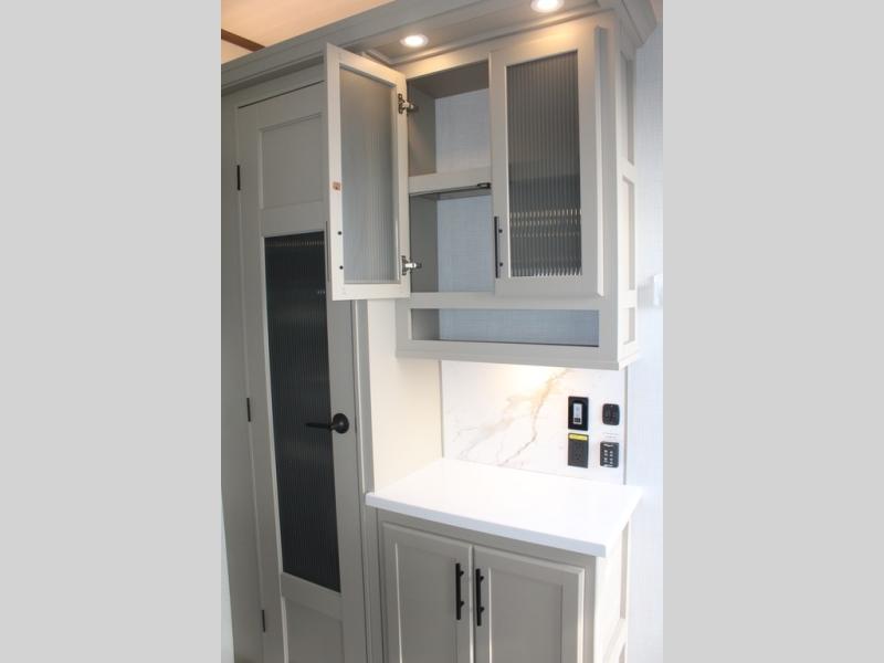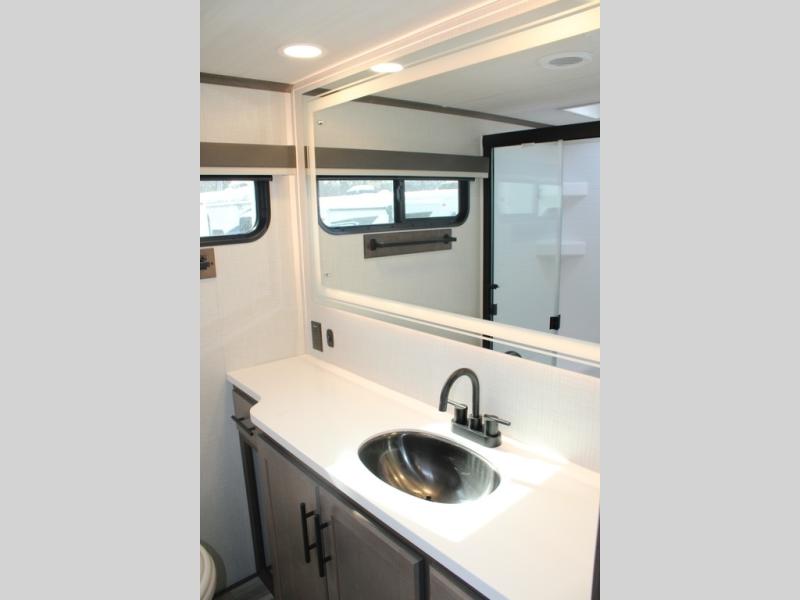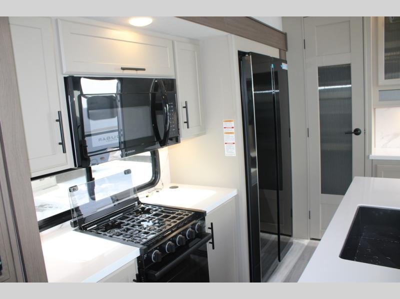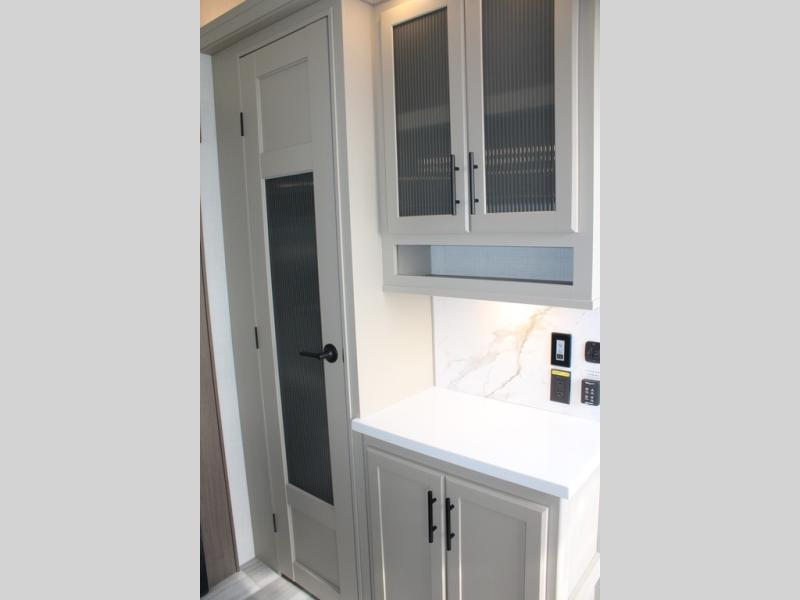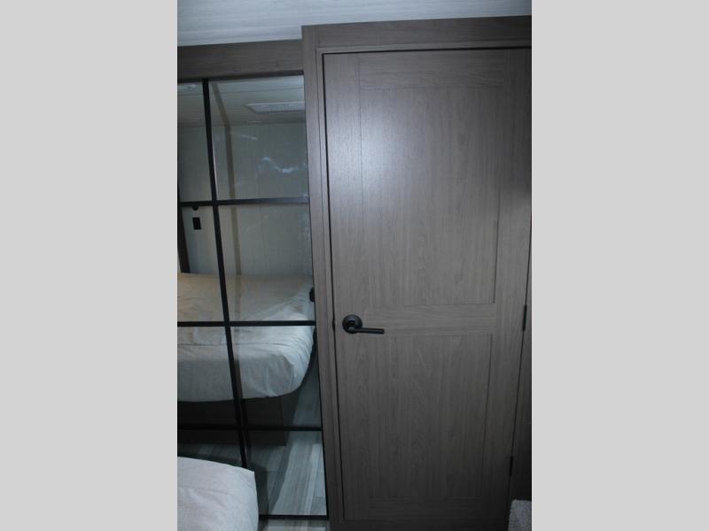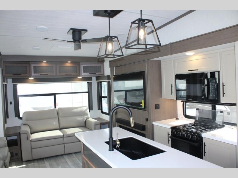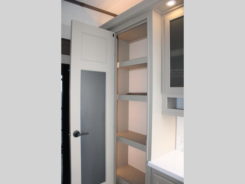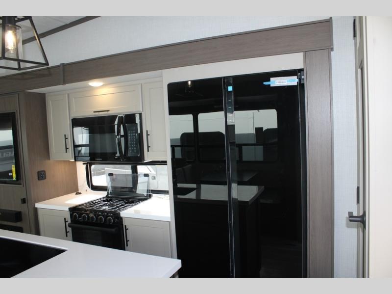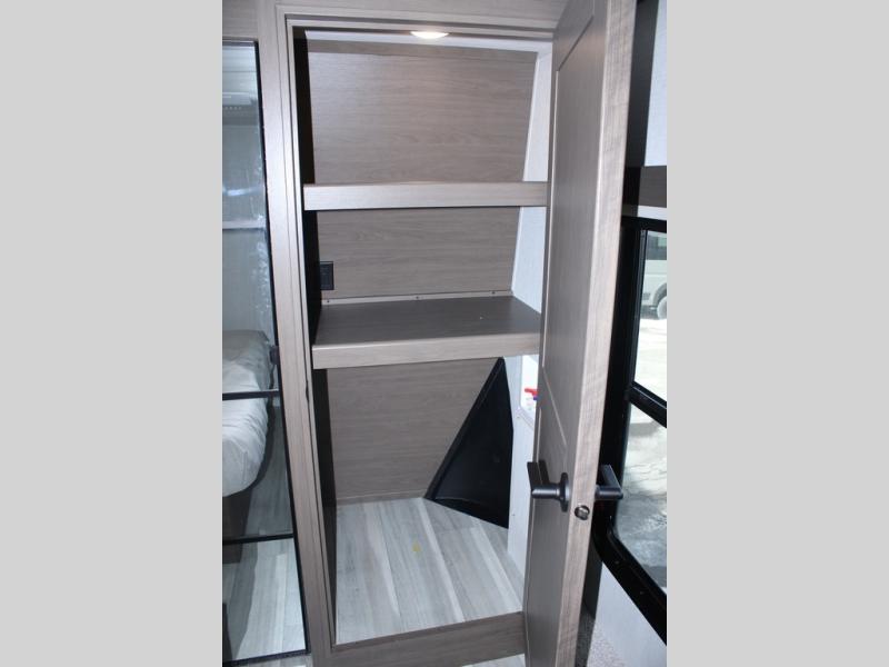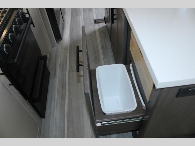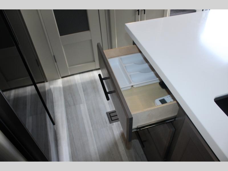 The dual opposing slides in the combined kitchen and living area will give you an open floorplan! You'll sleep on the queen-size bed in the front private bedroom, and there is under-bed storage, a full-height wardrobe, and a dresser with hidden storage for all of your personal belongings. As you spend time in the main living area, you'll appreciate having extra space thanks to the set of opposing slides, and the kitchen island will be easy to work around. You'll be able to relax on the tri-fold sleeper sofa and theater seating while you watch the LED HDTV with an pivoting entertainment door and hidden pantry. There is also a booth dinette with storage drawers, convenient shoe storage right as you enter the unit, and an exterior unobstructed pass-thru storage so nothing gets left behind.