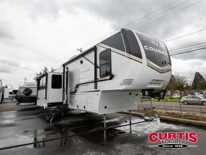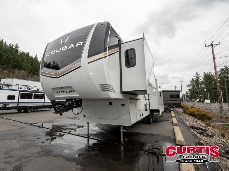 Spend more time having fun and less time worrying about your RV with the Keystone Cougar fifth wheel! These units have all that you will need for excellent vacations. The interior comes hardwood cabinet doors, solid surface kitchen countertops, an Oxygenics shower head and hose, plus a Vent-All window system. You will also appreciate the 12V charging stations throughout, the dual zone Bluetooth audio system, and the on-demand water heater for added comfort. The exterior is also fully outfitted with a convenience center, MaxTurn technology, Lippert axles with anti-lock braking system, and a Curt Road Armor shock absorbing equalizer for smooth towing. Each model is available with the optional Hero Edition. By choosing this edition, you can help support our nation's heros and their families by contributing to the Wounded Warrior Project. This optional package features an industry exclusive full-body paint matte finish, frameless windows, a glass entry door, blackout rims, and green LED exterior accent lighting; see dealer for more details!