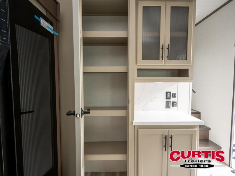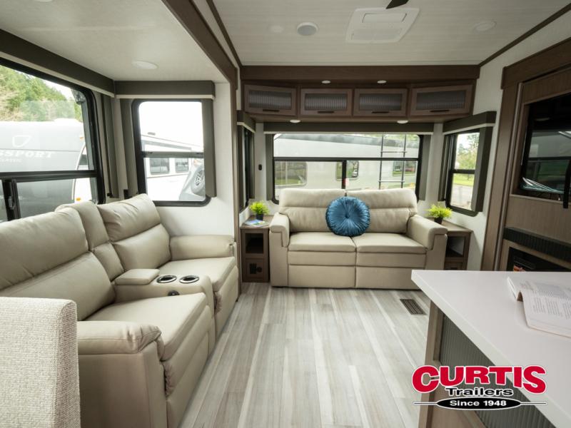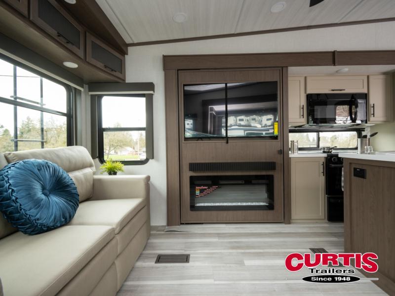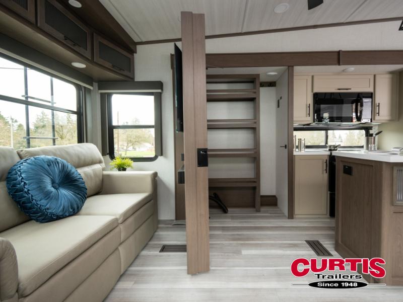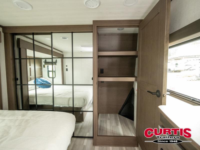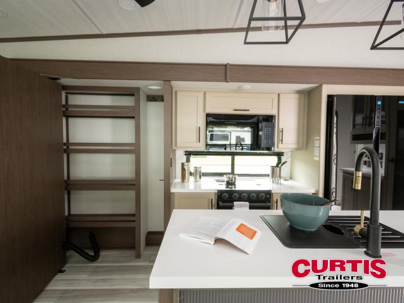 The dual opposing slides in the combined kitchen and living area will give you an open floorplan! You'll sleep on the queen-size bed in the front private bedroom, and there is under-bed storage, a full-height wardrobe, and a dresser with hidden storage for all of your personal belongings. As you spend time in the main living area, you'll appreciate having extra space thanks to the set of opposing slides, and the kitchen island will be easy to work around. You'll be able to relax on the tri-fold sleeper sofa and theater seating while you watch the LED HDTV with an pivoting entertainment door and hidden pantry. There is also a booth dinette with storage drawers, convenient shoe storage right as you enter the unit, and an exterior unobstructed pass-thru storage so nothing gets left behind.