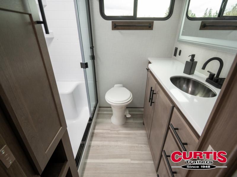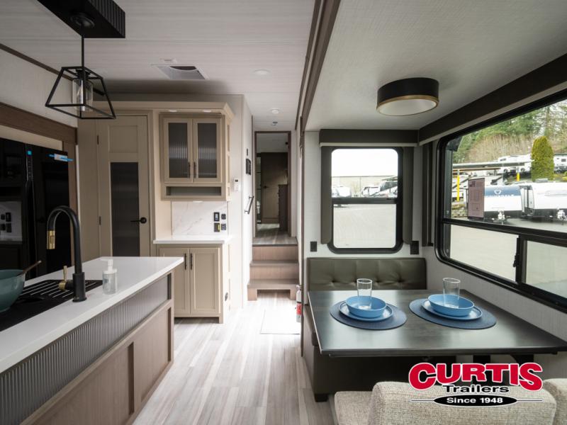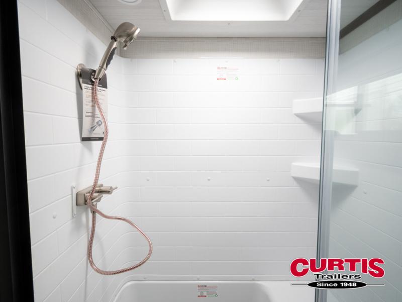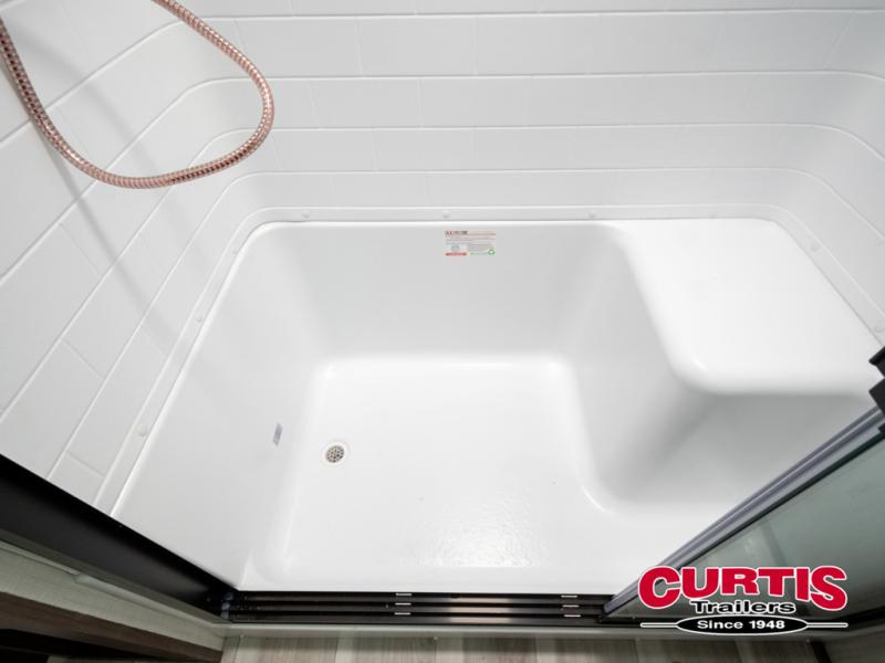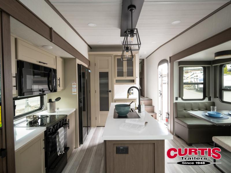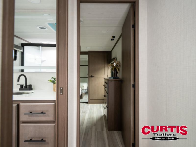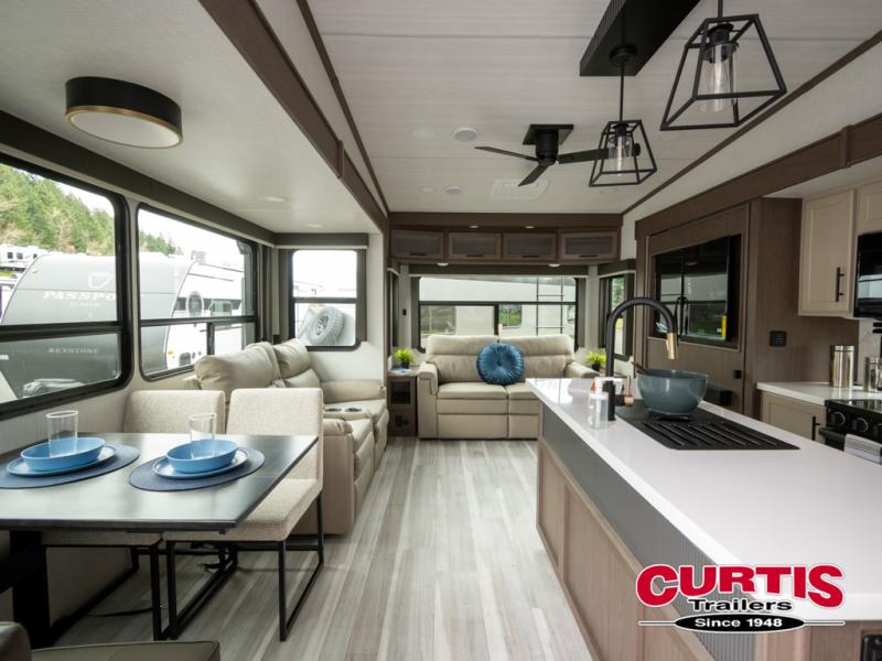 The dual opposing slides in the combined kitchen and living area will give you an open floorplan! You'll sleep on the queen-size bed in the front private bedroom, and there is under-bed storage, a full-height wardrobe, and a dresser with hidden storage for all of your personal belongings. As you spend time in the main living area, you'll appreciate having extra space thanks to the set of opposing slides, and the kitchen island will be easy to work around. You'll be able to relax on the tri-fold sleeper sofa and theater seating while you watch the LED HDTV with an pivoting entertainment door and hidden pantry. There is also a booth dinette with storage drawers, convenient shoe storage right as you enter the unit, and an exterior unobstructed pass-thru storage so nothing gets left behind.