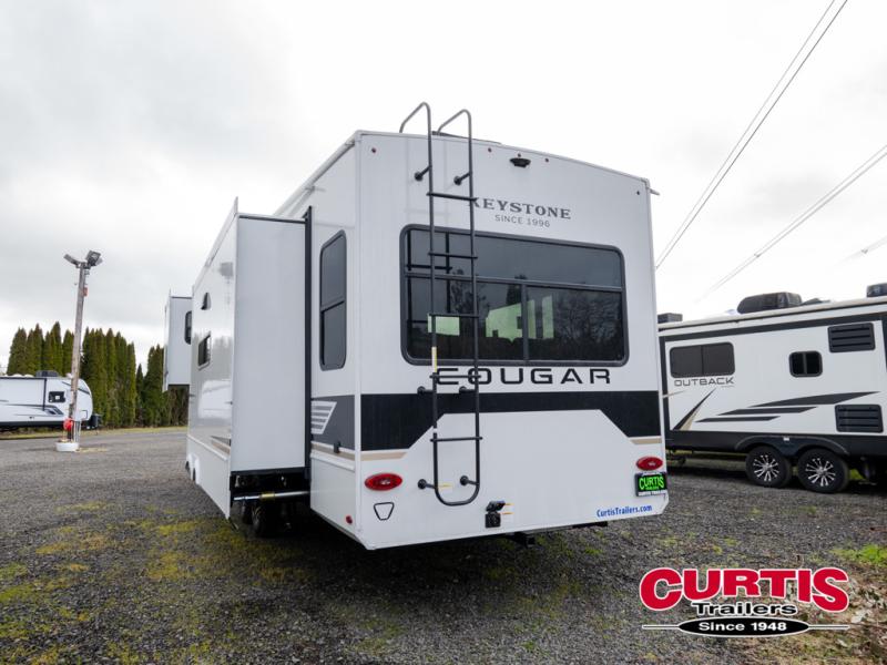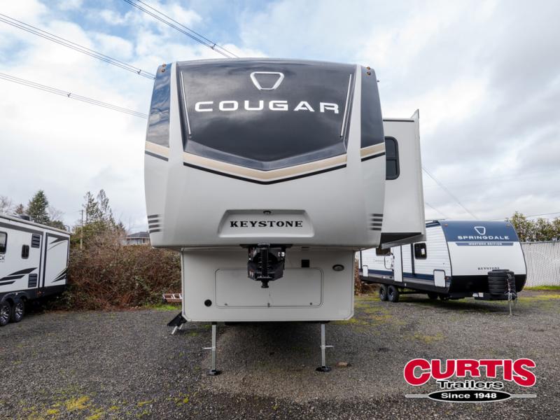 Spend more time having fun and less time worrying about your RV with the Keystone Cougar fifth wheel! These units have all that you will need for excellent vacations. The interior comes hardwood cabinet doors, solid surface kitchen countertops, an Oxygenics shower head and hose, plus a Vent-All window system. You will also appreciate the 12V charging stations throughout, the dual zone Bluetooth audio system, and the on-demand water heater for added comfort. The exterior is also fully outfitted with a convenience center, MaxTurn technology, Lippert axles with anti-lock braking system, and a Curt Road Armor shock absorbing equalizer for smooth towing. Each model is available with the optional Hero Edition. By choosing this edition, you can help support our nation's heros and their families by contributing to the Wounded Warrior Project. This optional package features an industry exclusive full-body paint matte finish, frameless windows, a glass entry door, blackout rims, and green LED exterior accent lighting; see dealer for more details!