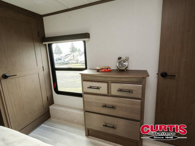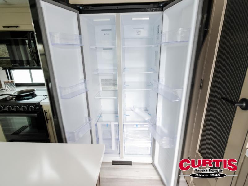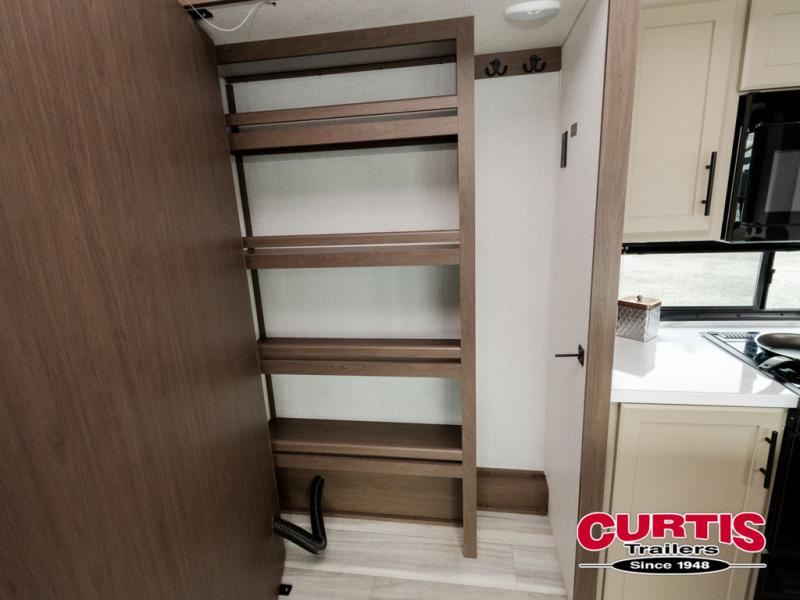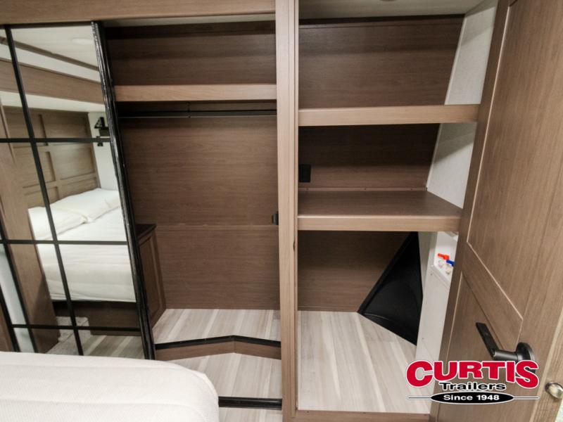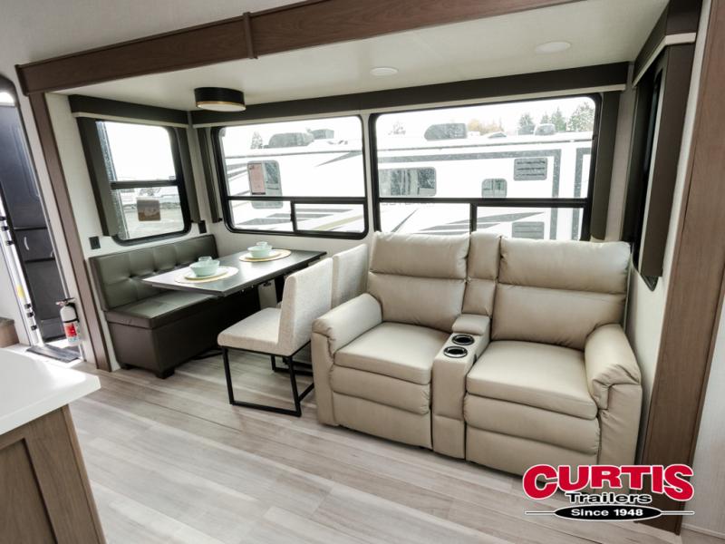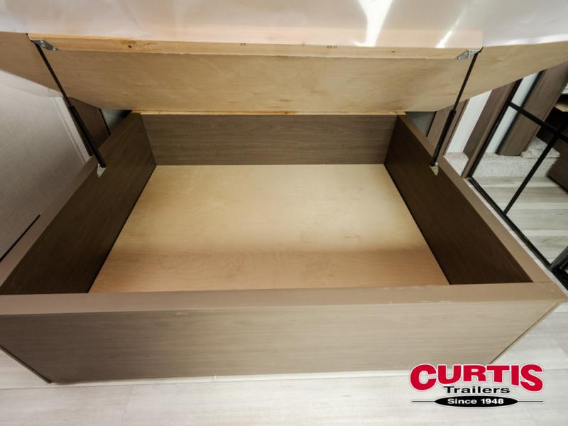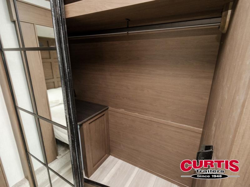 The dual opposing slides in the combined kitchen and living area will give you an open floorplan! You'll sleep on the queen-size bed in the front private bedroom, and there is under-bed storage, a full-height wardrobe, and a dresser with hidden storage for all of your personal belongings. As you spend time in the main living area, you'll appreciate having extra space thanks to the set of opposing slides, and the kitchen island will be easy to work around. You'll be able to relax on the tri-fold sleeper sofa and theater seating while you watch the LED HDTV with an pivoting entertainment door and hidden pantry. There is also a booth dinette with storage drawers, convenient shoe storage right as you enter the unit, and an exterior unobstructed pass-thru storage so nothing gets left behind.