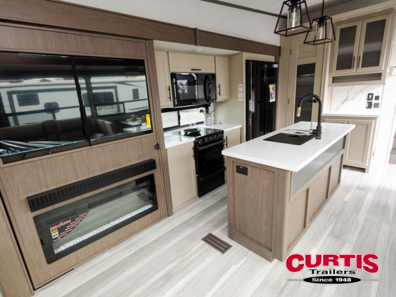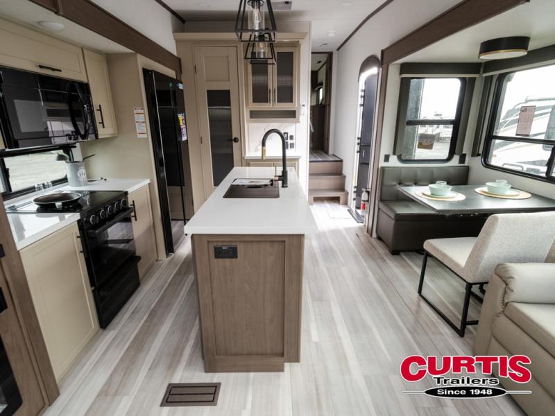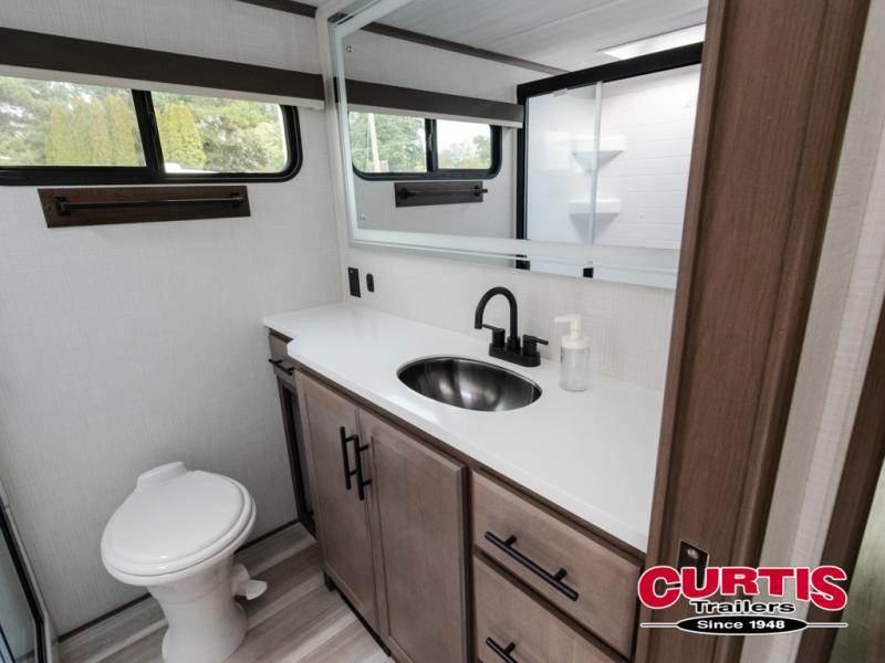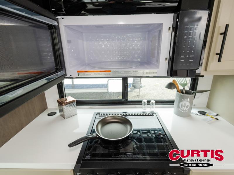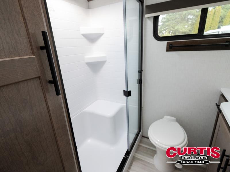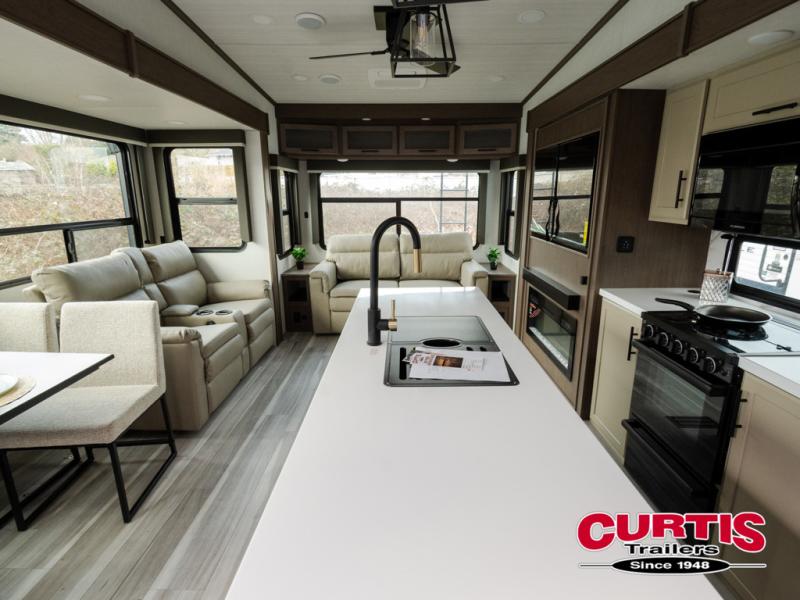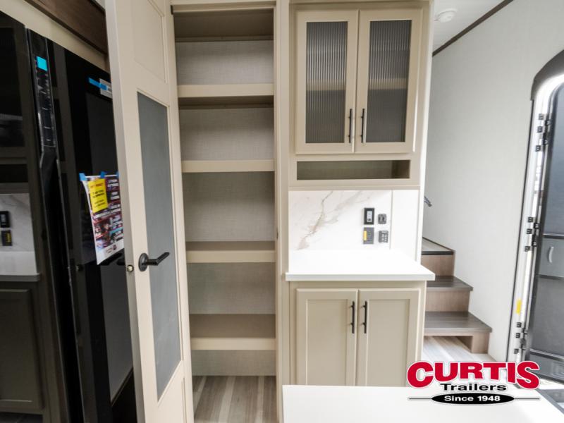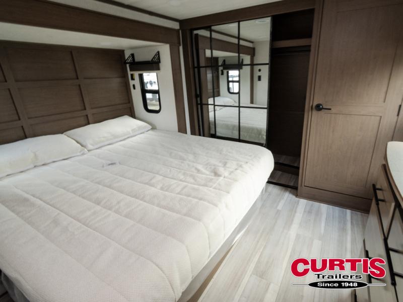 The dual opposing slides in the combined kitchen and living area will give you an open floorplan! You'll sleep on the queen-size bed in the front private bedroom, and there is under-bed storage, a full-height wardrobe, and a dresser with hidden storage for all of your personal belongings. As you spend time in the main living area, you'll appreciate having extra space thanks to the set of opposing slides, and the kitchen island will be easy to work around. You'll be able to relax on the tri-fold sleeper sofa and theater seating while you watch the LED HDTV with an pivoting entertainment door and hidden pantry. There is also a booth dinette with storage drawers, convenient shoe storage right as you enter the unit, and an exterior unobstructed pass-thru storage so nothing gets left behind.