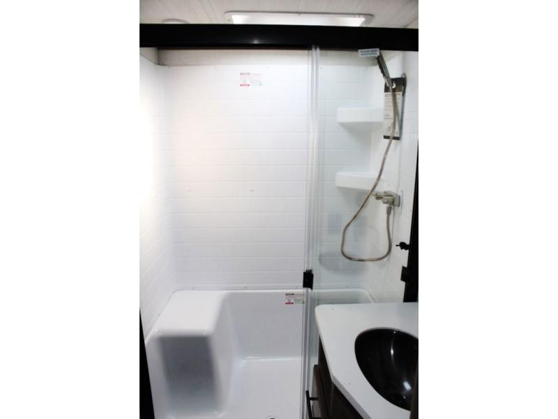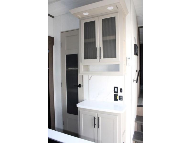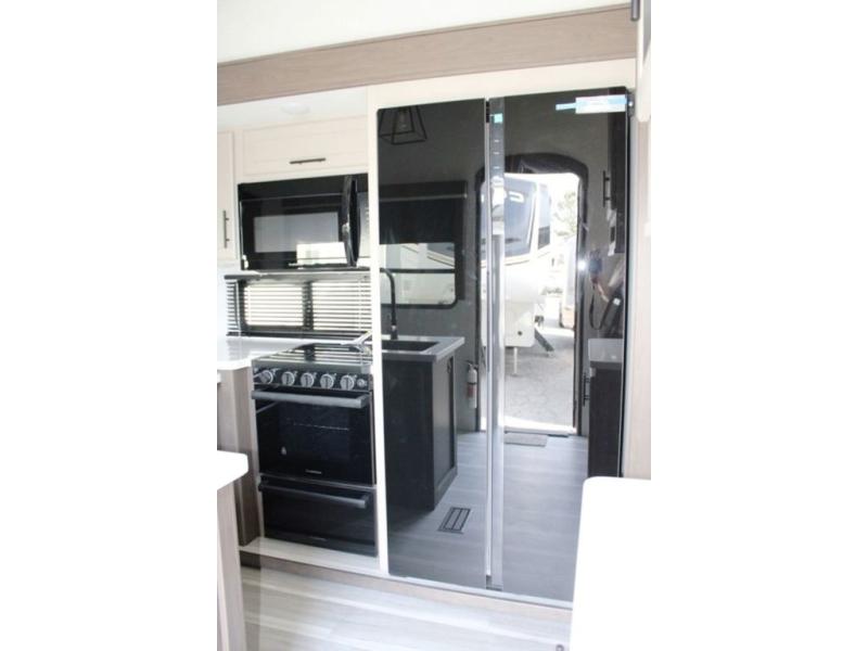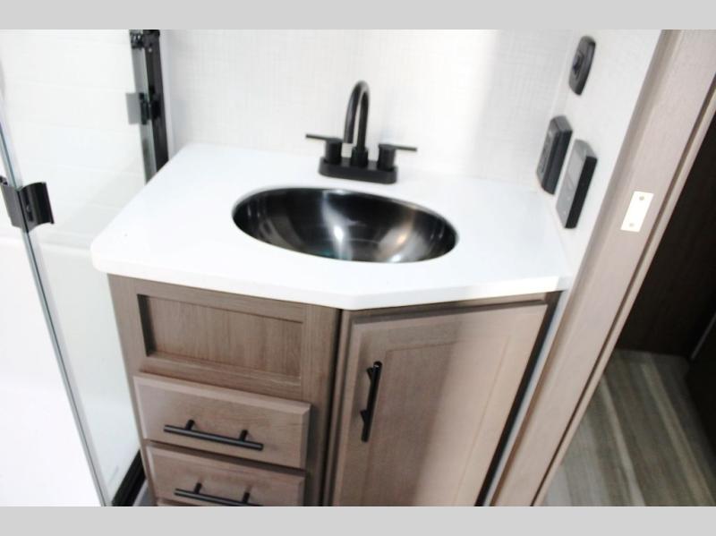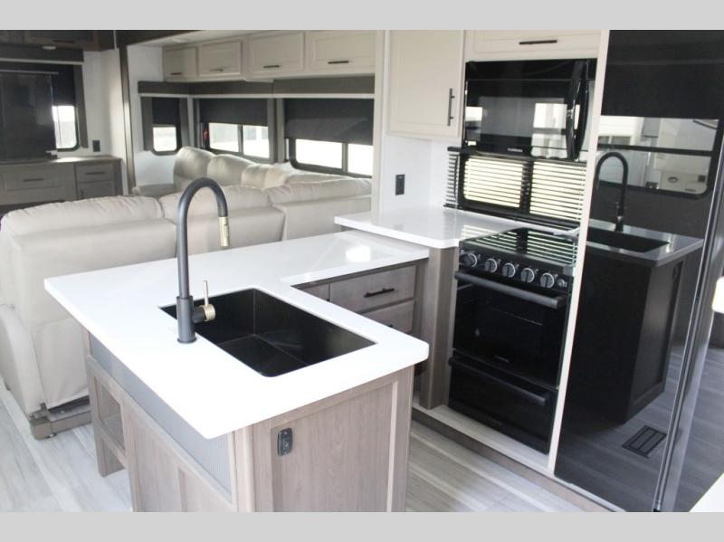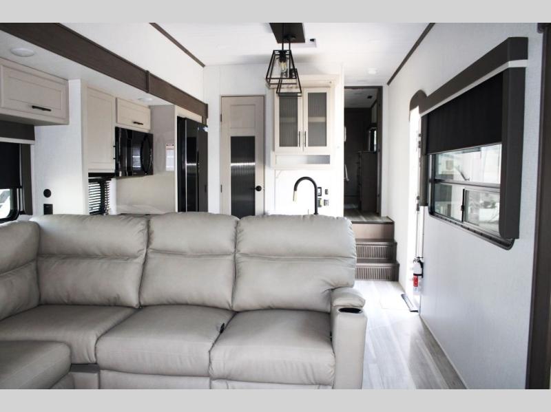 Time at the campground will be spent in comfort thanks to this fifth wheel that can sleep four to six people comfortably. The rear living area/den includes a huge L-shaped sofa with theater seats and a king tri-fold sofa, plus a free-standing dinette with an ottoman on one side, a fireplace, and an LED HDTV for movie nights. The chef of your group will love the additional counter space in the kitchen, along with a 21" Furrion range, plus a pantry and 16 cu. ft. 12V refrigerator. The full bath allows you to clean up each day and the front private bedroom will provide you with your own space at night. Here, you'll find a queen bed slide out that can optioned out for a king bed, plus a full height wardrobe, a second wardrobe with washer and dryer prep, and a dresser with a sliding top and hidden storage for valuables!