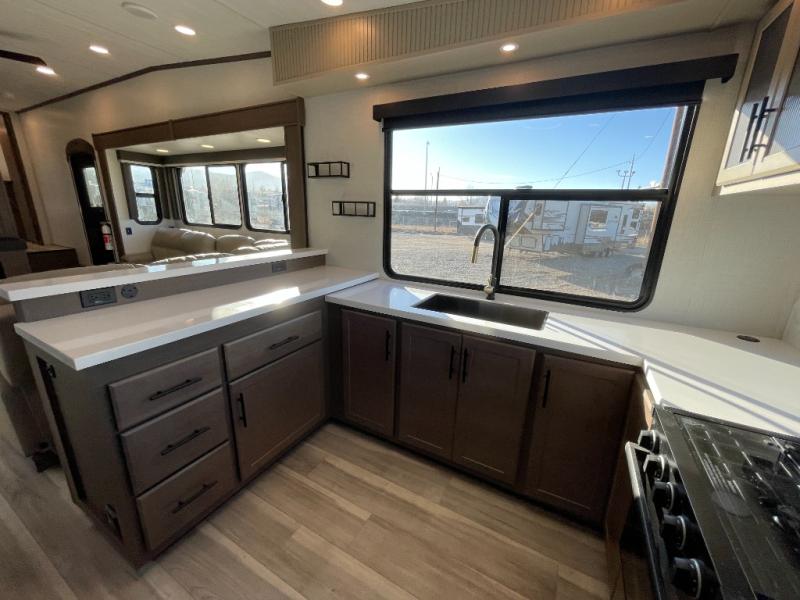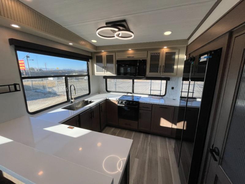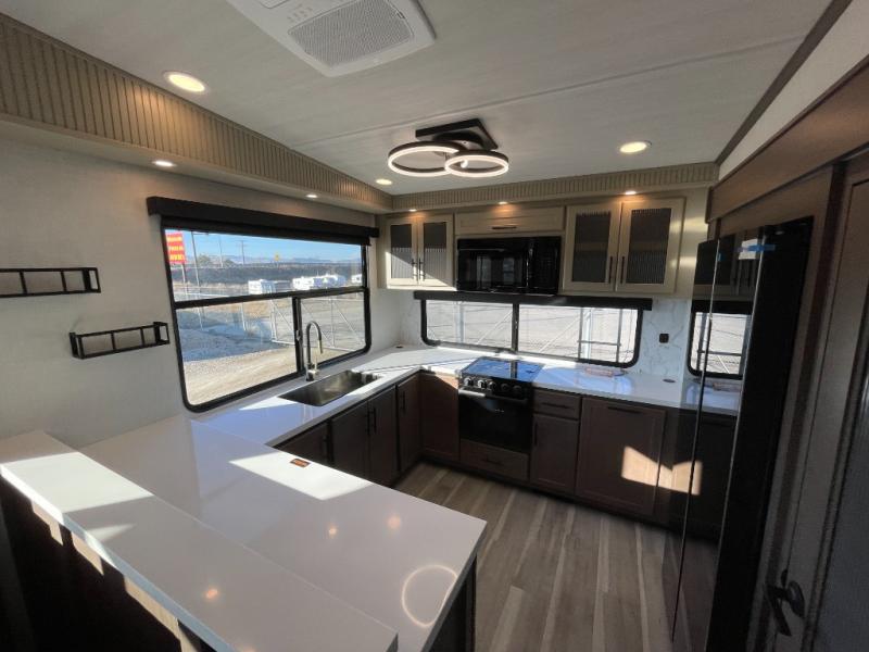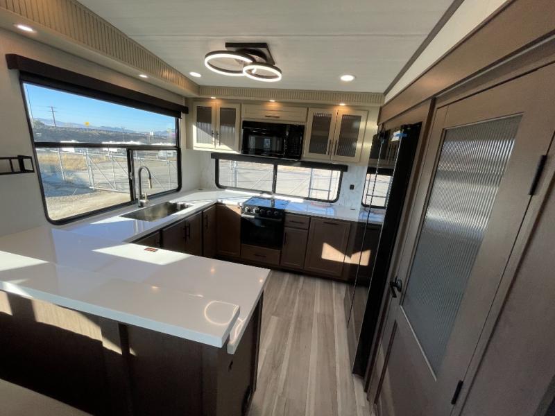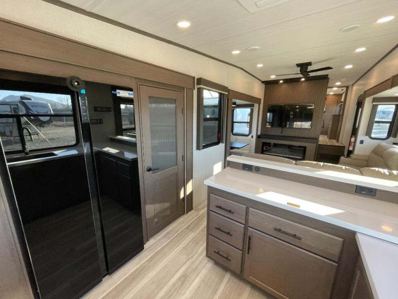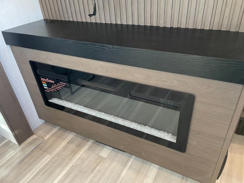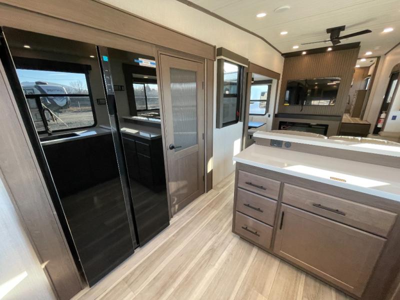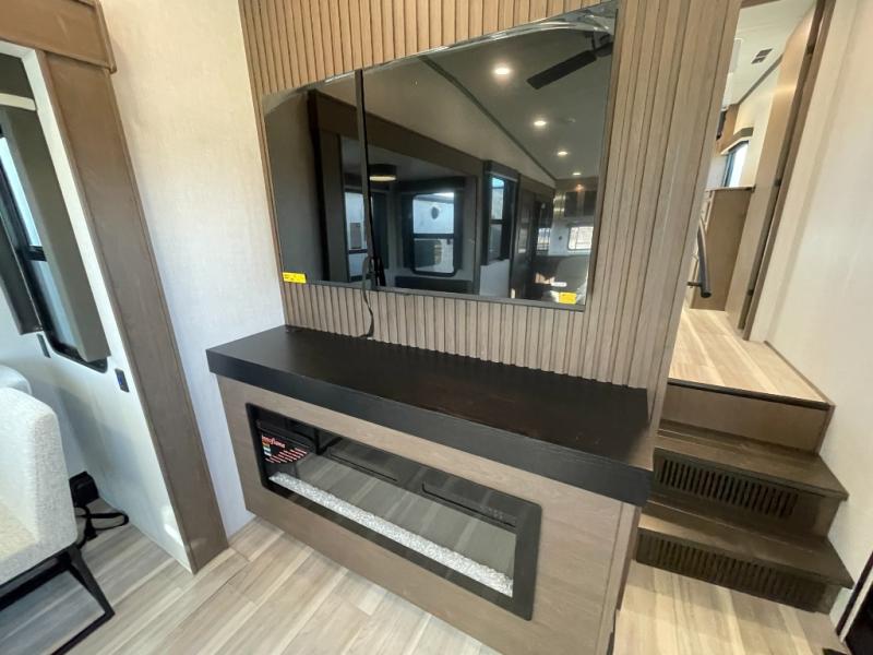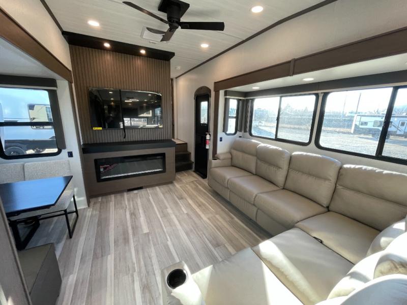 Luxury is the name of the game with this spacious fifth wheel! The chef of your group will love the rear luxury kitchen with wrap-around counter space, a large sink, dishwasher prep, and all the appliances needed to cook and store meals. After dinner, your crew can relax in the middle living room on the L-shaped sofa or play a game at the dinette with bench seating on one side and chairs on the other. There is also a 12V ceiling fan here, along with a fireplace and a TV for movie nights! The spacious full bath includes a shower with a seat plus a large vanity counter to easily get ready each day, and you're going to love the front private bedroom with a queen bed slide out. There is also a full height wardrobe here, along with a pull-out laundry center, underbed storage, plus stackable washer and dryer prep!