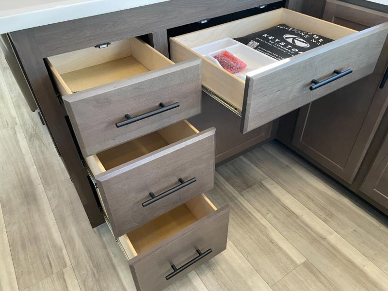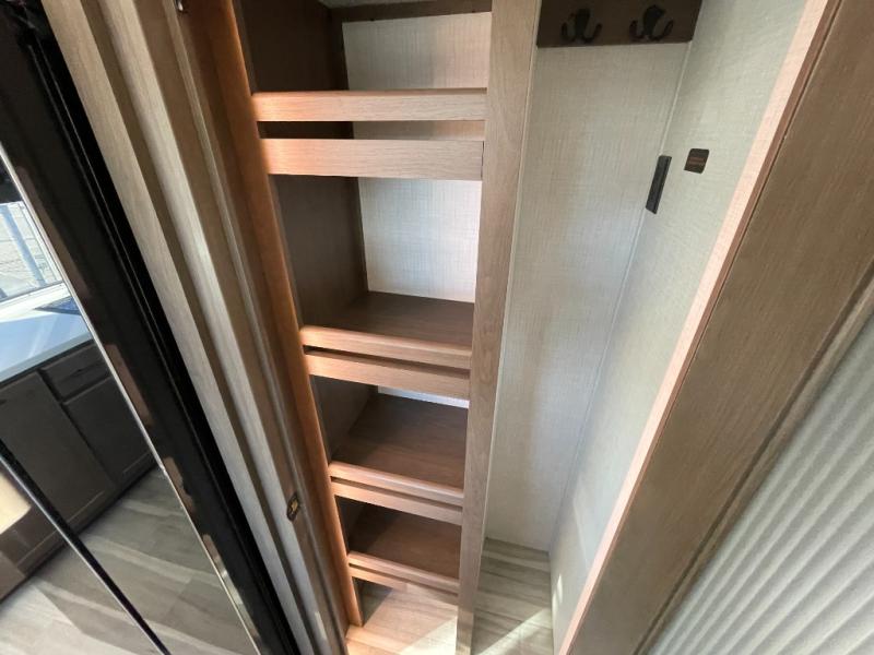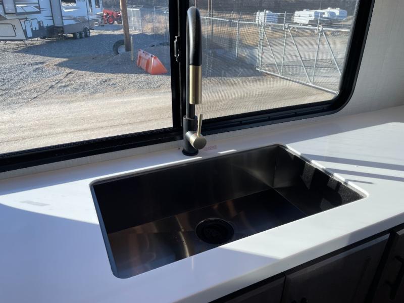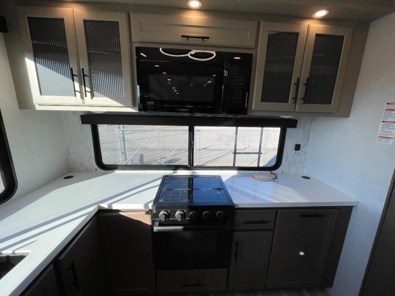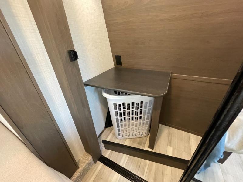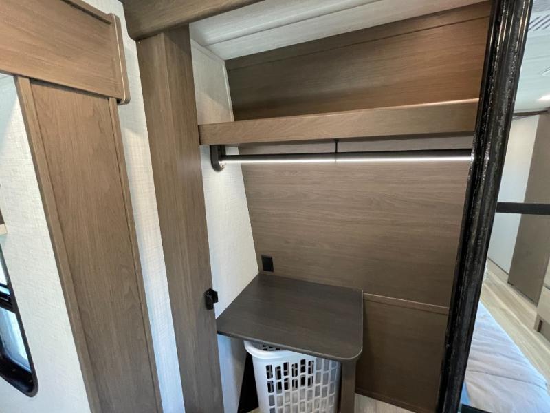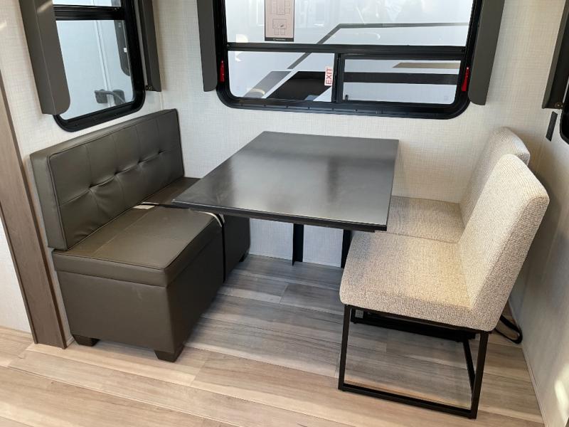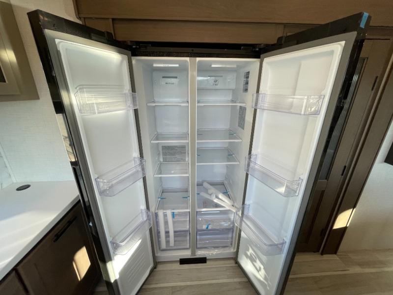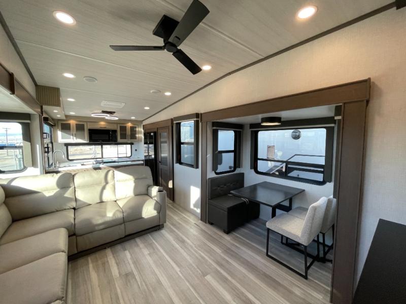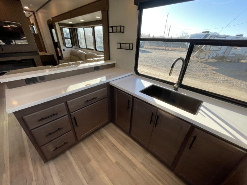 Luxury is the name of the game with this spacious fifth wheel! The chef of your group will love the rear luxury kitchen with wrap-around counter space, a large sink, dishwasher prep, and all the appliances needed to cook and store meals. After dinner, your crew can relax in the middle living room on the L-shaped sofa or play a game at the dinette with bench seating on one side and chairs on the other. There is also a 12V ceiling fan here, along with a fireplace and a TV for movie nights! The spacious full bath includes a shower with a seat plus a large vanity counter to easily get ready each day, and you're going to love the front private bedroom with a queen bed slide out. There is also a full height wardrobe here, along with a pull-out laundry center, underbed storage, plus stackable washer and dryer prep!