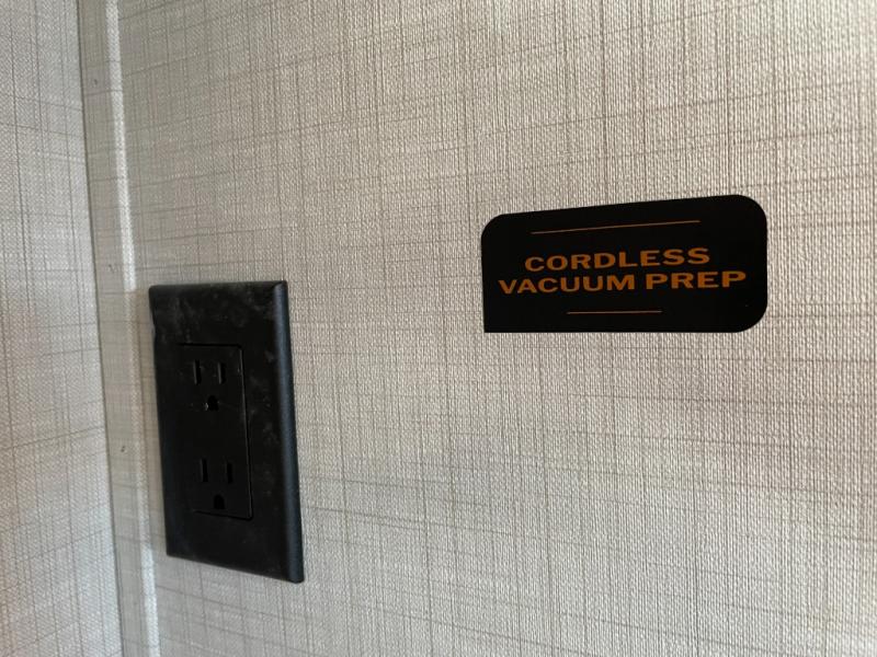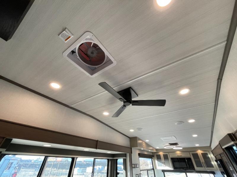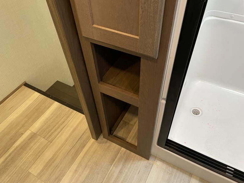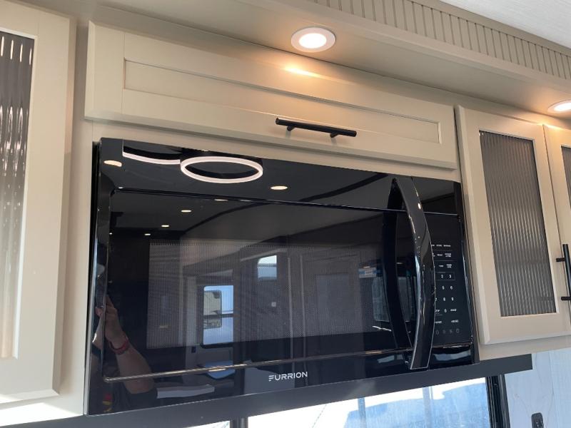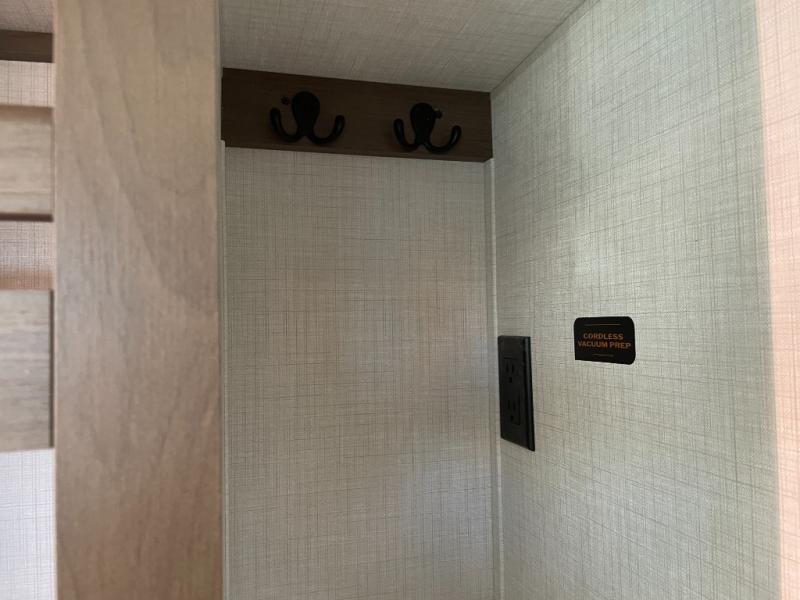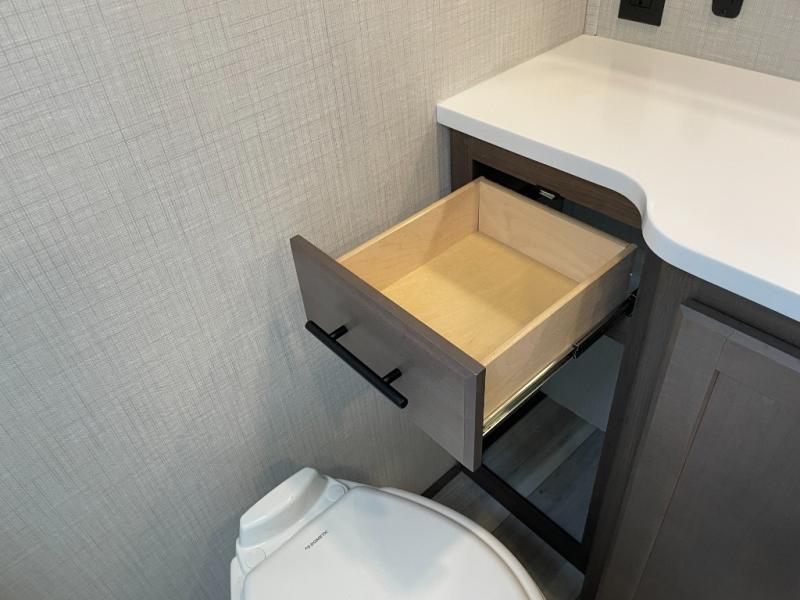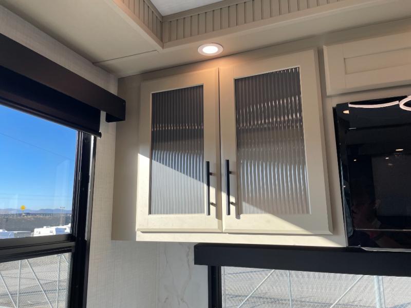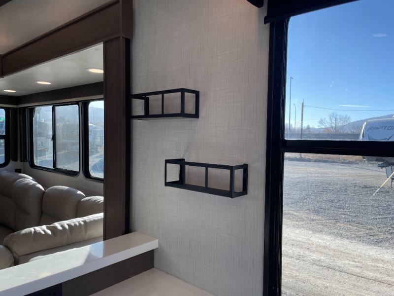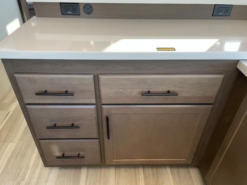 Luxury is the name of the game with this spacious fifth wheel! The chef of your group will love the rear luxury kitchen with wrap-around counter space, a large sink, dishwasher prep, and all the appliances needed to cook and store meals. After dinner, your crew can relax in the middle living room on the L-shaped sofa or play a game at the dinette with bench seating on one side and chairs on the other. There is also a 12V ceiling fan here, along with a fireplace and a TV for movie nights! The spacious full bath includes a shower with a seat plus a large vanity counter to easily get ready each day, and you're going to love the front private bedroom with a queen bed slide out. There is also a full height wardrobe here, along with a pull-out laundry center, underbed storage, plus stackable washer and dryer prep!