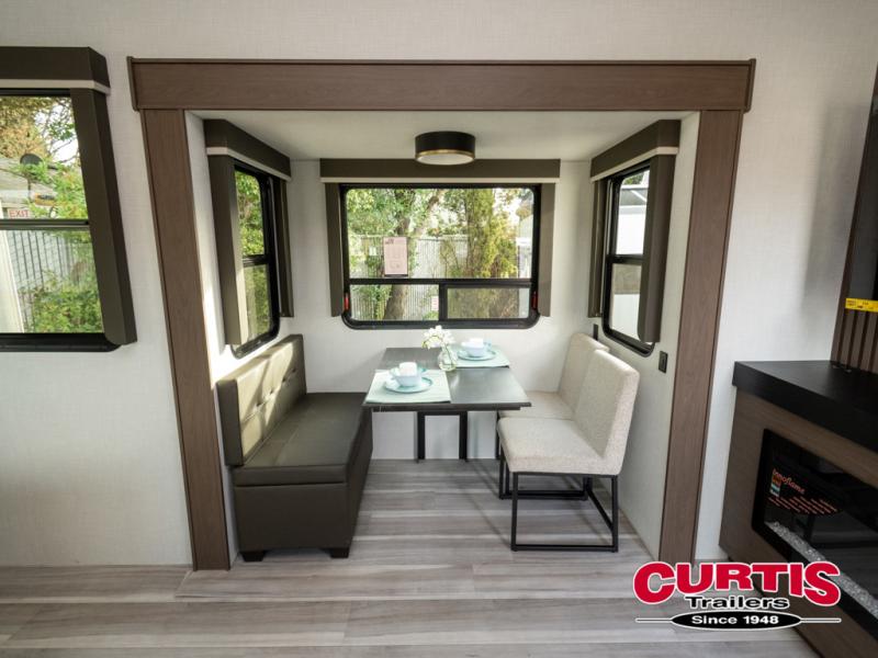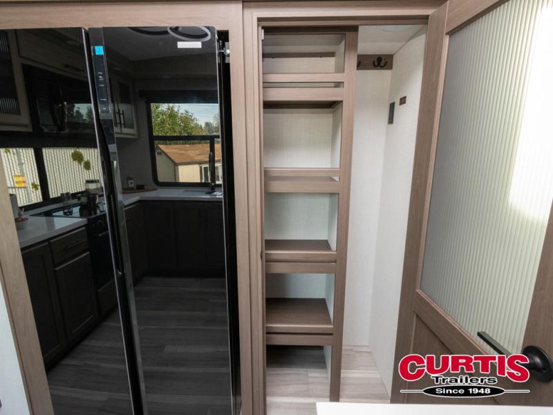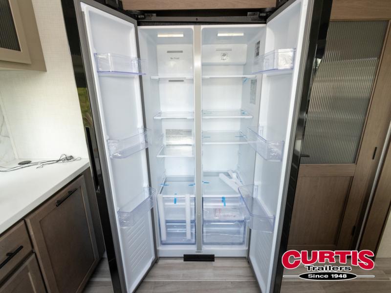 Luxury is the name of the game with this spacious fifth wheel! The chef of your group will love the rear luxury kitchen with wrap-around counter space, a large sink, dishwasher prep, and all the appliances needed to cook and store meals. After dinner, your crew can relax in the middle living room on the L-shaped sofa or play a game at the dinette with bench seating on one side and chairs on the other. There is also a 12V ceiling fan here, along with a fireplace and a TV for movie nights! The spacious full bath includes a shower with a seat plus a large vanity counter to easily get ready each day, and you're going to love the front private bedroom with a queen bed slide out. There is also a full height wardrobe here, along with a pull-out laundry center, underbed storage, plus stackable washer and dryer prep!