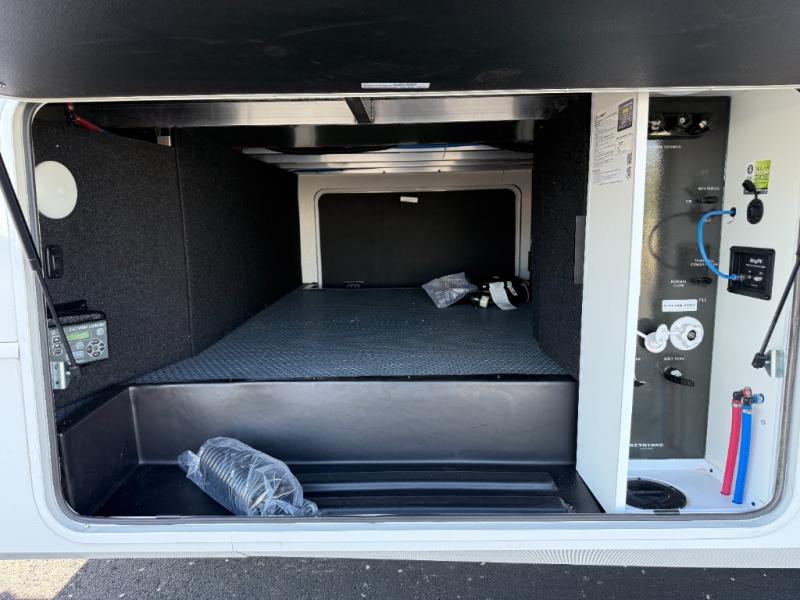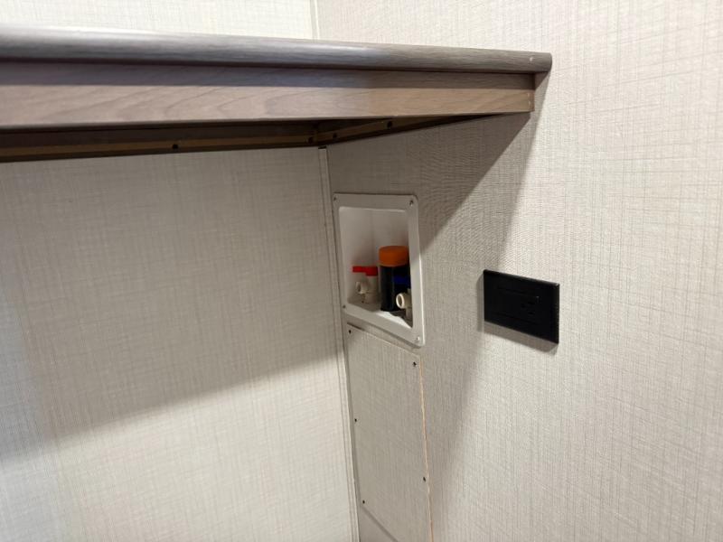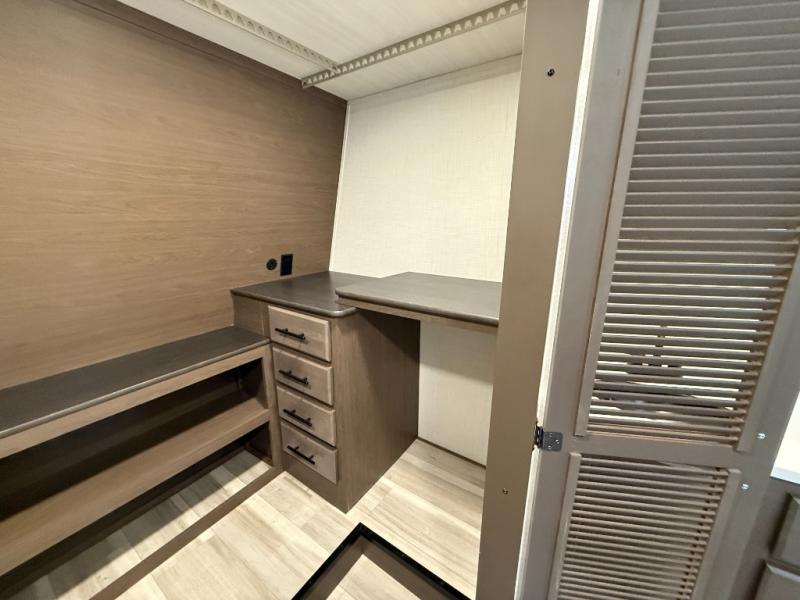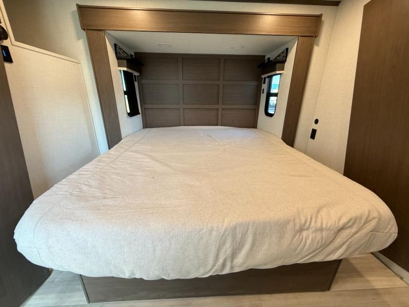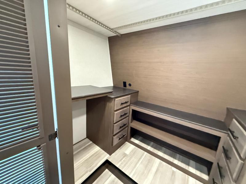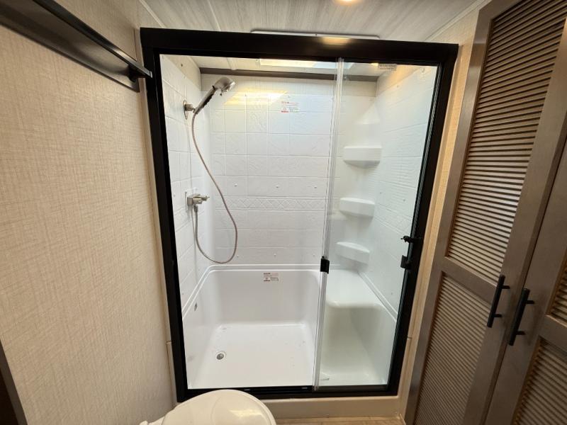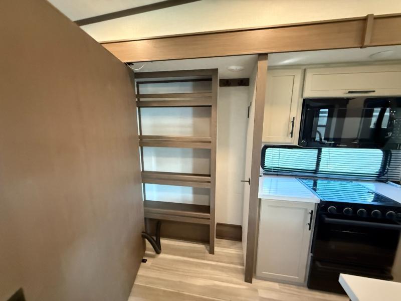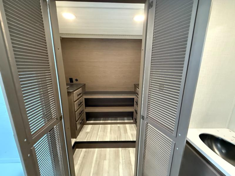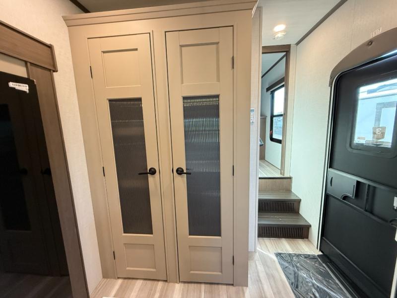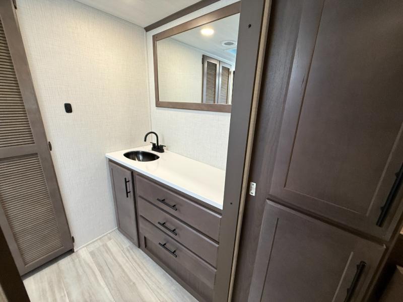 You will be so excited to take this Cougar fifth wheel out for the first time! Because of its secluded and fully stocked master suite at the front, this unit is perfect for a couple who wants to see the country or visit family. The master bathroom has a wonderful walk-in closet that has shoe storage, drawers, and preparations for a washer/dryer. There is also under-bed storage in the bedroom portion, and the queen bed slide gives you a little more space to get to the dresser and linen closet. The half bathroom is located out in the main living area so that your friends will have a place to go when they visit. Opposing slides keep this living area open for lounging comfortably on the tri-fold sleeper sofa and theater seating, and you can get everyone together for a board game at the booth dinette with storage drawers. There is also a pivoting entertainment door with a hidden pantry and cordless vacuum prep behind; how convenient!