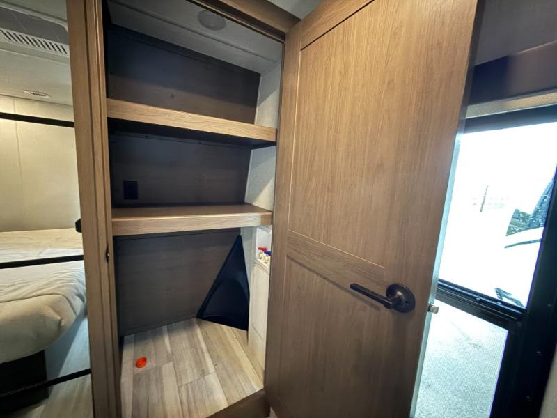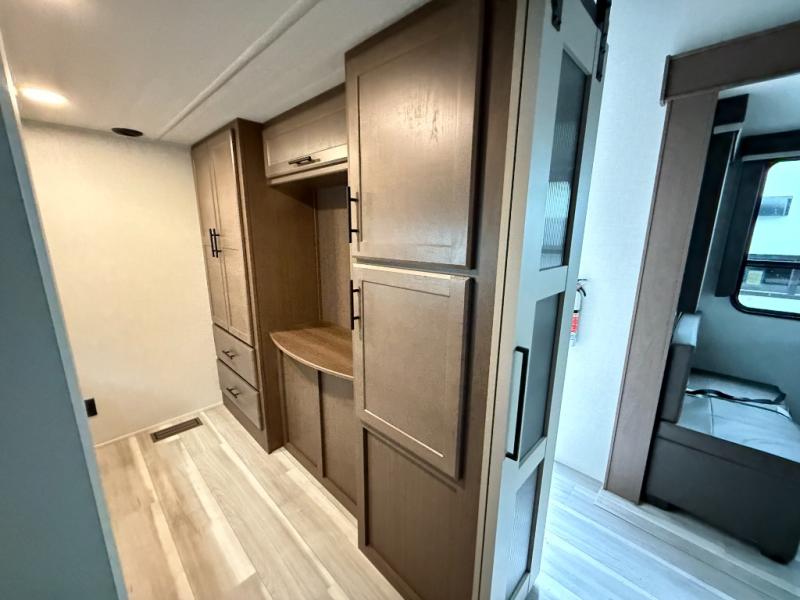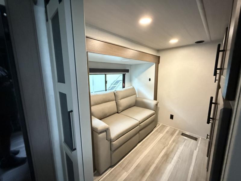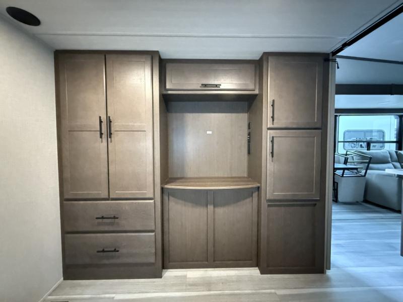 You'll love having an extra room that you can decide what to do with on this Cougar fifth wheel! There is a tri-fold sleeper sofa here, a desk plus two wardrobes for storage. Above this room is a loft which adds more sleeping space without taking up precious interior living space. And speaking of space, you'll find more of it in the main living area when you push out the opposing slides. A second tri-fold sleeper sofa sits in the living area, and there is also theater seating that you can rest on in front of the entertainment center with a hidden pantry. The full bathroom has a linen closet for your towels and washcloths, and there is also great storage in the front private bedroom with the under-bed storage, dresser with a sliding top, and a full-height wardrobe. Outside, you'll find two power awnings, an unobstructed pass-thru storage, and an outdoor kitchen prep area!