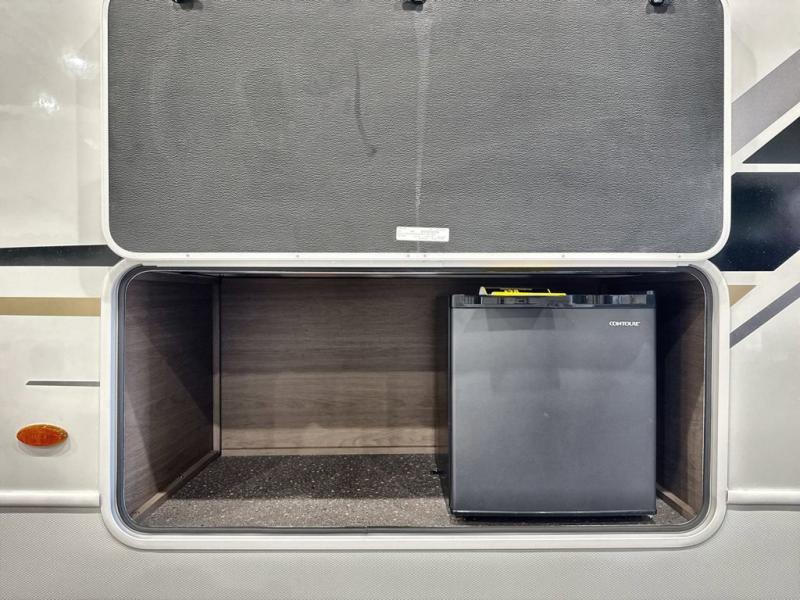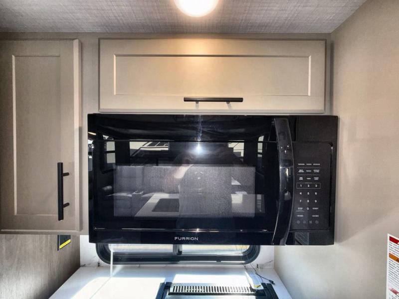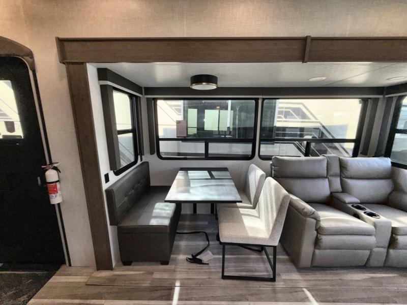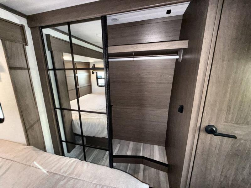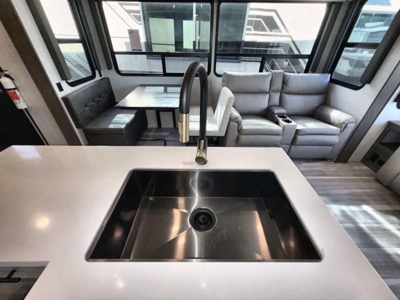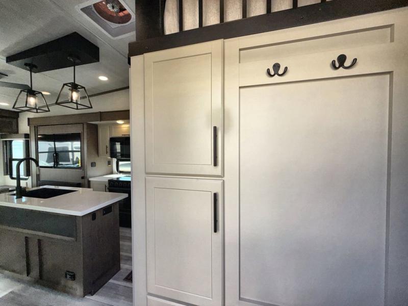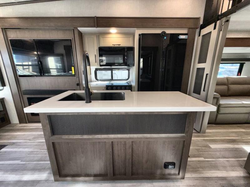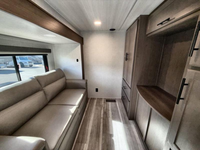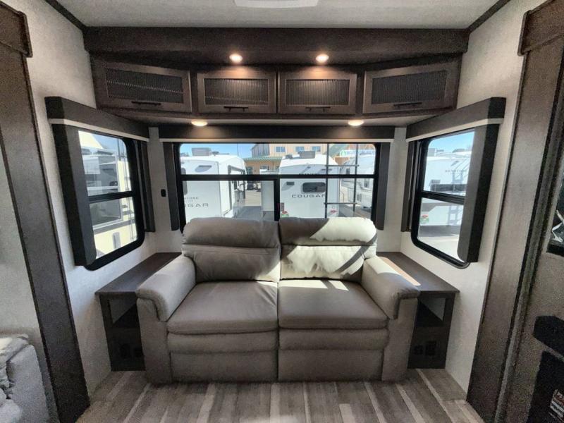 You'll love having an extra room that you can decide what to do with on this Cougar fifth wheel! There is a tri-fold sleeper sofa here, a desk plus two wardrobes for storage. Above this room is a loft which adds more sleeping space without taking up precious interior living space. And speaking of space, you'll find more of it in the main living area when you push out the opposing slides. A second tri-fold sleeper sofa sits in the living area, and there is also theater seating that you can rest on in front of the entertainment center with a hidden pantry. The full bathroom has a linen closet for your towels and washcloths, and there is also great storage in the front private bedroom with the under-bed storage, dresser with a sliding top, and a full-height wardrobe. Outside, you'll find two power awnings, an unobstructed pass-thru storage, and an outdoor kitchen prep area!